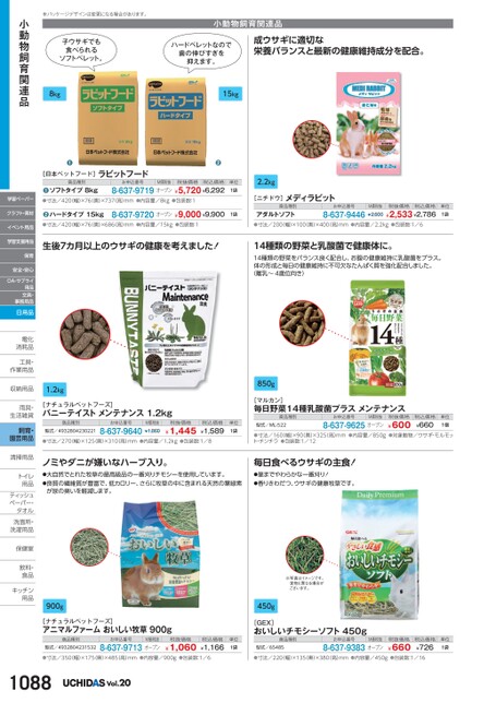 ※パッケージデザインは変更になる場合があります。小動物飼育関連品子ウサギでも食べられるソフトペレット。ハードペレットなので歯の伸びすぎを抑えます。8kg15kg●●[日本ペットフード]ラビットフード商品種別お申込番号M価税抜ソフトタイプ8kg●●寸法/420(幅)×76(奥)×737(高)mm●内容量/8kg●包装数:18-637-9719オープン税抜価格税込価格¥5,720¥6,292ハードタイプ15kg●●寸法/420(幅)×76(奥)×686(高)mm●内容量/15kg●包装数:18-637-9720オープン¥9,000¥9,900単位1袋1袋成ウサギに適切な栄養バランスと最新の健康維持成分を配合。2.2kg[ニチドウ]メディラビット商品種別アダルトソフト●寸法/200(幅)×100(奥)×400(高)mm●内容量/2.2kg●包装数:1/68-637-9446¥2,533¥2,786お申込番号税抜価格税込価格M価税抜¥2,600単位1袋生後7カ月以上のウサギの健康を考えました!14種類の野菜と乳酸菌で健康体に。14種類の野菜をバランス良く配合し、お腹の健康維持に乳酸菌をプラス。体の形成と毎日の健康維持に不可欠なたんぱく質を強化配合しました。(離乳〜4歳位向き)小動物飼育関連品学習ペーパークラフト・素材イベント用品学習支援用品保育安全・安心OA・サプライ用品文具・事務用品日用品電化電化消耗品消耗品工具・工具作業用品作業用収納用品収納用1.2kg850g雨具・雨具生活雑貨生活雑飼育・園芸用品清掃用品清掃用トイレトイ用品用品ティッシュティッシュペーパー・タオルタオル洗面所・洗面所・洗濯用品洗濯用保健室保健室飲料・飲料食品食品キッチンキッチン用品用品[ナチュラルペットフーズ]バニーテイストメンテナンス1.2kg商品種別型式/4932804230221お申込番号8-637-9640M価税抜¥1,860税抜価格¥1,445税込価格¥1,589単位1袋●寸法/270(幅)×125(奥)×310(高)mm●内容量/1.2kg●包装数:1/8[マルカン]毎日野菜14種乳酸菌プラスメンテナンス商品種別型式/ML-522お申込番号M価税抜8-637-9625オープン税抜価格¥600税込価格¥660単位1個●寸法/160(幅)×90奥)×325高)mm●内容量/850g●対象動物/ウサギ・モルモット・チンチラ●包装数:1/12ノミやダニが嫌いなハーブ入り。●大自然でとれた牧草の最高級品の一番刈りチモシーを使用しています。●良質の繊維質が豊富で、低カロリー、さらに牧草の中に含まれる天然の葉緑素が尿の臭いを軽減します。毎日食べるウサギの主食!●茎までやわらかな一番刈り!●香りきわだつ、ウサギの健康牧草です。900g[ナチュラルペットフーズ]アニマルファームおいしい牧草900g商品種別型式/4932804231532お申込番号M価税抜8-637-9713オープン税抜価格¥1,060税込価格¥1,166単位1袋※写真はイメージです。実物と異なる場合がございます。450g[GEX]おいしいチモシーソフト450g商品種別型式/65485お申込番号M価税抜8-637-9383オープン税抜価格¥660税込価格¥726単位1袋●寸法/350(幅)×175(奥)×485(高)mm●内容量/900g●包装数:1/6●寸法/220(幅)×135(奥)×380(高)mm●内容量/450g●包装数:1/161088Vol.20