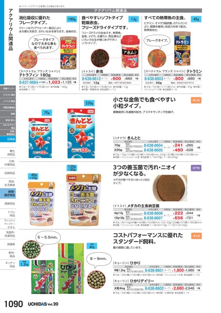 すべての熱帯魚の主食。ビタミン、オメガ3脂肪酸、βグルカンにより、健康を維持し免疫力を保つ配合。熱帯魚向き。45gフレークタイプ。アクアリウム関連品食べやすいソフトタイプ乾燥赤虫。フリーズドライタイプです。12gフリーズドライの赤虫です。熱帯魚、金魚、メダカ、水棲カメ、両生類などいろいろな生き物にあげやすいソフトタイプ。※パッケージデザインは変更になる場合があります。消化吸収に優れたフレークタイプ。180gクリーン&クリアウォーター製法により水の悪化を防ぎ、きれいな水を保ちます。金魚向き。フレークタイプなので大きな魚も食べられます。アクアリウム関連品[スペクトラムブランズジャパン]テトラフィン180gお申込番号M価税抜税抜価格税込価格8-637-9684¥1,320¥1,023¥1,125単位1個[イトスイ]赤虫お申込番号M価税抜8-638-8612オープン商品種別12g税抜価格¥600税込価格¥660型式/4971453053683単位1個[スペクトラムブランズジャパン]テトラミンお申込番号M価税抜8-638-8603オープン商品種別45g税抜価格¥800税込価格¥880型式/4004218319110単位1個学習ペーパークラフト・素材イベント用品学習支援用品保育安全・安心OA・サプライ用品文具・事務用品日用品電化電化消耗品消耗品工具・工具作業用品作業用収納用品収納用雨具・雨具生活雑貨生活雑飼育・園芸用品清掃用品清掃用トイレトイ用品用品ティッシュティッシュペーパー・タオルタオル洗面所・洗面所・洗濯用品洗濯用保健室保健室飲料・飲料食品食品キッチンキッチン用品用品●寸法/91(径)×178(高)mm●内容量/180g●包装数:1/12●寸法/69(径)×118(高)mm●内容量/12g●材質/乾燥赤虫●包装数:1/12●寸法/59(径)×117(高)mm●内容量/45g●材質/フィッシュフード他●包装数:1/6220g小さな金魚でも食べやすい小粒タイプ。健康維持に乳酸菌を配合、アスタキサンチンで色揚げ。浮上性70g[ニチドウ]きんととお申込番号商品種別型式/4975677050237型式/497567705024470g220g●寸法/70g:110(幅)×50(奥)×185(高)mm、220g:130(幅)×60(奥)×230(高)mm●材質/フィッシュミール他●包装数:1/5070g)、1/30220g)8-638-8604オープン8-638-8605¥241¥480税込価格¥265¥528税抜価格M価税抜単位1個120g+30g40g+10g3つの善玉菌で汚れ・ニオイが少なくなる。メダカが食べやすいゆっくり沈むタイプ。沈下性5〜5.5mm。中粒1.2kg大粒4kg8〜9mm。[イトスイ]メダカの主食納豆菌お申込番号商品種別型式/4971453054277型式/497145305434540g+10g120g+30g●寸法/40+10g:94幅)×40奥)×155高)mm、120+30g:120幅)×57(奥)×180高)mm●材質/フィッシュミール他●包装数:1/4840+10g)、1/50(120+30g)8-638-8606オープン8-638-8607¥222¥656税込価格¥244¥721税抜価格M価税抜単位1個コストパフォーマンスに優れたスタンダード飼料。鯉の観察に適しています。浮上性[キョーリン]ひかり商品種別型式/4971618013675中粒1.2kg●寸法/200(幅)×100(奥)×300(高)mm●材質/フィッシュミール他●包装数:1/108-638-8601オープン¥1,800¥1,980お申込番号M価税抜税抜価格税込価格単位1個1090Vol.20[キョーリン]ひかりデイリー商品種別型式/4971618384782大粒4kg●寸法/240(幅)×150(奥)×580(高)mm●材質/小麦粉他●包装数:1/48-638-8602オープン¥2,680¥2,948お申込番号M価税抜税抜価格税込価格単位1個