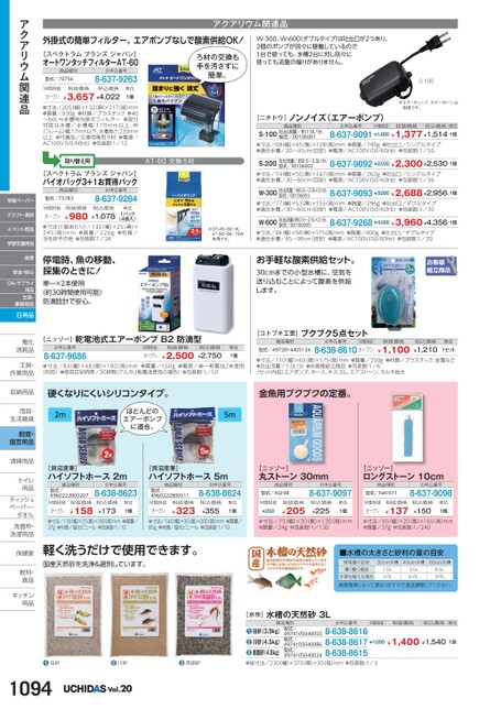 ■水槽の大きさと砂利の量の目安使用量の目安薄く敷く場合30cm水槽45cm水槽60cm水槽1.0L3.0L3.0L6.0L6.0L9.0L水草を植える場合飼育環境によって異なりますので適宜調整してください。M価税抜税抜価格税込価格単位¥1,500¥1,400¥1,5401袋お申込番号8-638-86168-638-86178-638-8615商品種別497410504005549741050400864974105040024珪砂(3.9kg)型式/川砂(4.5kg)型式/南国砂(4.8kg)型式/●●●[水作]水槽の天然砂3L●袋寸法/230(幅)×370(奥)×30(高)mm●包装数:1/3アクアリウム関連品外掛式の簡単フィルター。エアポンプなしで酸素供給OK!ろ材の交換も手を汚さずに簡単。※OT-45・60・W、AT-50・60・75W共用です。[スペクトラムブランズジャパン]オートワンタッチフィルターAT-60商品種別型式/70756お申込番号8-637-9263M価税抜オープン税抜価格税込価格¥3,657¥4,022単位1個●寸法/205(幅)×132(奥)×217高)mm●質量/930g●材質/プラスチック●40〜60cm水槽用外掛式フィルター●取付可能な水槽/水槽幅:170mm以上、枠(フレーム)幅:17mm以下、水槽高さ:230mm以上●付属品/交換用専用ろ材●電源/AC100V(50/60Hz)●包装数:1/12取り替え用AT-60交換ろ材[スペクトラムブランズジャパン]バイオバッグ3+1お買得パック商品種別型式/75783お申込番号8-637-9264単位税込価格税抜価格¥980¥1,078M価税抜オープン(4袋入)●寸法(1個あたり)/135(幅)×25奥)×245(高)mm●質量/220g●材質/活性炭その他●包装数:1/241パック停電時、魚の移動、採集のときに!単一×2本使用(約30時間使用可能)防滴設計で安心。[ニッソー]乾電池式エアーポンプB2防滴型お申込番号8-637-9686M価税抜オープン税抜価格¥2,500税込価格¥2,750単位1個●寸法/84(幅)×48(奥)×180(高)mm●質量/160g●電源/単一乾電池2本使用(別売)●使用目安時間/30時間(アルカリ乾電池使用の場合)●包装数:1/50W-300、W-600ダブルタイプ)は吐出口が2つあり、2個のポンプが別々に稼働しているので1台で使っても、水槽2台に対し別々に使っても流量の偏りがありません。S-100※エアーチューブ、エアーストーンは別売です。[ニチドウ]ノンノイズ(エアーポンプ)商品種別お申込番号M価税抜税抜価格税込価格単位型式/00106001S-100吐出流量/約1.0L/分、●寸法/68(幅)×45(奥)×128(高)mm●質量/190g●吐出口/シングルタイプ●適合水槽/20〜45cm(目安)●電源/AC100V(50/60Hz)●包装数:1/508-637-9091¥1,680¥1,377¥1,5141個吐出流量/約0.5〜2.0L/分、型式/00106002S-200●寸法/74(幅)×50(奥)×147(高)mm●質量/262g●吐出口/シングルタイプ●適合水槽/30〜60cm(目安)●電源/AC100V(50/60Hz)●包装数:1/368-637-9092¥2,500¥2,300¥2,5301個吐出流量/約0.5〜2.0L×2/分、型式/00106003W-300●寸法/77(幅)×53(奥)×155(高)mm●質量/296g●吐出口/ダブルタイプ●適合水槽/30〜60cm(目安)●電源/AC100V(50/60Hz)●包装数:1/308-637-9093¥3,200¥2,688¥2,9561個吐出流量/約0.5〜2.5L×2/分、型式/00106005W-600●寸法/94幅)×58奥)×175(高)mm●質量/400g●吐出口/ダブルタイプ●適合水槽/45〜90cm(目安)●電源/AC100V(50/60Hz)●包装数:1/208-637-9268¥4,560¥3,960¥4,3561個お手軽な酸素供給セット。30cmまでの小型水槽に、空気を送り込むことによって酸素を供給します。[コトブキ工芸]ブクブク5点セット商品種別型式/4972814405134お申込番号M価税抜8-638-8610オープン税抜価格¥1,100税込価格¥1,210単位1セット●寸法/110(幅)×65(奥)×175(高)mm●質量/250g●材質/プラスチック、金属など●吐出流量/1.0L/分●お客様組立商品●包装数:1/6〈セット内容〉エアポンプ、ホース、キスゴム、エアストーン、カルキ抜き硬くなりにくいシリコンタイプ。金魚用ブクブクの定番。2mほとんどのエアーポンプに適合。5m[貝沼産業]ハイソフトホース2m商品種別型式/4960222800207M価税抜オープン¥158税抜価格お申込番号8-638-8623税込価格¥173単位1個[貝沼産業]ハイソフトホース5mお申込番号8-638-8624商品種別型式/4960222800511M価税抜オープン¥323税抜価格[ニッソー]丸ストーン30mm商品種別型式/AQ-98お申込番号8-637-9097[ニッソー]ロングストーン10cm商品種別型式/NAI-011お申込番号8-637-9098税込価格¥355単位1個M価税抜¥250税抜価格¥205税込価格¥225単位1個M価税抜オープン税抜価格¥137税込価格¥150単位1個●寸法/130(幅)×25奥)×180(高)mm●質量/37g●材質/塩化ビニール●包装数:1/10●寸法/140幅)×30(奥)×200高)mm●質量/85g●材質/塩化ビニール●包装数:1/10●寸法/75(幅)×30(奥)×130(高)mm●質量/24g●包装数:1/130●寸法/65(幅)×20奥)×165(高)mm●質量/37g●包装数:1/240アクアリウム関連品学習ペーパークラフト・素材イベント用品学習支援用品保育安全・安心OA・サプライ用品文具・事務用品日用品電化電化消耗品消耗品工具・工具作業用品作業用収納用品収納用雨具・雨具生活雑貨生活雑飼育・園芸用品清掃用品清掃用トイレトイ用品用品ティッシュティッシュペーパー・タオルタオル洗面所・洗面所・洗濯用品洗濯用保健室保健室飲料・飲料食品食品キッチンキッチン用品用品軽く洗うだけで使用できます。国産天然砂を洗浄&選別しています。❶珪砂❷川砂❸南国砂1094Vol.20
