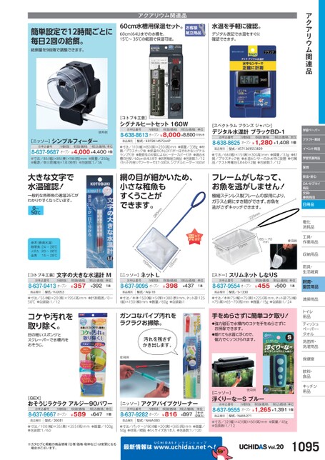 トイレレ用品品ティッシュティッシュペーパー・パタオルル洗面所・洗面所・洗濯用品濯保健室保健室飲料・料・食品食品キッチンキッチン用品品アクアリウム関連品学習ペーパークラフト・素材イベント用品学習支援用品保育安全・安心OA・サプライ用品文具・事務用品日用品電化化消耗品耗工具・具・作業用品業収納用品納雨具・具・生活雑貨活飼育・園芸用品簡単設定で12時間ごとに毎日2回の給餌。給餌量を9段階で調整できます。アクアリウム関連品60cm水槽用保温セット。60cm(64L)までの水槽を、15℃〜35℃の範囲で保温可能。水温を手軽に確認。デジタル表記で水温をすぐに確認できます。[スペクトラムブランズジャパン]デジタル水温計ブラックBD-1お申込番号M価税抜税抜価格税込価格8-638-8625オープン¥1,280¥1,408単位1個商品種別型式/4571269553829●寸法/66(幅)×15奥)×30(高)mm●質量/33g●材質/プラスチック他●水温センサーのみ水中に設置●付属品/テスト用電池(LR44)×2個●包装数:1/12フレームがしなって、お魚を逃がしません!極細ステンレス製フレームの採用により、ガラスと網にすき間ができず、お魚を逃がさずキャッチできます。mm52265〜70mm使用例mm5775mm[コトブキ工芸]シグナルヒートセット160Wお申込番号M価税抜税抜価格税込価格単位8-638-8613オープン¥8,000¥8,8001セット商品種別型式/4972814572447●寸法/110(幅)×80(奥)×230(高)mm●質量/338g●材質/プラスチック他●保温のON,OFFが一目でわかるシグナルランプ付き●難燃性の材質によるヒーターカバー付き●適合水槽の目安/60cm(64L)まで●お客様組立商品●包装数:1/12〈セット内容〉パワーサーモET-300X、シグナルヒーター160W網の目が細かいため、小さな稚魚もすくうことができます。380mm125mm150mm使用例[ニッソー]シンプルフィーダーお申込番号M価税抜税抜価格税込価格単位8-637-9687オープン¥4,000¥4,4001個●寸法/85(幅)×85(奥)×98高)mm●質量/250g●電源/単三乾電池×1本(別売)●包装数:1/36大きな文字で水温確認!一般的な熱帯魚の適温26℃がわかりやすくなっています。0〜50℃参考(最適水温)熱帯魚:24〜28℃メダカ:20〜26℃金魚:15〜28℃[コトブキ工芸]文字の大きな水温計Mお申込番号M価税抜8-637-9413オープン税抜価格¥357税込価格¥392単位1本[ニッソー]ネットLお申込番号M価税抜8-637-9095オープン税抜価格¥398税込価格¥437単位1本[スドー]スリムネットしなりSお申込番号M価税抜8-637-9554オープン税抜価格¥455税込価格¥500単位1本商品種別型式/K-0053商品種別型式/AQ-18商品種別型式/S-1330●寸法/55幅)×20(奥)×195高)mm●計測範囲/0〜50℃●包装数:1/12●寸法/本体:150(幅)×5(厚)×380(長)mm、ネット部:125(縦)×150(横)mm●質量/60g●包装数:1●寸法/本体:75(幅)×75(奥)×225高)mm、ネット部:75(幅)×75奥)×65〜70(高)mm●質量/15g●包装数:1/24清掃用品掃コケや汚れを取り除く。目の粗いスポンジとスクレーパーで水槽内をおそうじ。ガンコなパイプ汚れをラクラクお掃除。汚れを残さずかき出します。使用例手をぬらさずに簡単コケ取り!●強力磁石で水槽内のコケを手をぬらさずにお掃除できます。●離れても水面に浮くので、磁力でくっつけられます。[GEX]おそうじラクラクアルジー90パワーお申込番号M価税抜8-637-9667オープン税抜価格¥589税込価格¥647単位1個[ニッソー]アクアパイプクリーナーお申込番号M価税抜8-637-9282オープン税抜価格¥816税込価格¥897単位1セット(2本入)商品種別型式/20081商品種別型式/NAM-083●寸法/100(幅)×35(奥)×355(高)mm●質量/100g●包装数:1/60●寸法/パッケージ:80幅)×20(奥)×385(高)mm●質量/50g●材質/樹脂●S・Lサイズ各1本入●包装数:1/120※カタログに掲載の商品情報(仕様・価格・税率など)は変更になる場合がございます。最新情報はUCHIDASww.uchidas.netw[ニッソー]浮くりーなーSブルー使用例お申込番号M価税抜税抜価格税込価格単位8-637-9555オープン¥1,265¥1,3911個商品種別型式/NAM-271●寸法/32幅)×43奥)×60高)mm●質量/45g●包装数:1/12へ!Vol.201095