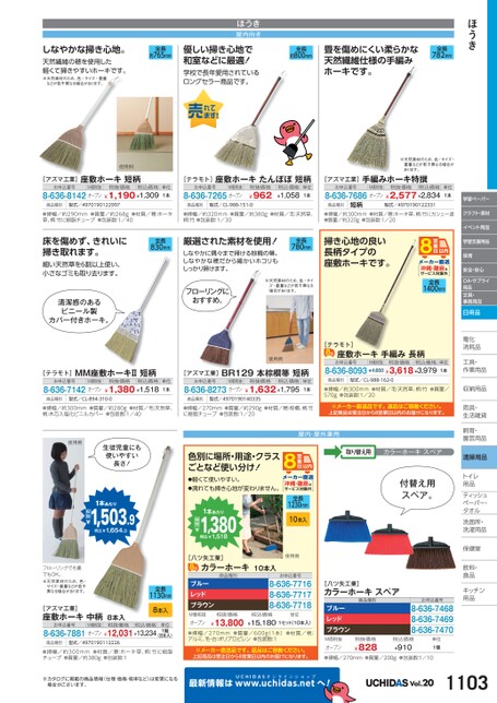 ほうき学習ペーパークラフト・素材イベント用品学習支援用品保育安全・安心OA・サプライ用品文具・事務用品日用品電化化消耗品耗工具・具・作業用品業収納用品納雨具・具・生活雑貨活飼育・育・園芸用品芸清掃用品トイレレ用品品ティッシュティッシュペーパー・パタオルル洗面所・洗面所・洗濯用品濯保健室保健室飲料・料・食品食品キッチンキッチン用品品屋内・屋外兼用取り替え用カラーホーキスペア沖縄・離島はサービス対象外全長1230mm10本入使用例お申込番号8-636-77168-636-77178-636-7718付替え用スペア。お申込番号8-636-74688-636-74698-636-7470[八ツ矢工業]カラーホーキスペア商品種別ブルーレッドブラウン[アズマ工業]座敷ホーキ中柄8本入お申込番号M価税抜税抜価格税込価格8-636-7881オープン¥12,031¥13,234単位1組(8本入)商品種別型式/4970190112226●掃幅/約300mm●材質/穂:ホーキ草、柄:竹に樹脂チューブ●質量/約380g●包装数:1税込価格税抜価格¥13,800M価税抜¥15,1801セット(10本入)オープン●掃幅/270mm●質量/600g(1本)●材質/柄:アルミ、毛・台:ポリプロピレン●包装数:1単位※メーカー直送品です。返品はご容赦ください。上記商品は受注日から8営業日以内のお届けになります。※カタログに掲載の商品情報(仕様・価格・税率など)は変更になる場合がございます。最新情報はUCHIDASww.uchidas.netw税抜価格M価税抜オープン●掃幅/270mm●質量/200g●包装数:1/10税込価格¥910¥828単位1個へ!Vol.201103しなやかな掃き心地。天然繊維の穂を使用した軽くて掃きやすいホーキです。※天然素材のため、色・サイズ・重量などが若干異なる場合があります。ほうき屋内向き全長約765mm優しい掃き心地で和室などに最適!学校で長年愛用されているロングセラー商品です。全長約800mm畳を傷めにくい柔らかな天然繊維仕様の手編みホーキです。全長782mm使用例※天然素材のため、色・サイズ・重量などが若干異なる場合があります。[アズマ工業]座敷ホーキ短柄お申込番号8-636-8142オープン¥1,190¥1,309M価税抜税抜価格税込価格単位1本[テラモト]座敷ホーキたんぽぽ短柄[アズマ工業]手編みホーキ特撰お申込番号M価税抜8-636-7265オープン税抜価格¥962税込価格¥1,058単位1本お申込番号M価税抜税抜価格税込価格8-636-7686オープン¥2,577¥2,834単位1本商品種別型式/4970190122997商品種別型式/CL-988-151-0商品種別型式/4970190122331短柄●掃幅/約290mm●質量/約268g●材質/穂:ホーキ草、柄:竹に樹脂チューブ●包装数:1/40●掃幅/約320mm●質量/約380g●材質/毛:天然草、柄:竹●包装数:1/30●掃幅/約300mm●材質/穂:ホーキ草、柄:竹にカシュー塗●質量/約320g●包装数:1/20床を傷めず、きれいに掃き取れます。細い天然草を6割以上使い、小さなゴミも取り去ります。清潔感のあるビニール製カバー付きホーキ。全長830mm厳選された素材を使用!しなやかに隅々まで掃ける棕櫚の箒。しなやかな穂だから細かいホコリもしっかり掃けます。全長780mm掃き心地の良い長柄タイプの座敷ホーキです。フローリングにおすすめ。※天然素材のため、色・サイズ・重量などが若干異なる場合があります。沖縄・離島はサービス対象外全長1400mm[テラモト]MM座敷ホーキⅡ短柄お申込番号M価税抜8-636-7142オープン税抜価格税込価格¥1,380¥1,518単位1本使用例[アズマ工業]BR129本棕櫚箒短柄お申込番号M価税抜税抜価格税込価格8-636-8273オープン¥1,632¥1,795単位1本商品種別型式/CL-894-310-0商品種別型式/4970190140335●掃幅/約300mm●質量/約280g●材質/毛:天然草、柄:木芯入塩化ビニルカバー●包装数:1/40●掃幅/270mm●質量/約290g●材質/穂:棕櫚、柄:竹に樹脂チューブ●包装数:1/20[テラモト]座敷ホーキ手編み長柄お申込番号M価税抜税抜価格税込価格8-636-8093¥4,850¥3,618¥3,979単位1本商品種別型式/CL-988-162-0●掃幅/約300mm●材質/毛:天然草、柄:竹●質量/570g●包装数:1/20※メーカー直送品です。返品はご容赦ください。上記商品は受注日から8営業日以内のお届けになります。使用例生徒児童にも使いやすい長さ!色別に場所・用途・クラスごとなど使い分け!●軽くて使いやすい。●濡れても掃き心地が変わりません。1本あたり1,380税込¥1,518税抜¥1本あたり1,503.9税込¥1,654.3税抜¥フローリングでも畳でもOK。※天然素材のため、色・サイズ・重量などが若干異なる場合があります。[八ツ矢工業]カラーホーキ10本入商品種別全長1130mm8本入ブルーレッドブラウン