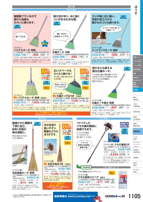 ほうき学習ペーパークラフト・素材イベント用品学習支援用品保育安全・安心OA・サプライ用品文具・事務用品日用品電化化消耗品耗工具・具・作業用品業収納用品納雨具・具・生活雑貨活飼育・育・園芸用品芸清掃用品トイレレ用品品ティッシュティッシュペーパー・パタオルル洗面所・洗面所・洗濯用品濯保健室保健室飲料・料・食品食品キッチンキッチン用品品樹脂製ブラシなので濡れた地面もきれいに掃けます。約830mm全長強くて丈夫。ほうき屋内外兼用耐久性があり、水に強くコシがある丈夫な穂。約950mm全長使いやすい中柄タイプです。コシが強く水に強い。先割れ加工だから細かなホコリも掃けます。全長約815mmコンクリート床に適した化繊ホーキ。使用例[テラモト]パステルホーキ短柄お申込番号M価税抜8-636-7166オープン税抜価格¥405税込価格¥445単位1本商品種別全長/約830mm、掃幅/約220mm、型式/CL-389-100-0●材質/毛:ポリプロピレン、柄:天然木にポリエチレン被膜、カバー:ポリ塩化ビニル●包装数:1/40[アズマ工業]化繊ホーキ中柄お申込番号M価税抜8-636-7996オープン税抜価格¥685税込価格¥753単位1本商品種別型式/4970190270858●掃幅/約220mm●質量/約180g●材質/穂:ポリプロピレン、柄:竹に樹脂チューブ●包装数:1/40広いスペースもらくらく掃ける!水に強くて耐久性のある丈夫な穂。効率よく掃けるワイドなほうき。沖縄・離島はサービス対象外全長約1258mm20本入沖縄・離島はサービス対象外全長1280mm10本入[テラモト]パステルホーキ長柄20本入お申込番号8-636-7910M価税抜税抜価格税込価格オープン¥13,059¥14,364単位1箱(20本入)商品種別型式/CL-389-120-0●全長/約1258mm●掃幅/190mm●材質/毛・カバー:ポリプロピレン、柄:竹柄にPVC被膜●包装数:1[アズマ工業]化繊ビッグほうき10本入お申込番号8-637-0812M価税抜税抜価格税込価格オープン¥13,400¥14,740単位1セット(10本入)商品種別型式/4970190270827●全長/1280mm●掃幅/400mm●質量/395g●材質/穂:ポリプロピレン、ヘッド:ポリエチレン、柄:竹に樹脂チューブ●包装数:1[アズマ工業]エントランスホーキ短柄お申込番号M価税抜8-636-8149オープン税抜価格¥520税込価格¥572単位1本商品種別型式/4970190270681●全長/約815mm●掃幅/220mm●質量/240g●材質/穂:ポリプロピレン、柄:樹脂被覆鋼管●包装数:1/40全長約795mm雪かきにも使える極太化繊ホーキ。コシの強い極太の穂が重いゴミや大きなゴミをラクに掃きだします。アスファルトのお掃除や、雪のかき出しに。[アズマ工業]化繊ホーキ極太短柄お申込番号M価税抜8-636-8048オープン税抜価格¥607税込価格¥667単位1本商品種別型式/4970190270889●掃幅/約280mm●質量/232g●材質/穂:ポリプロピレン、柄:竹に樹脂チューブ●包装数:1/40クモの巣取り※メーカー直送品です。返品はご容赦ください。上記商品は受注日から8営業日以内のお届けになります。屋外向き全長約820mm厳選された葉脈を丁寧に加工。砂利・花壇の掃き掃除に。芝生に絡んだゴミもしっかり掃ける。中が空洞で扱いやすい軽量化されたほうきです。沖縄・離島はサービス対象外全長1265mm10本入中が空洞です。使用例[アズマ工業]名匠庭園ホーキ短柄商品種別型式/4970190250744M価税抜オープン¥814税抜価格お申込番号8-636-8146税込価格¥895単位1本●全長/約820mm●掃幅/約200mm●質量/約289g●材質/穂:ヤシの葉脈、柄:木に塗装●包装数:1/30[アズマ工業]名匠外苑ほうき10本入商品種別型式/4970190250720M価税抜オープン税抜価格お申込番号8-636-7905税込価格単位1箱¥14,482¥15,930(10本入)●寸法/約200(直径)×1265(全長)mm●質量/約527g●材質/穂:ヤシの葉脈、柄:木に塗装柄●包装数:1※メーカー直送品です。返品はご容赦ください。上記商品は受注日から8営業日以内のお届けになります。ベトベトしたクモの巣を簡単に処理できます。とったクモの巣をシートがキャッチ。使い捨てシート付き。全長約900〜1400mmブラシの角度は6段階に調節可能!使用例[アズマ工業]クモの巣取りF商品種別型式/4970190437510M価税抜税抜価格お申込番号8-636-7436税込価格オープン¥2,655¥2,920単位1本●ブラシ幅/約210mm●質量/465g●材質/ブラシ:樹脂、ヘッド:ポリプロピレン、シート:ナイロン、柄:樹脂被覆鋼管●付属品/シート3枚●お客様組立商品●包装数:1/10取り替え用クモの巣取りスペアクモの巣取りのスペアシート。[アズマ工業]クモの巣取りスペア5枚入5枚入お申込番号M価税抜8-636-7437オープン税抜価格¥371税込価格¥408単位1袋(5枚入)商品種別型式/4970190349684●シート寸法/約350(縦)×350(横)mm●材質/ナイロン●包装数:1/100※カタログに掲載の商品情報(仕様・価格・税率など)は変更になる場合がございます。最新情報はUCHIDASww.uchidas.netwへ!Vol.201105