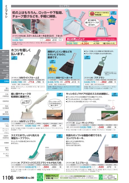 ミニブラシ机の上はもちろん、ロッカーや下駄箱、チョーク受けなどを、手軽に掃除。使用例テラモト×ウチダス共同企画!全長217mm使う場所を書けるスペースがあります。[テラモト共同企画]スクールミニホーキ&ちりとり1セットお申込番号8-636-7801税込価格¥510●材質/柄・毛先・チリトリ:ポリプロピレン●寸法/幅:165mm、全長:217mm●包装数:1/100¥464M価税抜オープン税抜価格単位1セットまとめ買いパック8-636-7802お申込番号税抜価格¥4,354裏面※1組単位申込。税込価格¥4,789単位1組(10セット入)ホコリを優しく払います。全長288mm掃除がしにくい隅などをきれいにするのに最適です。全長235mm●チョークの粉、ホコリを隅々まで掃き取ります。●グリップのヘラで固まったものも取れます。全長210mm※天然素材のため色・サイズ・質量などが若干異なる場合があります。[テラモト]MMライトブルームⅡお申込番号8-636-7280M価税抜¥920税抜価格¥714税込価格¥785単位1本[テラモト]MMベビーホーキお申込番号8-636-7276M価税抜¥500税抜価格¥376税込価格¥413単位1本[アズマ工業]プチブラシお申込番号M価税抜8-636-7279オープン税抜価格¥362税込価格¥398単位1本商品種別型式/CE-898-300-0商品種別型式/CE-895-400-0商品種別型式/4970190443290●材質/柄:ポリエチレン、毛:天然草●寸法/幅:120mm●包装数:1/50●材質/柄:ポリプロピレン、毛:アレンファイバー●色/グレー●包装数:1/100●材質/穂:ヒタムファイバー、ヘッド:ポリエチレン●寸法/90幅)×30(奥)×210(全長)mm●包装数:1/60細い溝やチョークの粉掃除に最適です。ヘッド部分が回転します!全長150mmグリップのヘラでこびり付き汚れを落とします。サッシのミゾやドア付近のスミのお掃除に。●サッシのミゾやスミのお掃除ができる薄型ブラシです。●ブラシのしなやかさ、コシの強さでキレイにします。●こびりついた汚れを落とすスクレーパー付き。全長約230mmスクレーパー[テラモト]MMサッシブラシ商品種別型式/CE-895-000-0お申込番号8-636-7552使用例M価税抜¥480税抜価格¥384税込価格¥422単位1本●寸法/60(幅)×20(奥)×150(全長)mm●材質/柄:ポリプロピレン、ブラシ:ポリエステル●包装数:1/100[アズマ工業]商品種別ニューサッシブラシお申込番号M価税抜型式/49701904389998-636-7998オープン使用例税抜価格¥348税込価格¥382単位1個●寸法/約80(幅)×15(奥)×230(全長)mm●材質/ポリプロピレン●包装数:1/20スミズミまでしっかり洗える薄型カーブブラシ。サッシ・タイル目地・蛇口まわりなどのおそうじに。使用例全長約230mm先割れのソフトな樹脂の穂でできたコンパクトホーキ。全長約500mm細かいホコリも掃き取れる。穂はポリプロピレン。汚れたら水で洗えます。使用例ミニブラシ学習ペーパークラフト・素材イベント用品学習支援用品保育安全・安心OA・サプライ用品文具・事務用品日用品電化電化消耗品消耗品工具・工具作業用品作業用収納用品収納用雨具・雨具生活雑貨生活雑飼育・飼育園芸用品園芸用清掃用品トイレトイ用品用品ティッシュティッシュペーパー・タオルタオル洗面所・洗面所・洗濯用品洗濯用保健室保健室飲料・飲料食品食品キッチンキッチン用品用品[アズマ工業]アズマジックスミズミブラシマルチBA736[アズマ工業]ミニブルーム商品種別お申込番号型式/49701904442048-636-8278M価税抜オープン税抜価格¥504税込価格¥554単位1個商品種別お申込番号型式/49701904420198-636-8276M価税抜オープン税抜価格¥520税込価格¥572単位1本●寸法/約14(幅)×56(奥)×230(全長)mm●質量/約29g●材質/ポリプロピレン●包装数:1/120●寸法/約220(幅)×500(全長)mm●質量/約112g●材質/穂:ポリプロピレン、柄:木にポリエチレンチューブ、ヘッド:ポリエチレン●包装数:1/401106Vol.20地球にやさしくお買い物このマークのついた商品は地球環境保護に配慮された商品です。グリーンの文字で商品の判別をしやすくしました。どうぞご利用ください。エコマーク認定品グリーン購入法適合品GPNエコ商品ねっと掲載