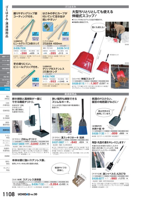 [永塚製作所]木柄十能中130150mmmmお申込番号M価税抜8-636-7130オープン税抜価格¥809税込価格¥889単位1本●材質/皿:スチール、柄:天然木●包装数:1角型・丸型の溝をキレイにします!先端の左右を角形・丸形にしたので角型・U型の溝にフィットします。先端部分はステンレスプレートを使用。mm426mm901[アズマ工業]溝シャベルSAZ679お申込番号8-636-8277M価税抜オープン税抜価格¥980税込価格¥1,078単位1本商品種別型式/4970190422042●寸法/約85幅)×109奥)×624(高)mm●質量/220g●材質/ヘッド:ポリプロピレン、プレート:ステンレス、柄:樹脂被覆鋼管●包装数:1/20mm85使用例使用例使用例柄を縮めたとき630〜800mm370mm[コンパル]伸縮スコップお申込番号M価税抜税抜価格税込価格8-636-8115オープン¥1,907¥2,097単位1本●寸法/370(幅)×630〜800長)×90(高)mm●材質/ポリプロピレン、アルミ合金●包装数:1全長300mmステンレススチール[永塚製作所]ビニールグリップごみ取りトングお申込番号8-636-7536全長450mmスチール[トラスコ中山]ゴミはさみ450mm商品種別型式/TDT-450お申込番号8-636-7412税抜価格¥390M価税抜オープン●全長/300mm●材質/ステンレススチール●包装数:1/30税込価格¥429単位1本M価税抜¥300税抜価格¥285税込価格¥313単位1本●全長/450mm●材質/スチール●包装数:1/20手の滑りにくい、ビニールグリップ付き。m600m全長600mmステンレス鋼[永塚製作所]グリップ付ステンレスゴミ取りトングお申込番号8-636-7400税抜価格M価税抜オープン●全長/600mm●材質/ステンレス鋼税込価格¥1,048¥953単位1本(1.0mm厚)●包装数:1360mm柄は天然木を使用しています。側溝のドロさらい、園芸の堆肥運びなどに!掃き掃除と溝掃除が一度にできる機能チリトリ。本体を90°回転させることで狭い溝の掃除にも使用できます。溝清掃用品狭い場所も掃除できるスリムなホーキ。スリムな毛先で階段の溝や側溝掃除に最適です。ゴミはさみ握りやすいグリップ部コーティング付き。はさみの手にカーブが付いていて空き缶が拾いやすい!300mm450mm大型ちりとりとしても使える伸縮式スコップ!●スコップの先にはアルミ合金の補強付き。●伸縮柄は着脱式です。雪にも使える!使用例使用例[テラモト]お申込番号2WayチリトリM価税抜税抜価格税込価格8-637-0806¥3,800¥3,040¥3,344単位1個商品種別型式/DP-472-000-7●寸法/横使用時:約272(幅)×295(奥)×660(高)mm、縦使用時:約121(幅)×342(奥)×678(高)mm●質量/約540g●材質/本体・グリップ:ポリプロピレン、柄:Φ16アルミパイプ●包装数:1/6本体はに強いステンレス製。使用しやすい本体と柄の適度な角度。[テラモト]溝スッキリホーキ短柄お申込番号8-637-0807M価税抜オープン税抜価格¥840税込価格¥924単位1本商品種別型式/CL-390-000-0●寸法/全長:約870mm●質量/約175g●材質/毛:ポリプロピレン、カバー:ポリエチレン、柄:竹柄に塩化ビニル被膜●毛幅/約90mm●包装数:1/20※保管の際は、毛先を上に向けて立てるか、毛先が地面につかないように吊るしてください。側溝やドブの清掃に。約100mm単位1本[カネコ総業]ステンレス清掃器商品種別寸法/約100刃の間口)×130(刃の奥行)×750(全長)mmお申込番号M価税抜税抜価格税込価格8-636-7132オープン¥2,264¥2,490●材質/本体:ステンレス、柄:スチール(粉体塗装)●包装数:1/201108Vol.20ゴミはさみ・溝清掃用品学習ペーパークラフト・素材イベント用品学習支援用品保育安全・安心OA・サプライ用品文具・事務用品日用品電化電化消耗品消耗品工具・工具作業用品作業用収納用品収納用雨具・雨具生活雑貨生活雑飼育・飼育園芸用品園芸用清掃用品トイレトイ用品用品ティッシュティッシュペーパー・タオルタオル洗面所・洗面所・洗濯用品洗濯用保健室保健室飲料・飲料食品食品キッチンキッチン用品用品