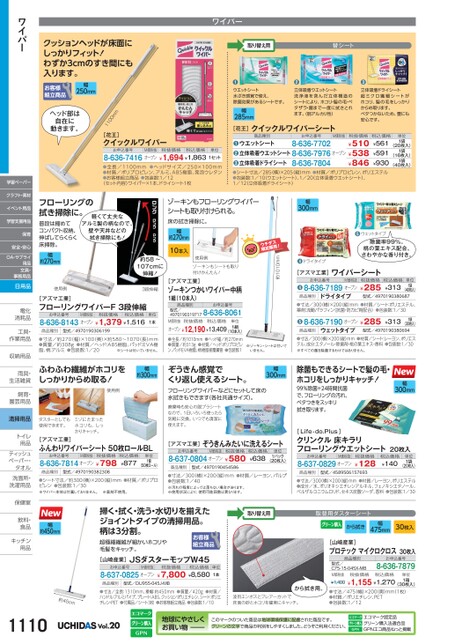 ●ウエットシート水ぶき感覚で使え、除菌効果があるシートです。幅285mm●立体吸着ウエットシート洗浄液を含んだ立体構造のシートにより、ホコリ・髪の毛・ベタザラ・菌まで一度に拭きとれます。(弱アルカリ性)●立体吸着ドライシート超ミクロ繊細シートがホコリ、髪の毛をしっかりからめ取ります。ベタつかないため、畳にも安心です。単位1袋1袋1袋(20枚入)(16枚入)(40枚入)M価税抜税抜価格税込価格¥561¥591¥9308-636-7702ウエットシート立体吸着ウエットシート8-636-79768-636-7804立体吸着ドライシート●●●シート寸法/285(横)×205(縦)mm●材質/ポリプロピレン、ポリエステル●包装数:1/10(ウエットシート)、1/20(立体吸着ウエットシート)、1/12(立体吸着ドライシート)¥510¥538¥846オープン●お申込番号商品種別[花王]クイックルワイパーシートヘッド部は自在に動きます。0mm011[花王]クイックルワイパーお申込番号M価税抜税抜価格税込価格単位8-636-7416オープン¥1,694¥1,8631セット●全長/1100mm●ヘッドサイズ/250×100mm●材質/ポリプロピレン、アルミ、ABS樹脂、発泡ウレタン●お客様組立商品●包装数:1/12〈セット内容〉ワイパー×1本、ドライシート1枚幅300mm●ドライタイプ●ウェットタイプ除菌率99%。桃の葉エキス配合。さわやかな香り付き。[アズマ工業]ワイパーシートお申込番号M価税抜8-636-7189オープンドライタイプ●商品種別税抜価格¥285税込価格¥313単位1袋(40枚入)型式/4970190380687●寸法/300(横)×200(縦)mm●材質/シート:ポリエステル、薬剤:流動パラフィン(抗菌・防カビ剤配合)●包装数:1/30●商品種別8-636-7190オープン¥285¥3131袋(30枚入)ウェットタイプ型式/4970190380694約1010mmゾーキンもフローリングワイパーシートも取り付けられる。床の拭き掃除に。幅約270mm10本入使用例ゾーキンもシートも取り付けかんたん![アズマ工業]ゾーキンつかいワイパー中柄1組(10本入)商品種別お申込番号型式/49701903197178-636-8061M価税抜税抜価格税込価格オープン¥12,190¥13,409単位1組(10本入)フローリングの拭き掃除に。普段は縮めてコンパクト収納、伸ばしてらくらく床掃除。幅約270mm軽くて丈夫なアルミ製の柄なので、壁や天井などの拭き掃除にも!約58〜107cmに伸縮!使用例3段伸縮[アズマ工業]フローリングワイパーF3段伸縮お申込番号M価税抜税抜価格税込価格8-636-8143オープン¥1,379¥1,516単位1本商品種別型式/4970190306199●寸法/約270(幅)×100(奥)×約580〜1070(長)mm●質量/約308g●材質/ヘッド:ABS樹脂、パッド:EVA樹脂、柄:アルミ●包装数:1/20※シートは付いていません。●全長/約1010mm●ヘッド幅/約270mm●質量/約313g●材質/ヘッド:ポリプロピレン、パッド:EVA樹脂、柄:樹脂被覆鋼管●包装数:1※ゾーキン・シートは付いていません。●寸法/300(横)×200(縦)mm●材質/シート:レーヨン、ポリエステル、成分:エタノール・除菌剤・桃の葉エキス・香料●包装数:1/30※すべての菌を除菌するわけではありません。ふわふわ繊維がホコリをしっかりからめ取る!幅約300mmぞうきん感覚でくり返し使えるシート。幅300mm使用例フローリングワイパーなどにセットして床の水拭きもできます(各社共通サイズ)。廃棄時も安心の脱プラシートなので、1日いろいろ使ったら気軽に交換。いつでも清潔に使えます。ダスターとしても使用できます。ミゾにたまったホコリも、しっかりキャッチ。[アズマ工業]ふんわりワイパーシート50枚ロールBLお申込番号M価税抜税抜価格8-636-7814オープン¥798税込価格¥877単位1個(50枚ロール)商品種別型式/4970190382308●シート寸法/約300(横)×200(縦)mm●材質/ポリプロピレン●包装数:1/30※ワイパー本体は付属しておりません。※薬剤不使用。[アズマ工業]ぞうきんみたいに洗えるシートお申込番号M価税抜税抜価格8-637-0804オープン¥580税込価格¥638単位1パック(20枚入)商品種別型式/4970190454586●寸法/300(横)×200(縦)mm●材質/レーヨン、パルプ●包装数:1/40※汚れの程度によっては落ちない場合があります。※使用状況により、使用可能回数は異なります。除菌もできるシートで髪の毛・ホコリをしっかりキャッチ!99%除菌+24時間抗菌で、フローリングの汚れ、ベタつきをスッキリ拭き取ります。幅300mm[Life-do.Plus]クリンクル床キラリフローリングウエットシート20枚入お申込番号M価税抜8-637-0829オープン税抜価格¥128商品種別型式/4589506157693税込価格¥140単位1袋(20枚入)●寸法/300(横)×200縦)mm●材質/レーヨン、ポリエステル●成分/水、ポリオキシエチレンアルキル、フェノキシエタノール、ベルザルコニウムロリド、セキス炭酸ソーダ、香料●包装数:1/30幅約450mm掃く・拭く・洗う・水切りを揃えたジョイントタイプの清掃用品。柄は3分割。取り替え用取替用ダスターシートから拭き幅475mm30枚入超極細繊維が細かいホコリや毛髪をキャッチ。[山崎産業]お申込番号JSダスターモップW45M価税抜税抜価格税込価格8-637-0825オープン¥7,800¥8,580単位1本商品種別型式/DU955-045J-MB●寸法/全長:1310mm、掃幅:約450mm●質量/420g●材質/ハンドル:アルミパイプ、プレート:ABS、クッション:ポリエチレン、シート:ポリエチレン