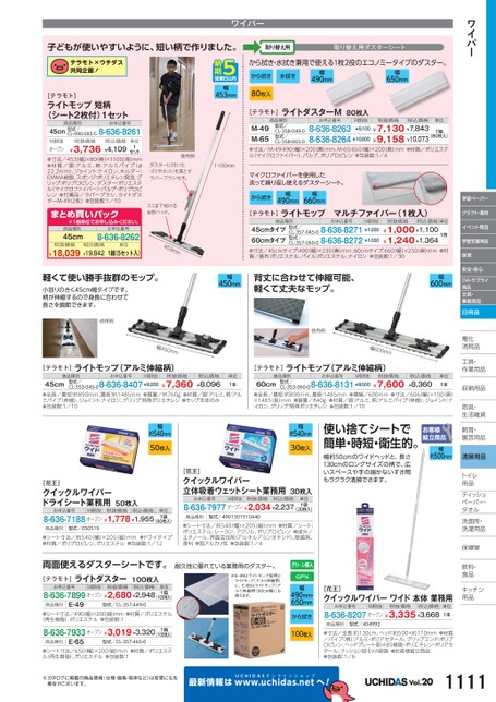 ワイパー学習ペーパークラフト・素材イベント用品学習支援用品保育安全・安心OA・サプライ用品文具・事務用品日用品電化化消耗品耗工具・具・作業用品業収納用品納雨具・具・生活雑貨活飼育・育・園芸用品芸清掃用品トイレレ用品品ティッシュティッシュペーパー・パタオルル洗面所・洗面所・洗濯用品濯保健室保健室飲料・料・食品食品キッチンキッチン用品品使い捨てシートで簡単・時短・衛生的。幅約50cmのワイドヘッドと、長さ130cmのロングサイズの柄で、広いスペースや手の届かないすき間もラクラク清掃できます。幅約500mm[花王]クイックルワイパーワイド本体業務用お申込番号M価税抜税抜価格税込価格8-636-8207オープン¥3,335¥3,668単位1本商品種別型式/404992●寸法/全長:約130cm、ヘッド:約500×約110mm●材質/パイプ(柄)アルミ・ポリアセタール、グリップエンド:ポリプロピレン、ヘッドプレート部:ABS樹脂・ポリエチレン・ポリアセタール、クッション部:EVA樹脂●お客様組立商品●包装数:1/6へ!Vol.201111子どもが使いやすいように、短い柄で作りました。取り替え用取り替え用ダスターシートワイパーテラモト×ウチダス共同企画![テラモト]ライトモップ短柄(シート2枚付)1セット商品種別お申込番号45cm型式/CL-990-085-58-636-82611単位セット税込価格税抜価格¥3,736¥4,109M価税抜オープン●寸法/453幅)×80奥)×1100高)mm●材質/頭:アルミ、柄:アルミパイプ(φ22.2mm)、ジョイント:ナイロン、ホルダー:EMMA樹脂、スポンジ:ポリエチレン発泡、グリップ:ポリプロピレン、ダスター:ポリエステル(マイクロファイバー)・パルプ・ポリプロピレン●付属品/ラバーブラシ、ライトダスターM-492枚)●包装数:1/10まとめ買いパック※1組単位申込。商品種別45cmお申込番号8-636-8262税抜価格¥18,039税込価格¥19,842単位1組(5セット入)から拭き・水拭き兼用で使える1枚2役のエコノミータイプのダスター。から拭き水拭き幅幅490mm650mm幅453mm80枚入[テラモト]ライトダスターM80枚入M価税抜お申込番号商品種別型式/CL-358-049-0型式/CL-358-065-0M-49M-65●寸法/M-49:490幅)×200奥)mm、M-65:650幅)×200奥)mm●材質/ポリエステル(マイクロファイバー)、パルプ、ポリプロピレン●包装数:1/4¥8,100¥7,130¥7,8438-636-82638-636-8264¥10,800¥9,158¥10,073(80枚入)税抜価格税込価格単位1箱マイクロファイバーを使用した洗って繰り返し使えるダスターシート。から拭き幅幅490mm660mm[テラモト]ライトモップマルチファイバー(1枚入)商品種別お申込番号M価税抜税抜価格税込価格単位型式/CL-357-045-08-636-8271¥1,250CL-357-060-08-636-8272¥1,55045cmタイプ60cmタイプ●寸法/45cmタイプ:490(幅)×230(奥)mm、60cmタイプ:660(幅)×230(奥)mm●材質/基布:ポリエステル、パイル:ポリエステル、ナイロン●包装数:1/30¥1,000¥1,100¥1,240¥1,364型式/1枚使用例ダスターに付いたゴミやホコリを落とすラバーブラシ付き。1100mmスミまで拭ける台形ヘッド。453mm軽くて使い勝手抜群のモップ。小回りのきく45cm幅タイプです。柄が伸縮するので身長に合わせて長さを調節できます。使用例幅450mm背丈に合わせて伸縮可能、軽くて丈夫なモップ。幅600mm幅450mm使用例幅600mm[テラモト]ライトモップ(アルミ伸縮柄)商品種別型式/お申込番号M価税抜税抜価格CL-353-045-08-636-8407¥9,20045cm●全長/最短:約890mm、最長:約1485mm●質量/約760g●材質/頭:アルミ、柄:アルミパイプ(伸縮)、ジョイント:ナイロン、グリップ:特殊ポリエチレン●モップ本体のみ●包装数:1/10¥7,360税込価格¥8,096単位1本[テラモト]ライトモップ(アルミ伸縮柄)商品種別型式/お申込番号M価税抜税抜価格CL-353-060-08-636-8131¥9,50060cm●全長/最短:約890mm、最長:1485mm●掃幅/600mm●寸法/606(幅)×100(奥)×1485(長)mm●質量/840g●材質/頭:アルミ、柄:アルミパイプ(伸縮)、ジョイント:ナイロン、グリップ:特殊ポリエチレン●包装数:1/10¥7,600税込価格¥8,360単位1本幅約540mm50枚入幅約540mm30枚入[花王]クイックルワイパードライシート業務用50枚入お申込番号M価税抜税抜価格税込価格8-636-7188オープン¥1,778¥1,955単位1袋(50枚入)商品種別型式/050519●シート寸法/約540(幅)×205(縦)mm●ドライタイプ●材質/ポリプロピレン、ポリエステル●包装数:1/12[花王]クイックルワイパー立体吸着ウェットシート業務用30枚入お申込番号M価税抜税抜価格税込価格8-636-7977オープン¥2,034¥2,237単位1袋(30枚入)商品種別型式/4901301510440●シート寸法/約540(幅)×205(縦)mm●材質/シート:ポリエステル、レーヨン、アクリル、ポリプロピレン●成分/エタノール、界面活性剤(アルキルアミンオキシド)、除菌剤、香料●弱アルカリ性●包装数:1/4両面使えるダスターシートです。耐久性に優れている業務用のダスター。[テラモト]ライトダスター100枚入※E-49はライトモップ短柄とライトモップ(アルミ伸縮柄)に、E-65はライトモップ(アルミ伸縮柄)60cm幅にも使えます。お申込番号M価税抜税抜価格税込価格8-636-7899オープン¥2,680¥2,948単位1箱(100枚入)商品種別E‐49型式/CL-357-449-0●シート寸法/490(幅)×200(縦)mm●材質/ポリエステル(再生樹脂)、ポリエステル●包装数:18-636-7933オープン¥3,019¥3,3201箱(100枚