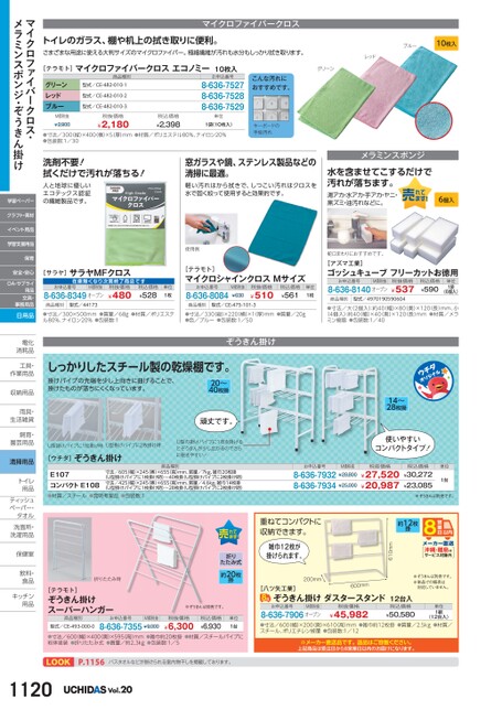 使いやすいコンパクトタイプ!税抜価格¥27,520¥20,987税込価格¥30,272¥23,085単位1台※ぞうきんは別売です。沖縄・離島はサービス対象外610mm約12枚掛14〜28枚掛お申込番号M価税抜8-636-7932¥28,8008-636-7934¥25,000重ねてコンパクトに収納できます。雑巾12枚が掛けられます。[八ツ矢工業]200mm600mm※ぞうきんは別売です。※単品での販売は対応していません。ぞうきん掛けダスタースタンド12台入お申込番号M価税抜8-636-7906オープン税抜価格¥45,982(12台入)●寸法/600(幅)×200(奥)×610(高)mm●雑巾約12枚掛●質量/2.5kg●材質/スチール、ポリエチレン被覆●包装数:1/12税込価格¥50,580単位1組※メーカー直送品です。返品はご容赦ください。上記商品は受注日から8営業日以内のお届けになります。トイレのガラス、棚や机上の拭き取りに便利。さまざまな用途に使える大判サイズのマイクロファイバー。極細繊維が汚れも水分もしっかり拭き取ります。マイクロファイバークロス[テラモト]マイクロファイバークロスエコノミー10枚入ブルー10枚入レッドグリーングリーンレッドブルーM価税抜¥2,900商品種別型式/CE-482-010-1型式/CE-482-010-2型式/CE-482-010-3税抜価格¥2,180お申込番号8-636-75278-636-75288-636-7529こんな汚れにおすすめです。キーボードの手垢汚れ税込価格¥2,398単位1袋(10枚入)●寸法/300(縦)×400(横)×5(厚)mm●材質/ポリエステル80%、ナイロン20%●包装数:1/30洗剤不要!拭くだけで汚れが落ちる!人と地球に優しいエコテックス認証の繊維製品です。窓ガラスや鏡、ステンレス製品などの清掃に最適。軽い汚れはから拭きで、しつこい汚れはクロスを水で固く絞って使用すると効果的です。メラミンスポンジ水を含ませてこするだけで汚れが落ちます。湯アカ・水アカ・手アカ・ヤニ・黒ズミ・油汚れなどに。6個入使用例蛇口まわりにおすすめです。[サラヤ]サラヤMFクロス在庫無次第終了商品お申込番号M価税抜8-636-8349オープン税抜価格¥480税込価格¥528単位1枚[テラモト]マイクロシャインクロスMサイズお申込番号8-636-8084M価税抜¥630税抜価格¥510税込価格¥561単位1枚商品種別型式/44173商品種別型式/CE-475-101-3●寸法/300×500mm●質量/68g●材質/ポリエステル80%、ナイロン20%●包装数:1●寸法/330(縦)×220(横)×1(厚)mm●質量/20g●色/ブルー●包装数:1/50ぞうきん掛け[アズマ工業]ゴッシュキューブフリーカットお徳用お申込番号M価税抜8-636-8140オープン税抜価格¥537商品種別型式/4970190590604税込価格¥590単位1袋(6個入)●寸法/大(2個入)約40(幅)×80(奥)×120(長)mm、小(4個入):約40(幅)×40(奥)×120(長)mm●材質/メラミン樹脂●包装数:1/40しっかりしたスチール製の乾燥棚です。掛けパイプの先端を少し上向きに曲げることで、掛けたものが落ちにくくなっています。20〜40枚掛頑丈です。U型掛けパイプに1枚掛け時U型掛けパイプに2枚掛け時[ウチダ]ぞうきん掛けU型の掛けパイプに1枚を掛けるとぞうきんが少し広がるのでさらに乾きやすい!E107コンパクトE108●材質/スチール●発明考案品●包装数:1寸法/605(幅)×245(奥)×655高)mm、質量/7kg、雑巾20枚掛(U型掛けパイプに1枚掛け時)〜40枚掛(U型掛けパイプに2枚掛け時)寸法/425(幅)×245(奥)×655高)mm、質量/4.6kg、雑巾14枚掛(U型掛けパイプに1枚掛け時)〜28枚掛(U型掛けパイプに2枚掛け時)商品種別折りたたみ時[テラモト]ぞうきん掛けスーパーハンガー商品種別型式/CE-493-000-0お申込番号M価税抜8-636-7355¥9,000折りたたみ式約20枚掛※ぞうきんは別売です。税抜価格¥6,300税込価格¥6,930単位1台●寸法/600(幅)×400(奥)×595(高)mm●雑巾約20枚掛●材質/スチールパイプに粉体塗装●折りたたみ式●質量/約2.3kg●包装数:1/5P.1156バスタオルなどが掛けられる室内物干しを掲載しております。1120Vol.20マイクロファイバークロス・メラミンスポンジ・ぞうきん掛け学習ペーパークラフト・素材イベント用品学習支援用品保育安全・安心OA・サプライ用品文具・事務用品日用品電化電化消耗品消耗品工具・工具作業用品作業用収納用品収納用雨具・雨具生活雑貨生活雑飼育・飼育園芸用品園芸用清掃用品トイレトイ用品用品ティッシュティッシュペーパー・タオルタオル洗面所・洗面所・洗濯用品洗濯用保健室保健室飲料・飲料食品食品キッチンキッチン用品用品