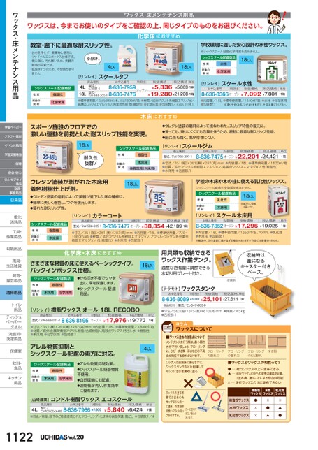 ワックスは、今までお使いのタイプをご確認の上、同じタイプのものをお選びください。ワックス・床メンテナンス用品化学床におすすめ学校環境に適した安心設計の水性ワックス。教室・廊下に最適な耐スリップ性。・缶を使用せず、廃棄時に便利なリサイクルエコボックス仕様です。・傷に強く、汚れ難いため、美観の維持が可能です。・低臭タイプのため、不快感がありません。小分け。4L入18L入[リンレイ]スクールタフシックスクール配慮商品性質樹脂性対象の床材化学床用M価税抜お申込番号商品種別型式/678814型式/8-636-7959オープン4L18L●標準使用量/4L:約400㎡/本、18L:1800㎡/箱●材質/成分:アクリル系樹脂エマルジョン、高融点ワックスエマルジョン、界面活性剤他(樹脂性)●化学床用●包装数:1/34L)、118L)SW-988-205-18-636-7476¥5,336税込価格単位¥5,8691本¥19,280¥21,2081箱税抜価格※シックスクール疑惑化学物質を含みません。シックスクール配慮商品性質18L入水性対象の床材化学床用[リンレイ]スクール水性お申込番号M価税抜税抜価格税込価格8-636-8366オープン¥7,092¥7,801単位1箱●内容量/18L●標準使用量/1440㎡/箱●水性●化学床用●包装数:1※滑りやすくなることがありますので、十分注意してください。木床におすすめスポーツ施設のフロアでの激しい運動を前提とした耐スリップ性能を実現。18L入耐久性抜群!シックスクール配慮商品性質樹脂性対象の床材木床用体育館用(木床用)ウレタン塗装が剥がれた木床用着色樹脂仕上げ剤。●ウレタン塗装の磨耗によって美観が低下した床の補修に。●簡単に美しく着色し、つやを復元します。●優れた耐スリップ性。18L入●ウレタン塗装の磨耗によって損なわれた、スリップ特性の復元に。●滑っても、滑りにくくても危険を伴うため、運動に最適な耐スリップ性能。●耐久性も高く、傷が付きにくい。[リンレイ]スクールジム商品種別型式/SW-988-209-1お申込番号M価税抜税抜価格8-636-7475オープン¥22,201¥24,421税込価格単位1箱●寸法/351幅)×261(奥)×287(高)mm●内容量/18L●標準使用量/1800㎡/箱●材質/成分:アクリル系樹脂エマルジョン、高融点ワックスエマルジョン他(樹脂性)●木床用●包装数:1学校の木床や木の柱に使える乳化性ワックス。シックスクール疑惑化学物質を含みません。シックスクール配慮商品性質乳化性対象の床材木床用18L入※耐スリップ効果は弱いです。シックスクール配慮商品性質樹脂性対象の床材木床用[リンレイ]カラーコート商品種別型式/SW-988-025-18-636-7477オープン¥38,354¥42,1891箱お申込番号M価税抜税抜価格税込価格単位[リンレイ]スクール木床用お申込番号M価税抜税抜価格8-636-7362¥14,800¥17,296¥19,025税込価格単位1缶●寸法/351(幅)×261(奥)×287(高)mm●内容量/18L●標準使用量/720〜1080㎡/箱●材質/成分:アクリル系樹脂エマルジョン、アクリル‐ウレタン系共重合樹脂エマルジョン他(樹脂性)●木床用●包装数:1●内容量/18L●標準使用量/1260㎡/缶、70㎡/L●乳化性●木床用●包装数:1※輸送中、缶の塗装に傷が生ずる場合がありますが内容には影響ありません。化学床・木床におすすめさまざまな材質の床に使えるベーシックタイプ。バックインボックス仕様。18L入シックスクール配慮商品性質樹脂性清掃用品対象の床材木床用化学床用●からぶき不要でツヤを出し、床を保護します。●シックスクール配慮商品。トイレトイ用品用品ティッシュティッシュペーパー・タオルタオル洗面所・洗面所・洗濯用品洗濯用保健室保健室飲料・飲料食品食品キッチンキッチン用品用品[リンレイ]樹脂ワックスオール18LRECOBO商品種別お申込番号型式/SW-988-021-18-636-8195M価税抜オープン税抜価格税込価格¥17,976¥19,773単位1箱●寸法/351横)×261奥)×287高)mm●内容量/18L●標準使用量/1800㎡/箱●材質/成分:金属架橋型アクリル樹脂(合成樹脂)、高融点ワックス(ろう)、水●樹脂性●木床用●化学床用●包装数:1アレル物質抑制とシックスクール配慮の両方に対応。4L入シックスクール配慮商品性質樹脂性対象の床材木床用化学床用●アレル物質抑制効果。●シックスクール疑惑物質不使用。●自然環境にも配慮。●速乾性が有り、作業効率に優れます。[山崎産業]商品種別型式/コンドル樹脂ワックスエコスクールお申込番号M価税抜税抜価格CH709-004X-MB8-636-7966¥7,3004L●用途/教室、廊下など樹脂塗装されたフローリング、化学床の表面保護、艶だし●包装数:1/4¥5,840税込価格¥6,424単位1個1122Vol.20用具類も収納できるワックス作業タンク。適度な含有量に調節できる水切り用プレート付き。使用例収納時は蓋になるキャスター付きベース。[テラモト]ワックスタンクお申込番号M価税抜税抜価格税込価格単位8-636-8089¥31,000¥25,101¥27,6111台商品種別型式/CL-347-800-0●寸法/560幅)×375奥)×610(高)mm●質量/4.5kg●包装数:1ワックスについて■ワックス塗布の注意点についてメンテナンスを行う際は、最小限の水分で行いましょう。フローリングに、ひび・すき間・浮きなどの不具合が発生する恐れがあります。ワックスは直接床に垂らさずに、