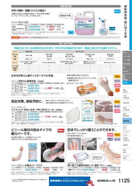 掃除用洗剤・使い切り手袋界面活性剤容器容量500mL空ボトル※薬液は別売です。手早く簡単!細菌・ウイルス除去!2種類の洗浄成分と除菌成分配合で、洗浄と同時に細菌やエンベロープウイルスをしっかり除去します。掃除用洗剤2度拭き不要。[サラヤ]サニベスト商品種別5kgスプレーボトル空ボトル500mLお申込番号M価税抜税抜価格税込価格型式/502678-636-8347オープン¥1,600¥1,760530098-636-8348¥513¥467型式/¥490単位1本●寸法/230(幅)×120(奥)×284(高)mm(5kg)●内容量/5kg、500mL空ボトル)●用途/環境清掃剤●包装数:1/35kg)、1/12500mL)5kgP.1219〜台所用洗剤を掲載しております。使い切り手袋手袋にはいろいろな素材のものがあり、それぞれの特長があります。用途に合わせてお選びください。タイプおすすめ用途材質ポイントフィット感耐油性強度炊事用手袋炊事、清掃塩化ビニル使い切り手袋清掃、園芸、衛生管理天然ゴム配膳、調理、清掃、衛生・検診ニトリルゴム衛生管理、清掃、園芸塩化ビニル配膳、調理、軽作業ポリエチレンやわらかい素材で、作業しやすい。洗剤・油に強い。やわらかく弾力性がある。引き裂きや突き刺しに強く、破れにくい。洗剤・油に強い。比較的手になじみやすく、脱ぎはめもしやすい。脱ぎはめがしやすい。△◯◯◎△◎◯◎◎△◯◯×◯△丈夫な天然ゴム製ディスポーサブル手袋。[アトム]天然ゴム極薄手袋100枚入商品種別お申込番号M価税抜税抜価格税込価格単位型式/319-100、掌幅/85mm、中指の長さ/76mm型式/319-100、掌幅/95mm、中指の長さ/80mm型式/319-100、掌幅/106mm、中指の長さ/82mmSML●全長/約24cm●厚み/掌部:0.1mm以上、指部:0.12mm以上●材質/天然ゴム●パウダーフリー●包装数:1/208-636-79538-636-79548-636-7955オープン¥1,387¥1,5251箱(100枚入)●素手感覚で使えて丈夫です。●伸縮性があり手にピッタリフィットする極薄手袋です。●パウダーフリーです。衛生対策、感染予防に。●ゆとりがあって、ぬぎはめしやすい。●素手感覚が活かせる極薄手タイプです。[ショーワグローブ]ナイスハンドきれいな手つかいきりビニール100枚入商品種別お申込番号M価税抜税抜価格税込価格単位手のひらまわり/19cm、手のひらまわり/17cm、型式/49017920431448-636-8367型式/49017920431518-636-8368型式/49017920431688-636-8369SML●全長/23cm●厚み/約0.05mm●材質/塩化ビニル、非フタル酸エステル系可塑剤●色/半透明●調理使用不可●包装数:1/10オープン¥744手のひらまわり/21cm、(100枚入)¥8181箱100枚入使い切り左右兼用100枚入使い切り左右兼用使用例ビニール素材の防水タイプの腕カバーです。防水素材の腕カバー、手首側はゴムバンドが2重になっておりズレ落ちを防止します。使用例肘までしっかり覆うことができます。●ズレ落ちにくいゴム袖付き。●介護・掃除・炊事などに。使用例左右兼用食品衛生法適合30枚入使い切り全長58cmのロングタイプ。学習ペーパークラフト・素材イベント用品学習支援用品保育安全・安心OA・サプライ用品文具・事務用品日用品電化化消耗品耗工具・具・作業用品業収納用品納雨具・具・生活雑貨活飼育・育・園芸用品芸清掃用品トイレレ用品品ティッシュティッシュペーパー・パタオルル洗面所・洗面所・洗濯用品濯保健室保健室飲料・料・食品食品キッチンキッチン用品品[アトム]ビニール腕カバークリア商品種別型式/C313クリアお申込番号M価税抜8-637-0818オープン税抜価格¥360税込価格¥396単位1双●寸法/全長390±5mm×190幅)×85下口幅)×90上口幅)mm●質量/65g●材質/本体:ポリ塩化ビニル、ゴム紐:天然ゴム●防水仕様●包装数:1/200※カタログに掲載の商品情報(仕様・価格・税率など)は変更になる場合がございます。最新情報は[オオサキメディカル]使い捨て介護用手袋ロング透明フリー30枚入商品種別お申込番号M価税抜税抜価格型式/000702078-637-0800オープン透明(30枚入)●全長/58cm●手のひらの幅/14cm●材質/ポリエチレン、天然ゴムラテックス(肌に直接触れる部分には不使用)●包装数:1/20¥928税込価格¥1,020単位1箱UCHIDASww.uchidas.netwへ!Vol.201125