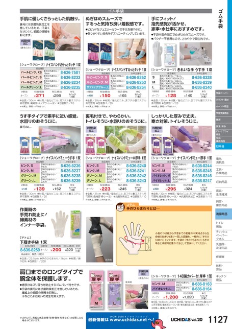 ゴム手袋手にフィット!指先感覚が活かせ、家事・水仕事におすすめです。●手袋内面の加工でぬぎはめがスムーズです。●パウダー不使用なので、さわやかで衛生的です。ゴム手袋ぬぎはめスムーズでするっと気持ち良い着脱感です。●ビビッドなジュエリーカラーで手元を華やかに。●傷つきやすい指先をダブルコーティングしています。手肌に優しくさらっとした肌触り。裏毛には抗菌防臭加工を施しているため、汗臭くなりにくく、細菌の増殖を抑えます。抗菌防臭加工(裏毛のみ)使用例[ショーワグローブ]ナイスハンドさらっとタッチ1双商品種別パールピンク、XSパールピンク、Sパールピンク、Mパールグリーン、L手のひらまわり/18cm手のひらまわり/19cm手のひらまわり/20cm手のひらまわり/22cmお申込番号8-636-75818-636-82338-636-82348-636-8235税抜価格¥271M価税抜オープン●全長/30cm●材質/塩化ビニル、非フタル酸エステル系可塑剤、繊維部:キュプラ・レーヨン●包装数:1/10※材質上、調理には不向きです。税込価格¥2981パック(1双)単位使用例使用例[ショーワグローブ]ナイスハンドするっとタッチ1双[ショーワグローブ]きれいな手うす手1双商品種別ルビーピンク、Sルビーピンク、Mサファイアブルー、L手のひらまわり/19cm手のひらまわり/20cm手のひらまわり/22cmM価税抜¥158税抜価格¥150税込価格¥165お申込番号8-636-82528-636-82538-636-8254単位1パック(1双)●全長/30cm●材質/塩化ビニル、非フタル酸エステル系可塑剤●包装数:1/20※材質上、調理には不向きです。商品種別手のひらまわり/19cm、型式/4901792034272手のひらまわり/20cm、型式/4901792034289手のひらまわり/22cm、型式/4901792034296SMLお申込番号8-636-83388-636-83398-636-8340税抜価格¥128M価税抜オープン●全長/30cm●材質/塩化ビニル、非フタル酸エステル系可塑剤●包装数:1/20※材質上、調理には不向きです。税込価格¥1401パック(1双)単位うす手タイプで素手に近い感覚。水回りのおそうじに。裏毛付きで、やわらかい。トイレそうじ・水回りのおそうじに。しっかりした厚みで丈夫。寒さ対策、トイレそうじに。裏毛なし。抗菌防臭加工(裏毛のみ)抗菌防臭加工(裏毛のみ)使用例使用例使用例[ショーワグローブ]ナイスハンドミューうす手1双[ショーワグローブ]ナイスハンドミュー中厚手1双[ショーワグローブ]ナイスハンドミュー厚手1双商品種別ピンク、Sピンク、Mグリーン、Mグリーン、L手のひらまわり/19cm手のひらまわり/20cm手のひらまわり/20cm手のひらまわり/22cmお申込番号8-636-82368-636-82378-636-82388-636-8239M価税抜¥148税抜価格¥139税込価格¥152単位1パック(1双)●全長/30cm●材質/塩化ビニル、非フタル酸エステル系可塑剤●包装数:1/20※材質上、調理には不向きです。作業時の手荒れ防止に!綿素材のインナー手袋。商品種別ピンク、Sピンク、Mグリーン、Mグリーン、L手のひらまわり/19cm手のひらまわり/20cm手のひらまわり/20cm手のひらまわり/22cmお申込番号8-636-82408-636-82418-636-82428-636-8243商品種別ピンク、Sピンク、Mバイオレット、Mバイオレット、L手のひらまわり/19cm手のひらまわり/20cm手のひらまわり/20cm手のひらまわり/22cmお申込番号8-636-82448-636-82458-636-82468-636-8247税抜価格¥223M価税抜オープン●全長/31cm●材質/塩化ビニル、非フタル酸エステル系可塑剤、繊維部:綿・レーヨン●抗菌防臭加工●包装数:1/10※材質上、調理には不向きです。税込価格¥2451パック(1双)単位M価税抜¥298税抜価格¥295税込価格¥324単位1パック(1双)●全長/32cm●材質/塩化ビニル、非フタル酸エステル系可塑剤、繊維部:綿・レーヨン●抗菌防臭加工●包装数:1/10※材質上、調理には不向きです。手のひらまわりとは…学習ペーパークラフト・素材イベント用品学習支援用品保育安全・安心OA・サプライ用品文具・事務用品日用品電化化消耗品耗工具・具・作業用品業収納用品納雨具・具・生活雑貨活飼育・育・園芸用品芸清掃用品トイレレ用品品ティッシュティッシュペーパー・パタオルル洗面所・洗面所・洗濯用品濯保健室保健室飲料・料・食品食品キッチンキッチン用品品[アトム]下履き手袋1双お申込番号M価税抜8-636-8259オープン商品種別型式/2030税抜価格¥200税込価格¥220単位1パック(1双)小指のつけ根から手首までの距離の中間地点から生命線の始まりを通り一周した距離を、一般的に『手のひらまわり』といいます。手袋の『手のひらまわり』も手の場合とほぼ同位置の寸法として目安にしてください。●全長/25.5cm●手のひらまわり/16cm●材質/綿100%●包装数:1/200使用例肩口までのロングタイプで腕全体を保護します。●裾部分はズリ落ちを防止するゴムバンド付きです。●手袋の裏毛には抗菌防臭加工を施しているため、繊維上の細菌の増殖を抑制し、汗などによる臭いの発生を抑えます。使用例抗菌防臭加工(裏毛のみ)[ショーワグローブ]140腕カバー付厚手1双商品種別ピンク、Mバイオレット、L手のひらまわり/20cm手のひらまわり/22cmお申込番号8-636-81638-636-8164税抜価格¥1,200M価税抜オープン●全長/M:60cm、L65cm●材質/塩化ビニル、非フタル酸エス