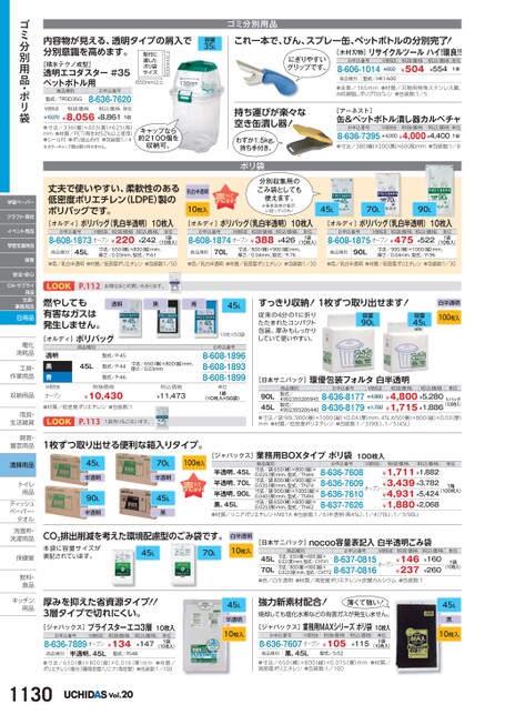 ゴミ分別用品これ一本で、びん、スプレー缶、ペットボトルの分別完了!にぎりやすいグリップです。持ち運びが楽々な空き缶潰し器!わずか1.5kg。持ち手付き。ポリ袋[木村刃物]リサイクルツールハイ!環良!!お申込番号8-606-1014M価税抜¥650税抜価格¥504税込価格単位¥5541本商品種別型式/HK1-600●全長/165mm●材質/刃物用特殊ステンレス鋼、ABS樹脂、ポリプロピレン●包装数:1/5[アーネスト]缶&ペットボトル潰し器カルペチャお申込番号M価税抜税抜価格税込価格単位8-636-7395¥4,000¥4,000¥4,4001台●寸法/380幅)×200(奥)×60高)mm●包装数:1/8乳白半透明分別収集用のごみ袋としても使えます。10枚入[オルディ]ポリバッグ(乳白半透明)10枚入※各自治体の指示に従ってくださいお申込番号M価税抜税抜価格8-608-1874オープン¥388税込価格¥426単位1袋(10枚入)45L[オルディ]ポリバッグ(乳白半透明)10枚入70L90Lお申込番号M価税抜税抜価格8-608-1875オープン¥475税込価格¥522単位1袋(10枚入)商品種別70L寸法/800(横)×900(縦)mm、厚さ/0.04mm、型式/P-76商品種別90L寸法/900横)×1000縦)mm、厚さ/0.04mm、型式/P-96内容物が見える、透明タイプの屑入で分別意識を高めます。容量35L650mm以上136mm800mm以上取付に適したポリ袋サイズ[積水テクノ成型]透明エコダスター#35ペットボトル用商品種別型式/TPDD35Gお申込番号8-636-7620M価税抜税抜価格税込価格単位¥10,070¥8,056¥8,8611台●寸法/336(幅)×403奥)×625(高)mm●材質/PET(再生材52%以上使用)●シール付●ポリ袋止め付●包装数:1/4※カラーキャップ部は取り外せません。キャップなら約2100個を収納可。丈夫で使いやすい、柔軟性のある低密度ポリエチレン(LDPE)製のポリバッグです。[オルディ]ポリバッグ(乳白半透明)10枚入お申込番号M価税抜税抜価格8-608-1873オープン¥220税込価格¥242単位1袋(10枚入)商品種別45L寸法/650横)×800縦)mm、厚さ/0.03mm、型式/P-61ゴミ分別用品・ポリ袋学習ペーパークラフト・素材イベント用品学習支援用品保育安全・安心OA・サプライ用品文具・事務用品日用品電化電化消耗品消耗品工具・工具作業用品作業用収納用品収納用雨具・雨具生活雑貨生活雑飼育・飼育園芸用品園芸用清掃用品トイレトイ用品用品ティッシュティッシュペーパー・タオルタオル洗面所・洗面所・洗濯用品洗濯用保健室保健室飲料・飲料食品食品キッチンキッチン用品用品●色/乳白半透明●材質/低密度ポリエチレン●包装数:1/50●色/乳白半透明●材質/低密度ポリエチレン●包装数:1/30●色/乳白半透明●材質/低密度ポリエチレン●包装数:1/30お得なまとめ買いもあります。透明黒青45LP.112LOOK燃やしても有害なガスは発生しません。[オルディ]ポリバッグ商品種別透明黒青M価税抜オープン45L型式/P-45型式/P-44型式/P-46税抜価格¥10,430寸法/650(横)×800縦)mm、厚さ/0.03mm税込価格¥11,473●材質/低密度ポリエチレン●包装数:1LOOKP.1131袋売りもございます。1枚ずつ取り出せる便利な箱入りタイプ。45L半透明90L半透明100枚入70L半透明45L黒10枚×50袋お申込番号8-608-18968-608-18938-608-1899単位1組(10枚入×50袋)すっきり収納!1枚ずつ取り出せます!従来の4分の1に折りたたまれたコンパクト包装。厚みもしっかりしていて使いやすい。容量90L容量45L白半透明100枚入[日本サニパック]環優包装フォルタ白半透明お申込番号商品種別型式/4902393206945型式/490239320644090L45L●寸法/袋:90L:900横)×1000(縦)×0.04(厚)mm、45L:650横)×800(縦)×0.03(厚)mm●材質/低密度ポリエチレン●包装数:1/3(90L)、1/5(45L)¥4,980¥4,800¥5,2801パック¥1,780¥1,715¥1,8868-636-81778-636-8179(100枚入)税込価格税抜価格M価税抜単位[ジャパックス]業務用BOXタイプポリ袋100枚入M価税抜お申込番号半透明、45L半透明、70L半透明、90L黒、45L●材質/リニアポリエチレン+META●包装数:1/6(半透明・黒45L)、1/4(70L)、1/3(90L)商品種別寸法/袋:650横)×800(縦)×0.025(厚)mm、型式/TN44寸法/袋:800横)×900(縦)×0.035(厚)mm、型式/TN74寸法/袋:900横)×1000(縦)×0.040(厚)mm、型式/TN94寸法/袋:650横)×800(縦)×0.025(厚)mm、型式/TN428-636-76088-636-76098-636-76108-637-7626¥1,711¥1,882¥3,439¥3,782¥4,931¥5,424¥1,880¥2,068税抜価格税込価格オープン単位1箱(100枚入)CO2排出削減を考えた環境配慮型のごみ袋です。本袋に容量サイズが表記されています。45L70L白半透明10枚入厚みを抑えた省資源タイプ!!3層タイプで切れにくい。[ジャパックス]プライスターエコ3層10枚入お申込番号M価税抜8-636-7889オープン半透明、45L商品種別税抜価格¥134税込価格¥147単位1袋(10枚入)型式/PS4845L半透明10枚入[日本サニパック]nocoo容量表記入白半透明ごみ袋商品種別お申込番号M価税抜税抜価格寸法/650(横)×800縦)×0.02厚)mm、型式/CHT41寸法/800(横)×900縦)×0.023厚)mm、型式/CHT7245L70L●色/白半透明●材質/高密度ポリエチレン+炭酸カルシウム●包装数:18-637-0815オープン¥146¥2378-637-0816税込価格¥160¥260単位1袋(10枚入)強力新素材配合!薄くて強い!焼却しても塩化水素などの有害ガスが発生しません。業務用MAXシリーズポリ袋10枚入[ジャパックス]お申込番号M価税抜8-636-7607オープン商品種別黒、45L税抜価格¥105型式/S-52税込価格¥115単位1袋(10枚入)●寸法/650(横)×800(縦)×0.015(厚)mm●材
