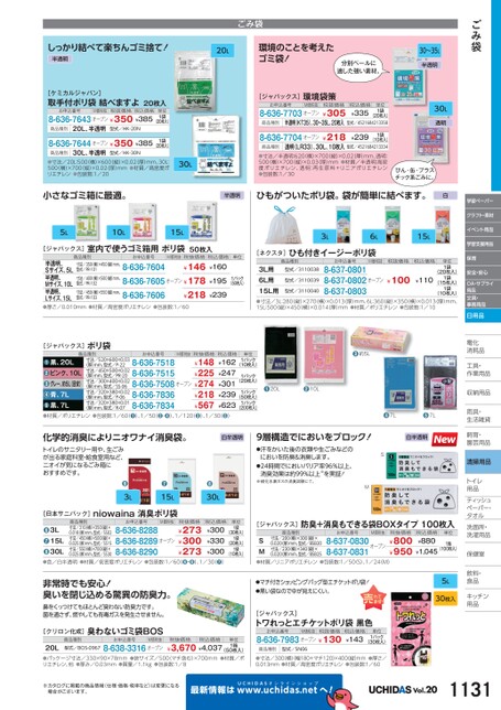 ごみ袋学習ペーパークラフト・素材イベント用品学習支援用品保育安全・安心OA・サプライ用品文具・事務用品日用品電化化消耗品耗工具・具・作業用品業収納用品納雨具・具・生活雑貨活飼育・育・園芸用品芸清掃用品トイレレ用品品ティッシュティッシュペーパー・パタオルル洗面所・洗面所・洗濯用品濯保健室保健室飲料・料・食品食品キッチンキッチン用品品ごみ袋しっかり結べて楽ちんゴミ捨て!半透明20L環境のことを考えたゴミ袋!分別ペールに適した強い素材。[ケミカルジャパン]取手付ポリ袋結べますよ20枚入お申込番号M価税抜税抜価格税込価格8-636-7643オープン¥350¥385単位1袋(20枚入)商品種別20L、半透明型式/HK-20N8-636-7644オープン¥350¥3851袋(20枚入)30L、半透明型式/HK-30N商品種別●寸法/20L:500横)×600(縦)×0.02厚)mm、30L:500(横)×700(縦)×0.02(厚)mm●材質/高密度ポリエチレン●包装数:1/2030L[ジャパックス]環境袋策商品種別お申込番号8-636-7703オープンM価税抜税抜価格¥305半透明(KT35)、30〜35L、20枚入¥218透明(LR33)、30L、10枚入8-636-7704オープン税込価格¥335単位1袋(20枚入)型式/4521684213358¥2391袋(10枚入)商品種別型式/4521684213334●寸法/半透明:620(横)×700(縦)×0.02(厚)mm、透明:500(横)×700(縦)×0.03(厚)mm●材質/半透明:高密度ポリエチレン、透明:再生原料+リニアポリエチレン●包装数:1/3030〜35L半透明30L透明びん・缶・プラスチック系ごみに。小さなゴミ箱に最適。半透明ひもがついたポリ袋。袋が簡単に結べます。白5L10L15L[ジャパックス]室内で使うゴミ箱用ポリ袋50枚入商品種別お申込番号半透明、Sサイズ、5L半透明、Mサイズ、10L半透明、Lサイズ、15L●厚さ/0.010mm●材質/高密度ポリエチレン●包装数:1/60寸法/350横)×450(縦)mm、型式/PR-101寸法/400横)×500(縦)mm、型式/PR-102寸法/450横)×550(縦)mm、型式/PR-1038-636-76048-636-76058-636-7606オープン¥146¥178¥218M価税抜税抜価格税込価格¥160単位¥1951パック(50枚入)¥2393L6Lひも付きイージーポリ袋[ネクスタ]15L商品種別お申込番号M価税抜税抜価格税込価格型式/3110038型式/31100393L用6L用15L用(10枚入)●寸法/3L:280縦)×270横)×0.013(厚)mm、6L:360(縦)×350(横)×0.013厚)mm、15L:500縦)×450横)×0.014(厚)mm●材質/ポリエチレン●包装数:1/108-637-08018-637-08028-637-0803¥100型式/3110040(20枚入)(15枚入)¥110オープン1袋1袋単位1袋●約5L●20L●10L●7L●7Lお申込番号8-636-75188-636-75158-636-75088-636-78368-636-7834M価税抜税抜価格税込価格¥162¥247¥301¥239¥623¥148¥225¥274¥218¥567オープン単位1パック(10枚入)1パック(20枚入)1パック(50枚入)1パック(200枚入)寸法/520×600×0.03(厚)mm、型式/P-22寸法/450×500×0.02(厚)mm、型式/PR-20寸法/300×400×0.02(厚)mm、型式/SS-06寸法/320×380×0.02(厚)mm、型式/P-06寸法/320×380×0.01(厚)mm、型式/R-07黒、20Lピンク、10Lグレー、約5L(目安)青、7L黒、7L●●●●●[ジャパックス]ポリ袋商品種別●材質/ポリエチレン●包装数:1/60(❶)、1/50(❷・❹)、1/120(❸)、1/30(❺)化学的消臭によりニオワナイ消臭袋。白半透明9層構造でにおいをブロック!白半透明[ジャパックス]商品種別防臭+消臭もできる袋BOXタイプ100枚入お申込番号M価税抜寸法/200横)×300縦)×0.020(厚)mm、型式/BSB20寸法/230横)×340縦)×0.020(厚)mm、型式/BSB25SM●材質/リニアポリエチレン●包装数:1/50(S)、1/24M)8-637-0830オープン8-637-0831税抜価格税込価格¥800¥880¥950¥1,045単位1箱(100枚入)単位1袋(30枚入)(20枚入)1袋1袋(10枚入)M価税抜お申込番号3L15L30L税込価格¥300¥330●¥300●●色/白半透明●材質/低密度ポリエチレン●包装数:1/60❻・❽)、1/30(❼)商品種別寸法/310横)×350縦)×0.018厚)mm、型式/SS02寸法/450横)×500縦)×0.025厚)mm、型式/SS15寸法/550横)×700縦)×0.025厚)mm、型式/SS308-636-82888-636-82898-636-8290¥273¥300¥273税抜価格オープン●非常時でも安心!臭いを閉じ込める驚異の防臭力。鼻をくっつけてもほとんど臭わない防臭力です。菌を通さず、燃やしても有毒ガスを発生させません。[クリロン化成]臭わないゴミ袋BOS商品種別型式/BOS-0967お申込番号M価税抜税抜価格税込価格20L(50枚入)●パッケージ寸法/330×90×78mm●袋サイズ/500マチ含む)×700mm●材質/ポリエチレン、他●厚み/0.03mm●質量/1.1kg●包装数:1/88-638-3316オープン¥3,670¥4,037単位1箱●マチ付きショッピングバッグ型エチケットポリ袋!●黒い袋なので中が見えにくい。5L30枚入[ジャパックス]トワれっとエチケットポリ袋黒色お申込番号M価税抜税抜価格8-636-7983オープン¥130税込価格¥143単位1パック(30枚入)商品種別型式/SN06●寸法/300横)(幅180+マチ120)×400縦)mm●厚さ/0.013mm●材質/高密度ポリエチレン●包装数:1/60トイレのサニタリー用や、生ごみが出る家庭科室・給食室用など、ニオイが気になるごみ箱におすすめです。●●[日本サニパック]3L15Lniowaina消臭ポリ袋●汗をかいた後の衣類や生ごみなどのにおいを防臭&消臭します。●24時間でにおいバリア率96%以上、消臭効果は約99%以上※を実証!※硫化水素ガスの消臭試験にて。SM●30L※カタログに掲載の商品情報(仕様・価格・税率など)は変更になる場合がございます。最新情報はUCHIDASww.uchidas.netwへ!Vol.201131