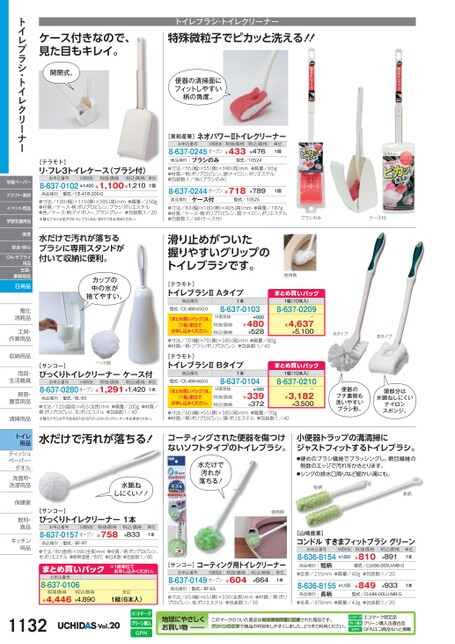 ケース付きなので、見た目もキレイ。開閉式。トイレブラシ・トイレクリーナー特殊微粒子でピカッと洗える!!便器の清掃面にフィットしやすい柄の角度。[テラモト]リ・フレ3トイレケース(ブラシ付)お申込番号M価税抜税抜価格税込価格8-637-0102¥1,400¥1,100¥1,210単位1個商品種別型式/CE-418-200-0●寸法/100(幅)×110(奥)×395(高)mm●質量/250g●材質/ケース・柄:ポリプロピレン、ブラシ:ポリエステル●色/ケース・柄:アイボリー、ブラシ:グレー●包装数:1/20※替えブラシは右下のトイレブラシⅡA・Bタイプをお求めください。水だけで汚れが落ちるブラシに専用スタンドが付いて収納に便利。カップの中の水が捨てやすい。ヘッド部[サンコー]びっくりトイレクリーナーケース付お申込番号M価税抜税抜価格税込価格8-637-0280オープン¥1,291¥1,420単位1本商品種別型式/BL-93●寸法/120直径)×455全長)mm●質量/200g●材質/柄:ポリプロピレン、毛:ポリエステル●包装数:1/40※替えブラシは下の8-637-0157びっくりトイレクリーナーをお求めください。水だけで汚れが落ちる![東和産業]ネオパワーⅡトイレクリーナーお申込番号M価税抜税抜価格8-637-0245オープン¥433税込価格¥476単位1個商品種別ブラシのみ型式/10524●寸法/55(幅)×55(奥)×390(高)mm●質量/65g●材質/柄:ポリプロピレン、頭:ナイロン、ポリエステル●包装数:1/96(ブラシのみ)8-637-0244オープン¥718¥7891個商品種別ケース付型式/10525●寸法/83(幅)×100(奥)×405(高)mm●質量/187g●材質/ケース・柄:ポリプロピレン、頭:ナイロン、ポリエステル●包装数:1/48(ケース付)ブラシのみケース付滑り止めがついた握りやすいグリップのトイレブラシです。使用例[テラモト]トイレブラシⅡAタイプ商品種別型式/CE-488-650-0「まとめ買いパック」は、「1組」単位でお申し込みください。1本8-637-0103M価税抜税抜価格税込価格¥680¥480¥528まとめ買いパック1組(10本入)8-637-0209ー¥4,637¥5,100●寸法/70幅)×70奥)×385高)mm●質量/80g●材質/柄・ブラシ:ポリプロピレン●包装数:1/40[テラモト]トイレブラシⅡBタイプ商品種別型式/CE-488-660-0「まとめ買いパック」は、「1組」単位でお申し込みください。1本8-637-0104M価税抜税抜価格税込価格¥480¥339¥372まとめ買いパック1組(10本入)8-637-0210ー¥3,182¥3,500●寸法/60幅)×55奥)×385高)mm●質量/70g●材質/柄:ポリプロピレン、頭:ポリエステル●包装数:1/40AタイプBタイプ便器のフチ裏側も洗いやすいブラシ形。頭部分は水跳ねしにくいナイロンスポンジ。コーティングされた便器を傷つけないソフトタイプのトイレブラシ。小便器トラップの溝清掃にジャストフィットするトイレブラシ。水だけで汚れが落ちる!水跳ねしにくい!![サンコー]びっくりトイレクリーナー1本お申込番号M価税抜8-637-0157オープン税抜価格¥758税込価格¥833単位1本商品種別型式/BF-97●寸法/80(直径)×390全長)mm●材質/柄:ポリプロピレン、毛:ポリエステル●耐熱温度/80℃●日本製●包装数:1/80まとめ買いパック8-637-0106お申込番号税抜価格税込価格¥4,446¥4,890※1組単位申込。[サンコー]コーティング用トイレクリーナーお申込番号M価税抜8-637-0149オープン税抜価格¥604税込価格¥664単位1本単位1組(6本入)商品種別型式/BF-65●寸法/65幅)×65奥)×330全長)mm●材質/柄:ポリプロピレン、毛:ポリエステル●包装数:1/30●硬めのブラシ繊維でブラッシングし、網目繊維の無数のエッジで汚れをかきとります。●シンクの排水口周りなど細かい溝にも。短柄長柄使用例[山崎産業]コンドルすきまフィットブラシグリーンお申込番号8-636-8154M価税抜¥1,50税抜価格¥810税込価格¥891単位1本商品種別短柄型式/CL686-00SU-MB-G●全長/235mm●質量/40g●包装数:1/208-636-8155商品種別長柄¥1,00¥849¥9331本型式/CL686-00LU-MB-G●全長/370mm●質量/42g●包装数:1/20トイレブラシ・トイレクリーナー学習ペーパークラフト・素材イベント用品学習支援用品保育安全・安心OA・サプライ用品文具・事務用品日用品電化電化消耗品消耗品工具・工具作業用品作業用収納用品収納用雨具・雨具生活雑貨生活雑飼育・飼育園芸用品園芸用清掃用品清掃用トイレ用品ティッシュティッシュペーパー・タオルタオル洗面所・洗面所・洗濯用品洗濯用保健室保健室飲料・飲料食品食品キッチンキッチン用品用品1132Vol.20地球にやさしくお買い物このマークのついた商品は地球環境保護に配慮された商品です。グリーンの文字で商品の判別をしやすくしました。どうぞご利用ください。エコマーク認定品グリーン購入法適合品GPNエコ商品ねっと掲載