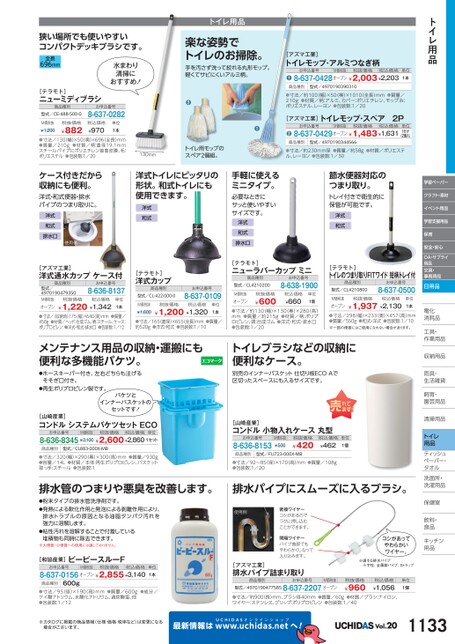 [アズマ工業]トイレモップ・スペア2Pお申込番号M価税抜税抜価格税込価格8-637-0429オープン¥1,483¥1,631単位1セット(2個入)●商品種別型式/4970190344566●寸法/約230mm径●質量/約58g●材質/ポリエステル、レーヨン●包装数:1/30節水便器対応のつまり取り。トレイ付きで衛生的に保管が可能です。洋式和式●手軽に使えるミニタイプ。必要なときにサッと使いやすいサイズです。洋式和式排水口[テラモト]ニューラバーカップミニ商品種別型式/CL4210200お申込番号8-638-1900単位1個税抜価格¥600税込価格¥660M価税抜オープン●寸法/約130(幅)×130奥)×280(高)mm●質量/約215g●材質/柄:ポリプロピレン、頭:合成ゴム●洋式・和式・排水口●包装数:1/20[テラモト]トイレのつまり取りFITワイド短柄トレイ付商品種別型式/CL4210800お申込番号8-637-0500税込価格税抜価格¥1,937¥2,130M価税抜オープン●寸法/298(幅)×233(奥)×457(高)mm●質量/550g●和式・洋式●包装数:1/10※一部の便器にはご使用になれない場合があります。単位1本トイレブラシなどの収納に便利なケース。別売のインナーバスケット仕切り板ECOAで区切ったスペースにも入るサイズです。[山崎産業]コンドル小物入れケース丸型お申込番号8-636-8153M価税抜¥500税抜価格¥420税込価格¥462単位1個商品種別型式/FU723-000X-MB●寸法/92〜85(径)×170(高)mm●質量/108g●包装数:1/20排水パイプにスムーズに入るブラシ。使用例密接ワイヤーコシがあるのでラクに押し込むことができます。間隔ワイヤーパイプ曲部でもやわらかくしなって入り込みます。[アズマ工業]排水パイプ詰まり取り商品種別お申込番号M価税抜型式/49701904775858-637-2207オープンコシがあってやわらかいワイヤー。※適する排水パイプ十字栓、金属製パイプ、Sトラップ税抜価格¥960税込価格¥1,056単位1個学習ペーパークラフト・素材イベント用品学習支援用品保育安全・安心OA・サプライ用品文具・事務用品日用品電化化消耗品耗工具・具・作業用品業収納用品納雨具・具・生活雑貨活飼育・育・園芸用品芸清掃用品掃トイレ用品ティッシュティッシュペーパー・パタオルル洗面所・洗面所・洗濯用品濯保健室保健室飲料・料・食品食品キッチンキッチン用品品●寸法/約900(長)mm、ブラシ径40mm●質量/60g●材質/ブラシ:ナイロン、ワイヤー:ステンレス、グリップ:ポリプロピレン●包装数:1/40UCHIDASww.uchidas.netwへ!Vol.201133●●寸法/約100(幅)×50(奥)×1010(全長)mm●質量/210g●材質/柄:アルミ、カバー:ポリエチレン、モップ糸:ポリエステル、レーヨン●包装数:1/20トイレ用品単位1本[アズマ工業]トイレモップ・アルミつなぎ柄お申込番号M価税抜税抜価格税込価格8-637-0428オープン¥2,003¥2,203●商品種別型式/4970190390310狭い場所でも使いやすいコンパクトデッキブラシです。全長696mm水まわり清掃におすすめ!トイレ用品楽な姿勢でトイレのお掃除。手を汚さず洗って絞れる丸形モップ。軽くてサビにくいアルミ柄。[テラモト]ニューミディブラシ商品種別型式/CE-488-500-0お申込番号8-637-0282M価税抜¥1,200税抜価格¥882税込価格¥970単位1本●寸法/130(幅)×50奥)×696全長)mm●質量/210g●材質/柄:直径19.1mmスチールパイプにポリエチレン接着皮膜、毛:ポリエステル●包装数:1/20ケース付きだから収納にも便利。洋式・和式便器・排水パイプのつまり取りに。洋式和式排水口使用例[アズマ工業]洋式通水カップケース付商品種別お申込番号税抜価格8-636-8137型式/4970190479350M価税抜オープン●寸法/(収納時)175(幅)×640(高)mm●質量/458g●材質/ヘッド:合成ゴム、柄:スチール、ケース:ポリプロピレン●洋式・和式・排水口●包装数:1/12¥1,220¥1,342税込価格単位1本130mmトイレ用モップのスペア2個組。洋式トイレにピッタリの形状。和式トイレにも使用できます。洋式和式[テラモト]洋式カップ商品種別型式/CL-422-000-0お申込番号8-637-0109M価税抜¥1,600税抜価格税込価格¥1,200¥1,320単位1本●寸法/165(直径)×655(全長)mm●質量/約520g●洋式・和式●包装数:1/10メンテナンス用品の収納・運搬にも便利な多機能バケツ。●ホースキーパー付き、左右どちらも注げるそそぎ口付き。●再生ポリプロピレン製です。バケツとインナーバスケットのセットです![山崎産業]コンドルシステムバケツセットECOお申込番号M価税抜税抜価格税込価格単位8-636-8345¥3,100¥2,600¥2,8601セット商品種別型式/CL883-000X-MB●寸法/320(幅)×290奥)×300高)mm●質量/930g●容量/14L●材質/本体:再生ポリプロピレン、バスケット取っ手:スチール●包装数:1排水管のつまりや悪臭を改善します。●粉末タイプの排水管洗浄剤です。●発熱による軟化作用と発泡による剥離作用により、排水トラブルの原因となる油脂タンパク汚れを強力に溶解します。●粘性汚れを溶解することで付着している堆積物も同時に除去できます。※大便器・小便器への使用には適しておりません。[和協産業]ピーピースルーFお申込番号M価税抜税抜価格税込価格8-637-0156オープン¥2,855¥3,140単位1本商品種別600g●寸法/95(径)×190(高)mm●質量/600g●成分/ケイ酸ナトリウム、水酸化ナトリウム、過炭酸塩、他●包装