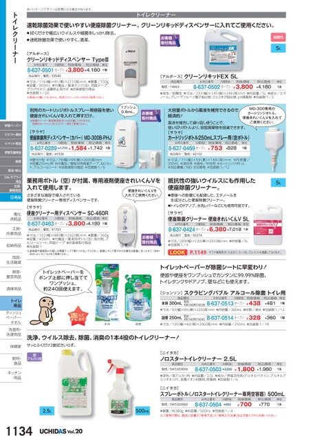 ※パッケージデザインは変更になる場合があります。トイレクリーナー速乾除菌効果で使いやすい便座除菌クリーナー。クリーンリキッドディスペンサーに入れてご使用ください。●拭くだけで幅広いウイルスや細菌をしっかり除去。●速乾除菌効果で使いやすく、清潔。弱酸性[アルボース]クリーンリキッドディスペンサーTypeⅢお申込番号M価税抜税抜価格税込価格8-637-0501オープン¥3,800¥4,180単位1個商品種別型式/33540●寸法/116(幅)×91(奥)×215(高)mm●質量/330g●容量/500mL●付属品/薬液タンク(空)、両面テープ、プラグ付ネジ、盗難防止用カギ●お客様取付商品●包装数:1/20※薬液は付属しておりません。別売のクリーンリキッドEXをご使用ください。別売のカートリッジボトルスプレー用容器を使い便座きれいくんVを入れて押すだけ。※除菌クリーナー薬液専用空ボトルは付属しておりません。別売のカートリッジボトルスプレー用をご使用ください。1プッシュ0.8mL。[サラヤ]便座除菌用ディスペンサー(カバー)MD-300B-PHJお申込番号M価税抜税抜価格税込価格8-637-0289¥1,770¥1,584¥1,742単位1個[アルボース]クリーンリキッドEX5L商品種別型式/14663お申込番号M価税抜8-637-0502オープン税抜価格¥3,8005L税込価格¥4,180単位1本●液性/弱酸性●寸法/233(幅)×145(奥)×246(高)mm●内容量/5L●成分/エタノール、グレープフルーツ種子抽出物、さとうきび抽出物、pH調整剤●包装数:1/3MD-300専用のカートリッジボトル。便座きれいくんVを入れてご使用ください。大容量ボトルから薬液を補充できるので経済的!薬液を補充して繰り返し使うことで、使い切りボトルより、容器廃棄物を削減できます。[サラヤ]カートリッジボトル250mLスプレー用(空ボトル)お申込番号M価税抜8-637-0469オープン税抜価格¥753税込価格¥828単位1個商品種別型式/41938●壁付け型●寸法/79(幅)×99(奥)×203(高)mm●容量250mL用●付属品/壁取付用両面テープ、ねじセット、アルコールシート●お客様取付商品●包装数:1/6商品種別型式/42102●寸法/71(幅)×59(奥)×186(高)mm●内容量/250mL●液状用●液性/中性用●カートリッジボトル●対応機種/MD-300専用●包装数:1/12業務用ボトル(空)が付属、専用液剤便座きれいくんVを入れて使用します。便座きれいくんVを入れてご使用ください。さまざまな施設で導入されている便座除菌クリーナー専用ディスペンサーです。[サラヤ]便座クリーナー用ディスペンサーSC-460Rお申込番号M価税抜税抜価格税込価格8-637-0463オープン¥3,800¥4,180単位1個商品種別型式/41753●寸法/102(幅)×88(奥)×242(高)mm●質量/360g●容量/450mL●付属品/薬液用ボトル(空)、取付板、アルコールシート、両面テープ●お客様取付商品●包装数:1※塗装面や壁紙貼りの壁には両面テープで取りつけないでください。壁面にネジで取り付ける場合は壁面に合ったネジ(M4×25タッピンネジ)などをご用意ください。抵抗性の強いウイルスにも作用した便座除菌クリーナー。5L●便座への影響にも配慮した、エタノールを主成分とした便座除菌クリーナー。●トイレのドアノブ、水洗レバーなどにも使用可能です。[サラヤ]便座除菌クリーナー便座きれいくんV5Lお申込番号M価税抜税抜価格税込価格8-637-0424オープン¥6,380¥7,018単位1本商品種別型式/50274●寸法/209幅)×120奥)×293高)mm●内容量/5L●包装数:1/3P.1149サラヤ業務用ボトル注ぎ口カップ&ノズルセットを掲載しております。トイレットペーパーをポンプ上部に押し当ててワンプッシュ。約240回使えます。トイレットペーパーが除菌シートに早変わり!便器や便座をワンプッシュでカンタンに99.99%除菌。トイレタンクやドアノブ、壁などにも使えます。[ジョンソン]スクラビングバブルアルコール除菌トイレ用商品種別お申込番号M価税抜税抜価格本体300mL●寸法/93幅)×65(奥)×220(高)mm●内容量/300mL●状態/液状●包装数:1/128-637-0513オープン型式/4901609016538¥438税込価格¥481単位1個本体詰替詰替250mL●寸法/120(幅)×60(奥)×200(高)mm●内容量/250mL●包装数:1/188-637-0514オープン型式/4901609016545¥328¥3601個洗浄、ウイルス除去、除菌、消臭の1本4役のトイレクリーナー![ニイタカ]ノロスタートイレクリーナー2.5L商品種別型式/SW5303050お申込番号M価税抜8-637-0503¥2,250税抜価格¥1,800税込価格¥1,980単位1本●液性/弱アルカリ性●内容量/2.5L●成分/界面活性剤(アルキルベタイン、アルキルアミンオキシド)、金属イオン封鎖剤、除菌剤●包装数:1/6[ニイタカ]スプレーボトル(ノロスタートイレクリーナー専用空容器)500mL商品種別型式/SW5303060お申込番号8-637-0504M価税抜¥950税抜価格¥700税込価格¥770単位1本●質量/約380g●内容量/500mL●包装数:1/4※ご使用の際は、製品に記載の「使用方法」と「使用上の注意」を必ず読んでからお使いください。サッとふくだけ2度拭きいらず。弱アルカリ性2.5L500mL1134Vol.20トイレクリーナー学習ペーパークラフト・素材イベント用品学習支援用品保育安全・安心OA・サプライ用品文具・事務用品日用品電化電化消耗品消耗品工具・工具作業用品作業用収納用品収納用雨具・雨具生活雑貨生活雑飼