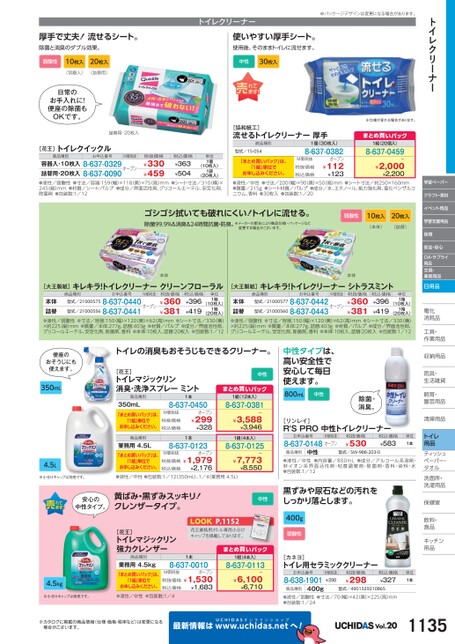 トイレクリーナー学習ペーパークラフト・素材イベント用品学習支援用品保育安全・安心OA・サプライ用品文具・事務用品日用品電化化消耗品耗工具・具・作業用品業収納用品納雨具・具・生活雑貨活飼育・育・園芸用品芸清掃用品掃トイレ用品ティッシュティッシュペーパー・パタオルル洗面所・洗面所・洗濯用品濯保健室保健室飲料・料・食品食品キッチンキッチン用品品厚手で丈夫!流せるシート。除菌と消臭のダブル効果。弱酸性10枚入20枚入(容器入)(詰替用)日常のお手入れに!便座の除菌もOKです。詰替用・20枚入※パッケージデザインは変更になる場合があります。トイレクリーナー使いやすい厚手シート。使用後、そのままトイレに流せます。中性30枚入※仕様が変わる場合があります。[協和紙工]流せるトイレクリーナー厚手まとめ買いパック1組(20個入)8-637-0459ー¥2,000¥2,200[花王]トイレクイックル商品種別お申込番号M価税抜容器入・10枚入8-637-0329オープン詰替用・20枚入8-637-0090税抜価格¥330¥459税込価格¥363¥504単位1個1袋(10枚入)(20枚入)商品種別型式/15-054「まとめ買いパック」は、「1組」単位でお申し込みください。1個(30枚入)8-637-0382オープン¥112¥123M価税抜税抜価格税込価格●液性/弱酸性●寸法/容器:159(幅)×118(奥)×75(高)mm●シート寸法/310(横)×245縦)mm●材質/シート:パルプ●成分/界面活性剤、グリコールエーテル、安定化剤、除菌剤●包装数:1/12●液性/中性●寸法/200幅)×90奥)×50高)mm●シート寸法/約250×160mm●質量/215g●シート材質/パルプ●成分/水、エタノール、紙力強化剤、塩化ベンザルコニウム、香料●30枚入●包装数:1/20ゴシゴシ拭いても破れにくい!トイレに流せる。除菌99.9%&消臭&24時間抗菌・防臭。※メーカーの都合により商品仕様・パッケージなど変更する場合がございます。弱酸性10枚入20枚入(本体)(詰替)本体本体[大王製紙]キレキラ!トイレクリーナークリーンフローラル[大王製紙]キレキラ!トイレクリーナーシトラスミント商品種別お申込番号M価税抜税抜価格商品種別お申込番号M価税抜税抜価格型式/210005758-637-0440オープン型式/210005568-637-0441本体詰替(20枚入)●液性/弱酸性●寸法/容器:150(幅)×120(奥)×62(高)mm●シート寸法/330(横)×約225(縦)mm●質量/本体:277g、詰替:403g●材質/パルプ●成分/界面活性剤、グリコールエーテル、安定化剤、除菌剤、香料●本体:10枚入、詰替:20枚入●包装数:1/12¥360¥381(10枚入)1箱型式/210005778-637-0442オープン型式/210005608-637-0443本体詰替(20枚入)●液性/弱酸性●寸法/容器:150(幅)×120奥)×62(高)mm●シート寸法/330(横)×約225(縦)mm●質量/本体:277g、詰替:403g●材質/パルプ●成分/界面活性剤、グリコールエーテル、安定化剤、除菌剤、香料●本体:10枚入、詰替:20枚入●包装数:1/12¥360¥381(10枚入)1箱単位1箱税込価格¥396¥419単位1箱税込価格¥396¥419便座のおそうじにも使えます。350mL4.5Lトイレの消臭もおそうじもできるクリーナー。[花王]トイレマジックリン消臭・洗浄スプレーミント商品種別350mL「まとめ買いパック」は、「1組」単位でお申し込みください。商品種別業務用4.5L「まとめ買いパック」は、「1組」単位でお申し込みください。1本8-637-0450M価税抜税抜価格税込価格オープン¥299¥3281本8-637-0123オープンM価税抜税抜価格¥1,979¥2,176税込価格中性まとめ買いパック1組(12本入)8-637-0381ー¥3,588¥3,9461組(4本入)8-637-0125ー¥7,773¥8,550中性タイプは、高い安全性で安心して毎日使えます。800mL中性除菌・消臭。[リンレイ]R'SPRO中性トイレクリーナーお申込番号M価税抜8-637-0148オープン税抜価格¥530税込価格¥583単位1本商品種別中性型式/SW-988-203-0●液性/中性●内容量/800mL●成分/アルコール系溶剤・非イオン系界面活性剤・粘度調整剤・除菌剤・香料・染料・水●包装数:1/12※小分けキャップは別売です。●液性/中性●包装数:1/12(350mL)、1/4(業務用4.5L)安心の中性タイプ。黄ばみ・黒ずみスッキリ!クレンザータイプ。[花王]トイレマジックリン強力クレンザーP.1152花王業務用ボトル専用小分けキャップを掲載しております。中性黒ずみや尿石などの汚れをしっかり落とします。400g弱酸性4.5kg商品種別業務用4.5kg「まとめ買いパック」は、「1組」単位でお申し込みください。1本8-637-0010オープンM価税抜税抜価格¥1,530¥1,683税込価格※小分けキャップは別売です。●液性/中性●包装数:1/4※カタログに掲載の商品情報(仕様・価格・税率など)は変更になる場合がございます。最新情報はまとめ買いパック1組(4本入)8-637-0113ー¥6,100¥6,710[カネヨ]トイレ用セラミッククリーナーお申込番号8-638-1901400g商品種別M価税抜¥298税抜価格¥298税込価格¥327単位1本型式/4901329210865●液性/弱酸性●寸法/70幅)×42奥)×225高)mm●包装数:1/24UCHIDASww.uchidas.netwへ!Vol.201135