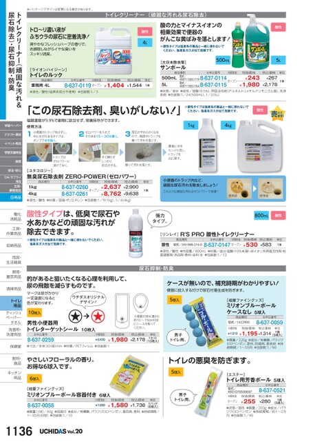 ※パッケージデザインは変更になる場合があります。トイレクリーナー(頑固な汚れ&尿石除去)トロ〜リ濃い液がふちウラの尿石に密着洗浄!爽やかなフレッシュハーブの香りで、お掃除しながらイヤな臭いをスッキリ消臭。酸性4L酸の力とマイナスイオンの相乗効果で便器のがんこな黄ばみを落とします!※酸性タイプは塩素系の製品と一緒に使わないでください。塩素系ガスが出て危険です。[大日本除虫菊]サンポール500mL酸性5L[ライオンハイジーン]トイレのルック商品種別お申込番号M価税抜業務用4L●液性/酸性(塩素系成分不使用)●包装数:1/38-637-0119オープン税抜価格¥1,404税込価格¥1,544単位1本商品種別型式/お申込番号M価税抜税抜価格税込価格単位49871158517198-637-0114オープン49871158517648-637-0115500mL5L●状態/液状●液性/塩酸(9.5%)、界面活性剤(アルキルトリメチルアンモニウム塩)、洗浄助剤●包装数:1/24500mL)、1/25L)¥243¥1,980¥267¥2,178型式/1本「この尿石除去剤、臭いがしない!」※酸性タイプは塩素系の製品と一緒に使わないでください。塩素系ガスが出て危険です。酸性塩酸濃度が9.9%で劇物に該当せず、常備保存ができます。使用方法1小便器のトラップをはずし、中に水がたまるタイプは、ポンプで水を抜く。2ゼロパワーを入れてそのまま15〜20分置く。トラップはゼロパワーに浸けておく。すぐ擦らずしっかり反応させる。[ユタコロジー]無臭尿石除去剤ZERO-POWER(ゼロパワー)商品種別お申込番号M価税抜税抜価格1kg4kg●液性/酸性●材質/容器:ポリエチレン●包装数:1/9(1kg)、1/44kg)8-637-0260オープン8-637-0261¥2,637¥8,762税込価格¥2,900¥9,638酸性タイプは、低臭で尿石や水あかなどの頑固な汚れが除去できます。※酸性タイプは塩素系の製品と一緒に使わないでください。塩素系ガスが出て危険です。的があると狙いたくなる心理を利用して、尿の飛散を減らすものです。マークは尿がかかり一定温度になると色が変わります。ウチダスオリジナルデザイン!1kg4kg3尿石がやわらかくなるので、周囲やトラップを擦って汚れを落とす。擦って汚れを落とす。最後に水をたっぷり流し、トラップを元に戻す。単位1本小便器のトラップ内など、頑固な尿石汚れを除去しましょう!このような頑固な汚れはゼロパワーで改善!強力タイプ。使用前使用後800mL酸性[リンレイ]R'SPRO酸性トイレクリーナー商品種別お申込番号M価税抜税抜価格型式/SW-988-216-0酸性●液性/酸性●内容量/800mL●材質/成分:塩酸(10%未満)・非イオン系界面活性剤・粘度調整剤・消泡剤・香料・染料・水●包装数:1/128-637-0147オープン¥530税込価格¥583単位1本尿石抑制・防臭ケースが無いので、補充時期がわかりやすい!便器に投入するだけで尿石付着生成を防ぎます。10枚入男性小便器用トイレターゲットシール10枚入お申込番号8-637-0259小便器の排水溝から約10〜15cm付近にシールを貼ってください。税抜価格¥1,980税込価格¥2,178単位1セット(10枚入)M価税抜¥2,400●寸法/本体:30(径)mm●材質/PETフィルム●包装数:1やさしいフローラルの香り。お得な6球入です。6球入[桂屋ファイングッズ]ミリオンブルーボール容器付き6球入お申込番号8-637-0058(6球入)●質量(1球)/40g●容器付●成分/有機酸、パラクジロロベンゼン、着色剤、香料●持続期間/1〜3カ月(目安)●包装数:1/10M価税抜¥1,680税抜価格¥1,580税込価格¥1,738単位1パック5球入男子トイレ用。[桂屋ファイングッズ]ミリオンブルーボールケースなし5球入商品種別型式/1422900お申込番号8-637-0059M価税抜¥1,312税抜価格税込価格¥1,195¥1,314(5球入)●質量/220g●成分/有機酸、パラジクロロベンゼン、香料、防錆剤、着色剤●持続期間/1〜3カ月●包装数:1/60単位1袋トイレの悪臭を防ぎます。5球入男子トイレ用。[エステー]トイレ用芳香ボール5球入商品種別お申込番号税抜価格8-637-0521型式/4901070500697M価税抜オープン(5球入)●状態/固形●質量/200g●成分/パラジクロロベンゼン●持続期間/約1〜2カ月●包装数:1/40税込価格¥280¥255単位1袋トイレクリーナー(頑固な汚れ&尿石除去)・尿石抑制・防臭学習ペーパークラフト・素材イベント用品学習支援用品保育安全・安心OA・サプライ用品文具・事務用品日用品電化電化消耗品消耗品工具・工具作業用品作業用収納用品収納用雨具・雨具生活雑貨生活雑飼育・飼育園芸用品園芸用清掃用品清掃用トイレ用品ティッシュティッシュペーパー・タオルタオル洗面所・洗面所・洗濯用品洗濯用保健室保健室飲料・飲料食品食品キッチンキッチン用品用品1136Vol.20