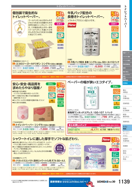 トイレットペーパー学習ペーパークラフト・素材イベント用品学習支援用品保育安全・安心OA・サプライ用品文具・事務用品日用品電化化消耗品耗工具・具・作業用品業収納用品納雨具・具・生活雑貨活飼育・育・園芸用品芸清掃用品掃トイレ用品ティッシュティッシュペーパー・パタオルル洗面所・洗面所・洗濯用品濯保健室保健室飲料・料・食品食品キッチンキッチン用品品トイレットペーパー個包装で衛生的なトイレットペーパー。ゴールドリボンは小児がんの子どもたちを支える活動のための世界共通のシンボルマークです。この製品は売上げの一部を「ゴールドリボン」を通じて小児がんの子どもたちを支える活動に役立てています。北海道・沖縄・離島はサービス対象外芯ありシングル100m114mm幅80ロール入ミシン目入エンボス牛乳パック配合の長巻きトイレットペーパー。ソフトタイプでミシン目入りです。沖縄・離島はサービス対象外芯ありシングル130m107mm幅60ロール入ミシン目入[特種東海エコロジー]エコロジーゴールドリボンシングル100m(個包装)商品種別型式/018110お申込番号8-637-0265M価税抜オープン税抜価格税込価格¥7,200¥7,920(80ロール入)●寸法/114(幅)mm×100(長)m●梱包ケース寸法/440×530×480mm●穴径/38mm●材質/再生紙●ミシン目入●エンボス●芯あり●包装数:1単位1箱[花岡]牛乳パック配合長巻シングル130m6ロール×10パック商品種別お申込番号M価税抜税抜価格型式/31107978-638-1907オープン¥6,500(60ロール入)●寸法/107(幅)mm×シングル:130(長)、ダブル:65長)m●梱包ケース寸法/460×580×330mm●穴径/約35mm●材質/牛乳パック配合再生紙、ピュアパルプ●ミシン目入り●芯あり●包装数:11セット税込価格¥7,150単位※メーカー直送品です。返品はご容赦ください。上記商品は受注日から5営業日以内のお届けになります。安心・安全・高品質を求めたらやはり国産!●再生紙100%使用!シングル150m巻の48ロール入です。●ケース単位でのご購入で注文&配送の回数が減ってエコ!●ロングロールだから取替の回数が減ってエコ!●水に流せる包装紙。芯なしシングル150m107mm幅48ロール入沖縄・離島はサービス対象外ペーパーの幅が狭いエコタイプ。芯なしシングル150m107mm幅6ロール入[TANOSEE]トイレットペーパーシングル150m(個包装)商品種別お申込番号M価税抜税抜価格型式/TS1548R8-638-1909オープン¥7,000(48ロール入)●寸法/107(幅)mm×150(長)m●穴径/約36mm●梱包ケース寸法/464×464×340mm●材質/パルプ100%●芯なし●日本製●包装数:1税込価格¥7,700単位1箱[コアレックス]業務用ワンタッチコアレス150-1071パック商品種別お申込番号M価税抜税抜価格シングル150m●寸法/107幅)mm×150長)m●穴径/約36mm●材質/再生紙●芯なし●包装数:1/8※107mm幅対応のワンタッチペーパーホルダーでもお使いいただけます。8-637-0264オープン¥796型式/310091パック(6ロール入)税込価格¥875単位まとめ買いパック8-637-0274お申込番号※1組単位申込。税抜価格¥6,171税込価格¥6,788単位1組(8パック入)●梱包ケース寸法/446×446×332mmシャワートイレに適した厚手でソフトな肌ざわり。●給水性に優れたウォータリングエンボス加工で、シャワートイレに適したぬれても破れにくい、丈夫なシートです。●リンゴ酸配合の消臭成分を含ませた芯で、トイレの中のアンモニア臭を軽減します。●省スペースで保管もスッキリ。もしものときの災害・備蓄用としてもおすすめです![日本製紙クレシア]クリネックスコンパクト長持ちシャワートイレ用ダブル8ロール入商品種別型式/28702お申込番号M価税抜8-638-1910オープン税抜価格¥800税込価格¥880(8ロール入)●寸法/114(幅)mm×35(長)m●パッケージ寸法/234(幅)×234(奥)×228(高)mm●材質/パルプ100%●ミシン目入り●エンボス●芯あり●無香料●包装数:1単位1袋沖縄・離島はサービス対象外芯ありダブル35m114mm幅8ロール入エンボス※メーカー直送品です。返品はご容赦ください。上記商品は受注日から3営業日以内のお届けになります。※カタログに掲載の商品情報(仕様・価格・税率など)は変更になる場合がございます。最新情報はUCHIDASww.uchidas.netwへ!Vol.201139