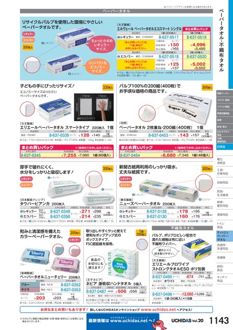 ペーパータオル・不織布タオル学習ペーパークラフト・素材イベント用品学習支援用品保育安全・安心OA・サプライ用品文具・事務用品日用品電化化消耗品耗工具・具・作業用品業収納用品納雨具・具・生活雑貨活飼育・育・園芸用品芸清掃用品掃トイレレ用品品ティッシュペーパー・タオル洗面所・洗面所・洗濯用品濯保健室保健室飲料・料・食品食品キッチンキッチン用品品ペーパータオル※パッケージデザインは変更になる場合があります。リサイクルパルプを使用した環境にやさしいペーパータオルです。レギュラーエコノミー200枚入●レギュラーちょっと小さめレギュラーサイズ。コンパクトなエコノミーサイズ。●エコノミー[大王製紙]エルヴェールペーパータオルエコスマートシングル商品種別●レギュラー型式/21000697「まとめ買いパック」は、「1組」単位でお申し込みください。商品種別●エコノミー型式/21000698「まとめ買いパック」は、「1組」単位でお申し込みください。1個(200枚入)8-637-0517オープン¥150¥1651個(200枚入)M価税抜税抜価格税込価格8-637-0518オープンM価税抜税抜価格税込価格¥125¥137まとめ買いパック1組(35個入)8-637-0519ー¥4,996¥5,4951組(42個入)8-637-0520ー¥5,002¥5,502●寸法/●210×230mm、●210×170mm●材質/リサイクルパルプ●フィルムパック●包装数:●1/35、●1/42子どもの手にぴったりサイズ!エコノミーサイズより小さいペーパータオルです。220枚入170mm170mmパルプ100%の200組(400枚)でお手頃な価格の商品です。200組入160mm通常のエコノミーサイズ220mm[大王製紙]エリエールペーパータオルスマートタイプ220枚入1個[花岡]ペーパータオル2枚重ね・200組(400枚)1個商品種別型式/703367お申込番号M価税抜8-637-0339オープン税抜価格¥128税込価格¥140単位1個(220枚入)商品種別型式/3109163お申込番号M価税抜8-637-0453オープン税抜価格¥143税込価格¥157単位1個(200組入)●寸法/170×160mm(小小判)●材質/パルプ100%●質量/182g●包装数:1/60●400枚(2枚重ね200組)●寸法/210×185mm●材質/パルプ100%●包装数:1/48まとめ買いパック8-637-0345お申込番号※1組単位申込。税抜価格¥7,255税込価格¥7,980単位1組(60個入)まとめ買いパック8-637-0454お申込番号※1組単位申込。税抜価格¥6,680税込価格¥7,348単位1組(48個入)厚手で破れにくく、水分をしっかりと吸収します!●レギュラーレギュラーエコノミー200枚入新聞古紙再利用のしっかり吸水、丈夫な紙質です。200枚入レギュラーエコノミー●エコノミー●エコノミー税込価格¥195¥176単位1個(200枚入)税抜価格¥178¥160●レギュラー[春日製紙]ニューズペーパータオル200枚入8-637-0128オープン8-637-0130レギュラーエコノミーお申込番号商品種別M価税抜●●お申込番号M価税抜8-637-0349オープン8-637-0350税抜価格¥271¥214税込価格¥298¥235単位1個(200枚入)商品種別型式/TPB-M型式/TPB-Sレギュラーエコノミー●●[日本製紙クレシア]タウパービアンカ200枚入●寸法/❸220×230mm、❹220×170mm●材質/再生紙●包装数:❸1/25、❹1/35●寸法/❺220×230mm、❻220×170mm●材質/古紙100%●色/生成り●包装数:❺1/30、❻1/40和みと清潔感を備えたカラーペーパータオル。200枚入レギュラー取り出しやすくサッと使えて便利なポップアップ式のボックスタイプ。FSC認証紙を採用。1個200組入不織布タオルパルプ、ポリプロピレン配合で濡れた感触は布に近い不織布ワイパー。破れにくく拭き取りやすい。ブルーサクラ[新橋製紙]ペーパータオルニューチェリー200枚入ブルーサクラ商品種別型式/NC-B型式/NC-Sお申込番号8-637-03528-637-0353税抜価格M価税抜オープン(200枚入)●寸法/220×230mm●材質/再生紙●包装数:1/35税込価格¥223¥203単位1個食品の水切りにも使えます![王子ネピア]ネピア激吸収ハンドタオル5個入お申込番号8-637-0487M価税抜¥642税抜価格¥506税込価格¥556単位1パック(5個入)商品種別型式/4901121315003●2枚重ね100組×5個●寸法/197×217mm●材質/フレッシュパルプ100%●包装数:1/12[大王製紙]エリエールプロワイプストロングタオルE50ポリ包装お申込番号M価税抜税抜価格8-637-0495オープン商品種別ホワイト型式/703428¥674税込価格¥741単位1袋(50枚入)●シート寸法/405×280mm●材質/パルプ、ポリプロピレン●包装数:1/188-637-0496オープン¥12,060¥13,2661ケース(18袋入)1袋(50枚入)×18袋商品種別●包装数:1お得なまとめ買いもあります!詳しくはUCHIDASオンラインショップwww.uchidas.netへアクセス!※カタログに掲載の商品情報(仕様・価格・税率など)は変更になる場合がございます。最新情報はUCHIDASww.uchidas.netwへ!Vol.201143