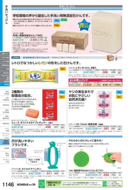 学校現場の声から誕生した手洗い用無添加石けんです。●酸化防止剤・防腐剤・着色料・香料が配合されておりませんので、お肌の弱い方、敏感な方、子どもたちにもお使いいただけます。●豊かな泡立ちで、手についた汚れ・細菌などを洗い流します。[エスケー石鹸]手洗い用無添加石けん(TMS)単位1箱お申込番号M価税抜税抜価格税込価格8-637-2151オープン¥2,500¥2,750(50個入)●成分/石けん原料油脂、食用リサイクル油80%・パーム核油20%●1個の大きさ/40(幅)×26奥)×50(高)mm●入数/50個●質量/50g1個あたり)●包装数:1【使用上の注意】※酸化防止剤(エデト酸塩)・防腐剤などを使用しておりませんので、保管の際には直射日光、高温多湿を避け、お早めのご使用をおすすめします。※長期間保存しておくと黄色く変色することがありますが、使用上支障はありません。手洗いせっけん固形石けん50g50個入※原寸大です。UCHIDASオンラインショップ無添加石けんの液体タイプはWEBにございます。レトロでなつかしいレモンの形をした石けんです。8個入95g3個入2種類の殺菌成分配合。バイ菌から子どもたちを守ります。ゆたかできめ細かい泡立ちとすっきりした洗い上がりが特長。すみずみまで殺菌効果がいきわたります。[レキットベンキーザー・ジャパン]ミューズオリジナルタイプレギュラー3個入お申込番号8-637-2152(3個入)●質量/95g(1個あたり)●医薬部外品●成分/有効成分:イソプロピルメチルフェノール、その他の成分:石けん用素地、パーム核油脂肪酸、酸化チタン、エデト酸塩、香料、黄203、赤201●包装数:1/40M価税抜オープン税抜価格¥498税込価格¥547単位1パック[カネヨ]レモンせっけん8個入商品種別型式/レモン8お申込番号M価税抜8-637-2557オープン税抜価格¥308税込価格¥338単位1パック(8個入)●成分/カリ含有石ケン素地、水、グリセリン、酸化チタン、PEG-75、PEG/PPG-25/30コポリマー、塩化Na、エチドロン酸4Na、EDTA-4Na、黄203、黄406、香料●包装数:1まとめ買いパック8-637-2558お申込番号¥10,820税抜価格※1組単位申込。税込価格¥11,902単位1組(8個入×36パック(288個入))ヤシの実生まれでお肌にやさしい自然派石鹸!なめらかな泡立ちで洗いあがりはしっとりすべすべです。80g3個入[ロケット石鹸]Clesh植物石鹸3個組商品種別お申込番号M価税抜型式/4560309830808(3個入)●寸法/81幅)×147(奥)×23高)mm●質量/80g1個あたり)●材質/石ケン素地、水、酸化チタン、EDTA-4Na、BHT、香料●包装数:1/408-637-2238¥215税抜価格¥207税込価格¥227単位1パック爪が洗いやすいブラシです。手のお手入れ用やわらかブラシ爪ブラシ爪のお手入れ用硬いブラシやわらかいのにキレイに落ちる!●細かい突起が爪や手・指に付いた土や泥汚れを落とします。●強くこすっても痛くないシリコン製。手洗いせっけん学習ペーパークラフト・素材イベント用品学習支援用品保育安全・安心OA・サプライ用品文具・事務用品日用品電化電化消耗品消耗品工具・工具作業用品作業用収納用品収納用雨具・雨具生活雑貨生活雑飼育・飼育園芸用品園芸用清掃用品清掃用トイレトイ用品用品ティッシュティッシュペーパー・タオルタオル洗面所・洗濯用品保健室保健室飲料・飲料食品食品キッチンキッチン用品用品使用例自立して収納できます。[アズマ工業]ネイルケアペンギン商品種別型式/4970190490249お申込番号M価税抜8-637-2208オープン税抜価格¥511税込価格¥562単位1個●寸法/約60幅)×30(奥)×100(高)mm●質量/約33g●材質/グリップ:ポリプロピレン、ブラシ:ナイロン●包装数:1/60[髙儀]園芸用やわらかシリコン爪ブラシ商品種別型式/20-0849お申込番号M価税抜8-637-9724¥700税抜価格¥640使用例税込価格¥704単位1個●寸法/約128(縦)×117(横)mm●質量/71g●材質/シリコーンゴム●包装数:1/801146Vol.20地球にやさしくお買い物このマークのついた商品は地球環境保護に配慮された商品です。グリーンの文字で商品の判別をしやすくしました。どうぞご利用ください。エコマーク認定品グリーン購入法適合品GPNエコ商品ねっと掲載