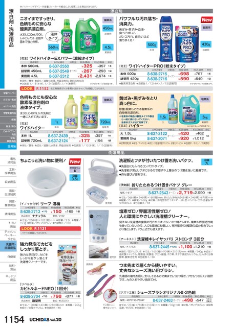 ※パッケージデザイン・内容量はメーカーの都合により変更になる場合があります。ニオイまですっきり。色柄ものに安心な酸素系漂白剤。水30Lに20mLでOK。しみこんだ汗・皮脂や菌まで強力分解。液体タイプ。560mL本体漂白剤酸素系450mL詰替用4.5L業務用パワフルな汚れ落ち・消臭力。黄ばみ・黒ずみ・血液・食べこぼしに。ガンコ汚れ、面白いほど落ちまくる!500g本体[花王]ワイドハイターEXパワー(濃縮タイプ)商品種別お申込番号M価税抜税抜価格本体560mL詰替用450mL業務用4.5L●液性/酸性●成分/過酸化水素、界面活性剤、漂白活性化剤●包装数:1/16本体)、1/24(詰替用)、1/4業務用)8-637-25508-637-25498-637-2312¥325¥267¥2,431オープン税込価格¥357¥293¥2,674単位1本1袋1本※小分けキャップは別売です。P.1152花王業務用ボトル専用小分けキャップを掲載しております。[花王]ワイドハイターPRO(粉末タイプ)商品種別お申込番号M価税抜本体500g詰替用420g●酸素系漂白剤●包装数:1/12(本体)、1/15詰替用)8-638-2715オープン8-638-2716税抜価格¥698¥590酸素系420g詰替用税込価格¥767¥649単位1本1袋※小分けキャップは別売です。色柄ものにも安心な酸素系漂白剤の液体タイプ。水30Lに40mL入れ洗剤と一緒に入れて洗います。[花王]ワイドハイター1L本体720mL詰替用商品種別お申込番号M価税抜税抜価格本体1L詰替用720mL●液性/酸性●成分/過酸化水素水、界面活性剤●包装数:1/12本体)、1/15(詰替用)8-637-2439オープン8-637-2124¥325¥1771袋税込価格¥357¥194単位1本酸素系黄ばみ・黒ずみをとり真っ白に。除菌・除臭もできる塩素系の白物専用漂白剤。※塩素系の製品は酸性タイプの製品と一緒に使わないでください。塩素系ガスが出て危険です。[花王]ハイター塩素系5kg業務用※小分けキャップは別売です。1.5L大商品種別お申込番号M価税抜税抜価格大1.5L業務用5kg●衣類用漂白剤●液性/アルカリ性●成分/次亜塩素酸ナトリウム、水酸化ナトリウム●包装数:1/8大)、1/3業務用)8-637-2122オープン8-637-2071¥420¥9201本税込価格¥462¥1,012単位ちょこっと洗い物に便利!洗濯板とフタが付いたつけ置き洗いバケツ。洗濯用品●洗面台にも入れるコンパクトサイズ。●洗濯板が落としブタになるので帽子や上履きのつけ置き洗いに最適です。●持ち運びが便利です。容量7L漂白剤・洗濯用品学習ペーパークラフト・素材イベント用品学習支援用品保育安全・安心OA・サプライ用品文具・事務用品日用品電化電化消耗品消耗品工具・工具作業用品作業用収納用品収納用雨具・雨具生活雑貨生活雑飼育・飼育園芸用品園芸用清掃用品清掃用トイレトイ用品用品ティッシュティッシュペーパー・タオルタオル洗面所・洗濯用品保健室保健室飲料・飲料食品食品キッチンキッチン用品用品[伊勢藤]折りたためるつけ置きバケツグレー商品種別型式/I-617お申込番号M価税抜税抜価格税込価格8-637-2543オープン¥2,719¥2,990単位1個●寸法/366(幅)×246(奥)×160高)mm、折りたたみ時:約366幅)×246(奥)×67(高)mm●容量/7L●質量/688g●材質/熱可塑性エラストマ―、枠・底・ハンドル・フタ・洗濯板:ポリプロピレン●包装数:1/18使用例塩素ゼロ!界面活性剤ゼロ!人と環境にやさしい洗濯槽クリーナー。見えない洗濯槽の裏側の汚れやニオイもしっかり落とします。塩素も界面活性剤も使っていないので、人にも環境にも優しい。特許取得の8種類の成分配合でしっかり落とします。ドラム式でも使えます。[アーネスト]商品種別型式/A-77825洗濯槽キレイサッパリストロング3回分8-637-2445¥1,200¥1,100¥1,210お申込番号税込価格税抜価格M価税抜単位1個●液性/弱アルカリ性●寸法/160(幅)×70(奥)×250高)mm●質量/540g●成分/過炭酸ナトリウム、珪酸塩、炭酸塩、クエン酸塩、ホウ素、ホタテ焼成カルシウム、たんぱく分解酵素、酸素活性剤●包装数:1/20使用例使用例つま先まで届くから使いやすい。丈夫なシューズ洗い用ブラシ。先端部の植毛を短く、太くしてあるので奥までしっかり届き、クセもつきにくい設計です。力の入れやすい指あて付。[アズマ工業]シューズブラシオリジナルⅡ・2色組商品種別型式/4970190476847単位1セット(2本入)●寸法/25(幅)×71(奥)×210(高)mm●質量/30g1本)●材質/ポリプロピレン●耐熱温度/約70℃●包装数:1/308-637-2463オープン税込価格¥547¥498お申込番号税抜価格M価税抜ドロ落としに便利なツメ付。ポリプロピレン製容量3.5L税込価格¥165単位1個[イノマタ化学]リーフ湯桶¥1508-638-2713お申込番号税抜価格M価税抜¥175ナチュラル商品種別型式/2102●寸法/268(径)×102(高)mm●容量/3.5L●質量/153g●材質/ポリプロピレン●包装数:1/100P.1121バケツを掲載しております。強力発泡でカビをしっかり落とす。強力な発泡で、カビをしっかり剥がし落とす洗濯槽クリーナーです。[リベルタ]カビトルネードNEO(1回分)8-638-2704縦型用¥798型式/4533213M価税抜¥798お申込番号税抜価格商品種別税込価格¥877単位1個●寸法/100(幅)×40(奥)×210(高)mm●質量/266g●成分/炭酸ナトリウム●包装数:1/481154Vol.20