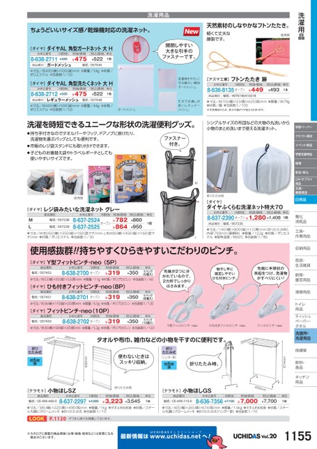 学習ペーパークラフト・素材イベント用品学習支援用品保育安全・安心OA・サプライ用品文具・事務用品日用品電化化消耗品耗ML折りたたみ時[ダイヤ]ダイヤふくらむ洗濯ネット特大70お申込番号M価税抜税抜価格税込価格8-637-2390オープン¥1,280¥1,408単位1個商品種別型式/057235●寸法/140(横)×800縦)×12(厚)mm(折りたたみ時)、内径:700mm(展開時)●質量/122g●材質/ポリエステル●耐熱温度/約60℃●包装数:1/80工具・具・作業用品業800mmファスナー付き。洗濯用品天然素材のしなやかなフトンたたき。軽くて丈夫な籐製です。使用例[アズマ工業]フトンたたき籐8-636-8135オープン¥449お申込番号税抜価格M価税抜税込価格¥493単位1本開閉しやすい大きな引手のファスナーです。洗濯物をやさしく守る細かい網目ガードメッシュ。商品種別型式/4970190410018丈夫で水通しが良いレギュラーメッシュ。●寸法/約155幅)×23(奥)×625高)mm●質量/約79g●材質/籐●包装数:1/100※天然素材のため、多少の曲がりや色むらがあります。ちょうどいいサイズ感!乾燥機対応の洗濯ネット。洗濯用品[ダイヤ]ダイヤAL角型ガードネット大Hお申込番号8-638-2711M価税抜¥500商品種別ガードメッシュ税抜価格¥475税込価格¥522型式/057045単位1枚●寸法/約400(横)×500(縦)mm●質量/54g●材質/ポリエステル●包装数:1/50[ダイヤ]ダイヤAL角型洗たくネット大Hお申込番号8-638-2712M価税抜¥500商品種別レギュラーメッシュ税抜価格¥475税込価格¥522型式/057048単位1枚●寸法/約400(横)×500(縦)mm●質量/44g●材質/ポリエステル●包装数:1/50ガードメッシュ洗濯を時短できるユニークな形状の洗濯便利グッズ。シングルサイズの布団などの大物の丸洗いから小物のまとめ洗いまで使える洗濯ネット。●持ち手付きなのでタオルバーやフック、ドアノブに掛けたり、洗濯物を運ぶバッグとしても便利です。●市販のレジ袋スタンドにも取り付けできます。●子どものお着替え袋やトラベルポーチとしても使いやすいサイズです。使用例[ダイヤ]レジ袋みたいな洗濯ネットグレー商品種別お申込番号M価税抜税抜価格単位型式/057238МL●寸法/M:約350(横)×350(縦)×160底マチ)mm、L:約400(横)×450縦)×160(底マチ)mm●材質/ポリエステル●包装数:1/308-637-2524オープン8-637-2525¥782¥864型式/0572391個税込価格¥860¥950収納用品納雨具・具・生活雑貨活飼育・育・園芸用品芸清掃用品掃トイレレ用品品ティッシュティッシュペーパー・パタオルル洗面所・洗濯用品保健室保健室飲料・料・食品食品キッチンキッチン用品品使用感抜群!!持ちやすくひらきやすいこだわりのピンチ。税込価格¥350単位1パック[ダイヤ]Y型フィットピンチ・neo(5P)¥3198-638-2700オープン商品種別型式/057452お申込番号税抜価格M価税抜(5個入)●寸法/約53(横)×93縦)×33(厚)mm●質量/11g●材質/ポリプロピレン●包装数:1/60[ダイヤ]ひも付きフィットピンチ・neo(8P)商品種別型式/057451お申込番号M価税抜8-638-2701オープン税抜価格¥319税込価格¥350単位1パック(8個入)●寸法/約36横)×110縦)×20厚)mm●質量/6.5g●材質/ポリプロピレン●包装数:1/120[ダイヤ]フィットピンチ・neo(10P)商品種別型式/057450お申込番号M価税抜8-638-2702オープン税抜価格¥319税込価格¥350単位1パック(10個入)●寸法/約36(横)×58縦)×20厚)mm●質量/5.2g●材質/ポリプロピレン●包装数:1/120先端が2つに分かれているので、2カ所でしっかりはさみます。物干し竿に固定しやすいひも付きピンチ。先端に半球状の突起をつけ、洗濯物がすべりにくい!Y型フィットピンチ・neoひも付きフィットピンチ・neoフィットピンチ・neo674mm405mmM価税抜¥7,100税抜価格¥7,000税込価格¥7,700単位1台折りたたみ式(ハンガー部)約6枚掛折りたたみ時。使わないときはスッキリ収納。490mm折りたたみ式約6枚掛[テラモト]小物ほしSZ商品種別型式/CE-495-400-0お申込番号8-637-2297折りたたみ時M価税抜¥4,300税抜価格¥3,223税込価格¥3,545単位1台[テラモト]小物ほしGS商品種別型式/CE-495-110-0お申込番号8-636-7356mm022385mmタオルや布巾、雑巾などの小物を干すのに便利です。mm562●寸法/385(幅)×220奥)×490高)mm●質量/1kg●タオル約6枚掛●材質/スチール丸鋼にクロームメッキ●折りたたみ式●包装数:1/10●寸法/405(幅)×265奥)×674高)mm●質量/1.6kg●タオル約6枚掛●材質/スチール丸鋼にクロームメッキ●折りたたみ式(ハンガー部)●包装数:1/10P.1120ぞうきん掛けを掲載しております。※カタログに掲載の商品情報(仕様・価格・税率など)は変更になる場合がございます。最新情報はUCHIDASww.uchidas.netwへ!Vol.201155