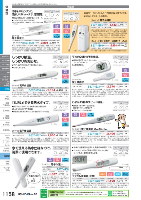 ※体温計は周囲の温度が10℃以下または40℃以上だと正確に測定できない場合があります。消毒をよりカンタンに。清拭しやすいケースで、清潔管理。●開口式で清拭しやすく、薬液が残りにくいケース。●ケースからの出し入れでON/OFF。※電池は交換できません。(内蔵電池により約10000回の検温が可能。)水洗い◯アルコール消毒◯その他※△※布や綿にしみ込ませて清拭その他/クロルヘキシジングルコン酸塩、ベンザルコニウム塩化物、次亜塩素酸ナトリウム、グラタラール体温計水洗いアルコール消毒◯※△※布や綿にしみ込ませて清拭その他中性洗剤※△[テルモ]電子体温計商品種別お申込番号M価税抜税抜価格税込価格型式/ET-C207P8-637-5575¥3,000¥2,891¥3,180単位1本●寸法/129幅)×17.6奥)×12.6(高)mm●質量/13g電池含む)●電源/アルカリマンガン電池(LR41×2個)(内蔵)●測定範囲/32.0〜42.0℃●測定方式/予測式(平均約30秒)、実測(約10分※測定開始後、約4分30秒後実測表示に切替)兼用●検温部位/わき下●付属品/収納ケース(電源ON/OFF機能付)●一般医療機器●医療機器認証番号302AABZX00003000号●包装数:1/10しっかり検温、しっかりお知らせ。●ブザー音圧約2倍なので聞き取りやすい。●くり返しおしらせ。予測・実測わき下専用予測約30秒予測・実測わき下専用予測約20秒水洗い※△アルコール消毒検温部のみ×※△※布や綿にしみ込ませて音穴をさけて清拭その他/クロルヘキシジングルコン酸塩、ベンザルコニウム塩化物予測・実測わき下専用予測約20秒ケース付き[テルモ]電子体温計商品種別型式/ET-C232P01お申込番号8-637-5756¥2,480M価税抜税抜価格税込価格¥2,194¥2,413単位1本●寸法/129(幅)×17.6(奥)×12.6(長)mm●質量/12.5g●電源/アルカリマンガン電池(LR41×2個)(内蔵)●測定方式/予測式(予測検温・実測検温兼用)●測定範囲/32.0〜42.0℃●付属品/収納ケース●一般医療機器●医療機器認証番号230AABZX00036000号●包装数:1/100「丸洗い」できる防水タイプ。●脇下へのはさみやすさを考えた幅広薄型形状。●しっかり約30秒で予測検温。●体温表示液晶表示素子による体温値3桁デジタル表示。水洗い◯アルコール消毒検温部のみ※△その他中性洗剤※△※布や綿にしみ込ませて清拭予測・実測わき下専用予測約30秒ケース付き●収納ケースからの出し入れで電源ON-OFFできます。●丸洗い、アルコール消毒OK。[オムロン]電子体温計お申込番号M価税抜8-637-4865¥3,250税抜価格税込価格¥3,132¥3,445単位1本商品種別型式/MC-1600W-HP●寸法/20幅)×136.8(長)×12.7厚)mm●質量/約14g(電池含む)●電源/アルカリボタン電池(LR41×2個)内蔵)●測定範囲/32.0〜42.0℃●測定方式/予測(約20秒)/実測●わき下専用●材質/抗菌ABS●付属品/収納ケース●管理医療機器●包装数:1※電池は交換できません。(内蔵電池により約10000回の検温が可能。)[オムロン]電子体温計6本組(ケース入)お申込番号M価税抜税抜価格税込価格8-637-4866¥17,500¥16,864¥18,550単位1組(6本入)商品種別型式/MC-1600W-HPS6本入●ケース寸法/58幅)×58奥)×145高)mm●管理医療機器●包装数:1その他平均約20秒の予測検温。水洗い●検温結果が見やすく、使いやすいスタンダードタイプ。●大型液晶表示。アルコール消毒検温部のみ※△その他中性洗剤※△※△※布や綿にしみ込ませて清拭[オムロン]電子体温計商品種別型式/MC-681お申込番号M価税抜8-637-4623¥2,500予測・実測わき下専用予測約20秒ケース付き税抜価格¥2,370税込価格¥2,607単位1本●寸法/30(幅)×110(長)×14(厚)mm●質量/約18g(電池含む)●電源電圧/DC3V(リチウム電池CR2016×1個)●電池寿命/予測:約15000回、実測:約3000回●測定方式/予測(平均約20秒)/実測(約10分)●測定範囲/32.0〜42.0℃●体温表示/3桁+℃表示●わき下専用●オートパワーオフ●付属品/テスト用電池(リチウム電池CR2016×1個)、収納ケース●管理医療機器●包装数:1/25わずか15秒のスピード検温。水洗い●測定終了をブザーでお知らせ。聞き取りやすい2音階ブザー。●ずれにくいフラット感温部。予測・実測わき下専用予測約15秒ケース付きアルコール消毒表示部以外※△その他中性洗剤※△※△※布や綿にしみ込ませて清拭[テルモ]電子体温計商品種別型式/ET-P237WZお申込番号M価税抜税抜価格税込価格8-637-5757¥2,200¥1,980¥2,178単位1本●寸法/133幅)×21(奥)×9(高)mm●質量/12g●電源電圧/DC1.5V(LR41×1個)(内蔵)●測定方式/予測式(予測検温・実測検温兼用)●測定範囲/32.0〜42.0℃●付属品/収納ケース●一般医療機器●医療機器認証番号303ADBZX00093000号●包装数:1/100水で洗える防水仕様なので、清潔に使用できます。水洗いアルコール消毒◯※△その他中性洗剤※△※布や綿にしみ込ませて清拭予測・実測わき下専用予測約60秒[オムロン]電子体温計けんおんくん商品種別型式/MC-687お申込番号M価税抜8-637-4867オープン税抜価格¥2,400税込価格¥2,640単位1本●寸法/20.1(幅)×12.8(奥)×136.8(長)mm●質量/13g●電源/リチウム電池CR1220×1個(内蔵)●測定範囲/32.0〜42.0℃●測定方式/予測(15秒)、実測(10分)●検温部位/わき下専用●オートパワーオフ●付属品/収納ケース、取扱説明書(品質保証書