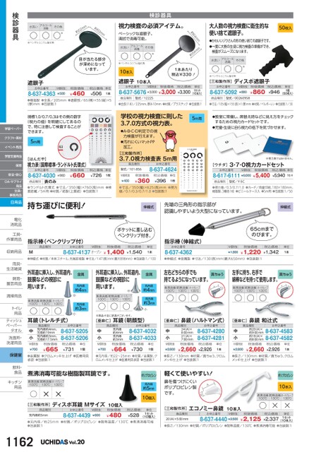大人数の視力検査に衛生的な使い捨て遮眼子。●かわいいゾウさんの形の使い捨ての遮眼子です。●一度に大勢の生徒に視力検査の準備ができ、検査がスムーズになります。50枚入水洗い○アルコール消毒その他○○※※ベンザルコニウム塩化物[三和製作所]ディスポ遮眼子m64m約m54m約検診器具視力検査の必須アイテム。ベーシックな遮眼子。清拭で消毒可能。水洗い○アルコール消毒その他○○※※ベンザルコニウム塩化物10本入遮眼子10本入1本あたり税込¥330!お申込番号M価税抜税抜価格8-637-5676¥3,000¥3,000税込価格¥3,300単位1セット(10本入)お申込番号8-637-5092M価税抜¥880税抜価格¥860税込価格¥946単位1箱(50枚入)商品種別型式/12225商品種別型式/00260958●全長(1本)/225mm、厚み10mm●材質/プラスチック●包装数:1●寸法/105(幅)×155(長)×1厚)mm●材質/ベルポーレン●包装数:1/30学校の視力検査に則した3.7.0方式の視力表。5m用●A・B・C・D判定での視力検査が行えます。●汚れにくいマットPP加工。●教室に常備し、席替え時などに見え方をチェックするための視力カードセットです。●児童・生徒に自ら視力の低下を気づかせます。[三和製作所]3.7.0視力検査表5m用商品種別型式/101-856お申込番号8-637-4624M価税抜¥400税抜価格¥360税込価格¥396単位1枚※視力表ではありません。[ウチダ]3・7・0視力カードセットお申込番号M価税抜8-617-6111¥6,000税抜価格¥5,400税込価格単位¥5,9401セット商品種別型式/Y-5C約63mmmm25約目が当たる部分が深めになっています。水洗い○アルコール消毒その他○○※※ベンザルコニウム塩化物遮眼子お申込番号8-637-4363M価税抜¥500税抜価格¥460税込価格¥506単位1本●樹脂製●全長/205mm●遮眼部/65(横)×55(縦)×5(厚)mm●包装数:1視標1.0/0.7/0.3はその側の数字(視力の値)を明確にしてあるので、特に注意して検査することができます。5m用[はんだや]視力表(国際標準・ランドルト氏環式)お申込番号8-637-4030表のみ商品種別M価税抜¥660税抜価格¥660税込価格¥726単位1枚●ランドルト氏環式●寸法/350(幅)×760(高)mm●検査距離/5m用●材質/紙製(上質紙)●包装数:1●寸法/350(幅)×625(高)mm●視力値/0.1/0.3/0.7/1.0●包装数:1●視力値/0.3/0.7/1.0●カード/両面印刷、180×180mm、樹脂製、3種各1枚●ビニールケース入●5m用●包装数:1/50持ち運びに便利!伸縮式先端の三角形の指示部が認識しやすいよう大型になっています。伸縮式ポケットに差し込むペンクリップ付き。指示棒(ペンクリップ付)商品種別お申込番号M価税抜税抜価格M●伸縮式●材質/本体:スチール、先端部:樹脂●寸法/147(長)mm(最大898mm)●包装数:1/1008-637-4137オープン¥1,400税込価格¥1,540単位1本外耳道に挿入し、外耳道内、鼓膜などの視診に用います。煮沸消毒100℃乾熱消毒130℃オートクレーブ130℃○○○耳鏡(トレルチ式)金属先内径約4mm中先内径約3mm小外耳道に挿入し、外耳道内、鼓膜などの視診に用います。煮沸消毒100℃○乾熱消毒130℃○中オートクレーブ130℃○金属先内径約4mm先内径約3mm小※商品寸法に誤差がございます。[亜麻仁]耳鏡(朝顔型)指示棒(伸縮式)お申込番号8-637-436265cmまでのびます。M価税抜¥1,300税抜価格¥1,220税込価格¥1,342単位1本●伸縮式●金属製●寸法/130(長)mm(最大650mm)●包装数:1左右どちらの手でも持てるようになっています。煮沸消毒100℃○乾熱消毒130℃○オートクレーブ130℃○真ちゅうAB左手に持ち、右手で綿棒などを持って使用します。真ちゅうAB煮沸消毒100℃○乾熱消毒130℃○オートクレーブ130℃○[亜麻仁]鼻鏡(ハルトマン式)[亜麻仁]鼻鏡和辻式商品種別先内径約4mm、元径約19mm先内径約3mm、元径約17.5mm税抜価格¥665中小M価税抜¥700お申込番号8-637-52058-637-5206税込価格¥731単位1個商品種別中小M価税抜¥700先内径約4mm先内径約3mm税抜価格¥664お申込番号8-637-40328-637-4033中小税込価格¥730単位1個M価税抜¥2,800商品種別24(A)×8B)mm21(A)×7B)mm税抜価格¥2,660お申込番号8-637-42808-637-4281中小税込価格¥2,926単位1本M価税抜¥2,800商品種別約20A)×約9(B)mm約18A)×約8(B)mm税抜価格¥2,660お申込番号8-637-45838-637-4582税込価格¥2,926単位1本●金属製●クロムメッキ仕上げ●医療用具承認●包装数:1●元内径/約22〜25mm●材質/金属製、クロムメッキ仕上げ●医療用具承認●包装数:1●長さ/130mm●材質/真ちゅう、クロムメッキ仕上げ●包装数:1●長さ/130mm●材質/真ちゅう、クロムメッキ仕上げ●包装数:1煮沸消毒可能な樹脂製耳鏡です。煮沸消毒100℃乾熱消毒130℃オートクレーブ130℃◯××軽くて使いやすい!鼻を傷つけにくいポリプロピレン製です。ABポリプロピレン先内径約5mm10個入[三和製作所]ディスポ耳鏡Mサイズ10個入商品種別先内径約5mmお申込番号8-637-4439M価税抜¥600税抜価格¥480税込価格¥528単位1セット(10個入)●元内径/約25mm●材質/ポリプロピレン●耐熱温度/130℃●煮沸消毒可能●包装数:1[三和製作所]エコノミー鼻鏡10本入商品種別20A)×5(B)mmお申込番号M価税抜8-637-4440¥2,500税抜価格¥2,125税込価格¥2,337単位1セット(10本入)●長さ/130mm●材質/ポリプロピレン●耐熱温度/130℃●煮沸消毒可能●包装数:1ポリプロピレン10本入乾熱消毒130