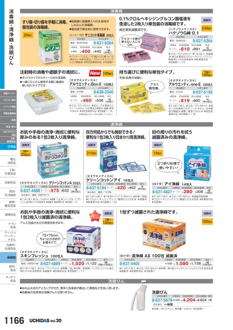 すり傷・切り傷を手軽に消毒。個包装の消毒綿。20包入●脱脂綿に殺菌剤入りの水溶液がしみ込んだ消毒綿。●個包装で衛生的に使用できます。[コットン・ラボ]サニコット消毒綿20包入商品種別型式/00207626お申込番号8-637-5084M価税抜¥450税抜価格¥400税込価格¥440(20包入)●パッケージ寸法/70(幅)×55(奥)×110(高)mm●有効成分/クロルヘキシジングルコン酸塩液●指定医薬部外品●包装数:1単位1箱消毒綿0.1%クロルヘキシジングルコン酸塩液を含浸した2枚入り単包装の消毒綿です。高圧蒸気滅菌済です。[ハクゾウメディカル]ハクゾウG綿0.1滅菌済2×60包入アルコール綿が使えない人にもOK。商品種別型式/2600029お申込番号8-637-5264単位1箱税抜価格¥810税込価格¥891M価税抜オープン(2枚×60包入)●寸法/40×40mm●1包2枚入●滅菌済●日本薬局方クロルヘキシジングルコン酸塩液0.1%水溶液含有●医薬部外品●包装数:1/101枚×100包入[オオサキメディカル]アルウエッティone-E100包入商品種別型式/31076お申込番号8-637-5195注射時の消毒や遮眼子の清拭に。●ボックスタイプのエタノール80%含浸綿。●一度にたくさん使用する際に最適な使い切りタイプです。100枚入持ち運びに便利な単包タイプ。[オオサキメディカル]アルウエッティ®Box-E100枚入商品種別型式/31090お申込番号8-638-3340手指・皮膚の消毒に。アルミ個包装。単位1箱M価税抜オープン税抜価格¥460税込価格¥506(100枚入)●寸法/40×40mm●成分/日本薬局方エタノール:83mL、日本薬局方精製水:適量/薬液100mL中●指定医薬部外品●包装数:1/36※開封後はなるべく早く使用してください。単位1箱M価税抜オープン税抜価格¥819税込価格¥900(1枚×100包入)●2つ折り1枚入●寸法/37×80mm●成分/日本薬局方エタノール:83mL、日本薬局方精製水:適量/薬液100mL中●指定医薬部外品●包装数:1/36お肌や手指の清浄・清拭に便利な厚みのある1包2枚入り清浄綿。四方何処からでも開封できる!便利な1包2枚入り目まわり用清浄綿。目の周りの汚れを拭う滅菌済みの清浄綿。清浄綿滅菌済2枚×25包入滅菌済2×16包入滅菌済14包入2つ折り仕様で使いやすい![オオサキメディカル]クリーンコットンアイ16包入お申込番号M価税抜税抜価格8-637-5194オープン¥420税込価格¥462単位1箱(2枚×16包入)商品種別型式/72708[白十字]アイ浄綿14包入お申込番号M価税抜8-637-4827オープン税抜価格¥280税込価格¥308単位1箱(14包入)●2つ折り2枚入●1枚あたり:37.5×80mm●材質/脱脂綿・クロルヘキシジングルコン酸塩0.02%含浸●滅菌済●医薬部外品●包装数:1/60●2つ折り1枚入●寸法/40×80mm●滅菌済脱脂綿●クロルヘキシジングルコン酸塩0.02%水溶液●医薬部外品●包装数:11包ずつ滅菌された清浄綿です。滅菌済2枚×100包入滅菌済100包入[オオサキメディカル]クリーンコットンA25包入お申込番号8-637-4888オープン¥575M価税抜税抜価格税込価格¥632単位1箱(2枚×25包入)商品種別型式/00072712●2つ折り2枚入●寸法/75×80mm●質量/13g●コットン100%、ベンザルコニウム塩化物0.01%水溶液含有●滅菌済●医薬部外品●包装数:1/20お肌や手指の清浄・清拭に便利な1包2枚入り滅菌済の清浄綿。アルミ包装が水分の蒸発を防ぎます。75×75mmちょっと小さめのお得タイプ。[オオサキメディカル]スキンフレッシュ100包入商品種別お申込番号M価税抜税抜価格税込価格型式/000951888-637-4889オープン¥1,020¥1,122(2枚×100包入)●2つ折り2枚入●寸法/75×75mm●質量/8g●材質/脱脂綿・ベンザルコニウム塩化物0.01%水溶液含有●滅菌済●医薬部外品●包装数:1/12単位1箱[白十字]清浄綿AⅡ100包滅菌済お申込番号8-637-4405M価税抜税抜価格¥1,660¥1,580¥1,738税込価格単位1箱(100包入)●2つ折り1枚入●寸法/80×80mm●材質/綿・塩化ベンザルコニウム0.01%水溶液含浸●滅菌済●医薬部外品●包装数:1●はめ込み式のアイカップが付き、素早く洗浄液が噴出して異物などを洗い流します。●洗眼後の洗浄液は洗眼びんには戻りません。洗眼びん洗眼びんお申込番号商品種別一体型8-637-5678¥4,300¥4,204¥4,624M価税抜税抜価格税込価格単位1個1166Vol.20●材質/ポリエチレン●容量/500mL●包装数:1消毒綿・清浄綿・洗眼びん学習ペーパークラフト・素材イベント用品学習支援用品保育安全・安心OA・サプライ用品文具・事務用品日用品電化電化消耗品消耗品工具・工具作業用品作業用収納用品収納用雨具・雨具生活雑貨生活雑飼育・飼育園芸用品園芸用清掃用品清掃用トイレトイ用品用品ティッシュティッシュペーパー・タオルタオル洗面所・洗面所・洗濯用品洗濯用保健室飲料・飲料食品食品キッチンキッチン用品用品
