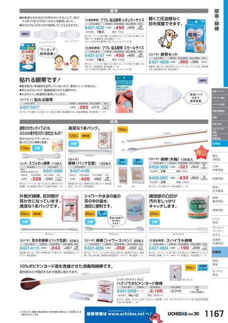 眼帯・綿棒学習ペーパークラフト・素材イベント用品学習支援用品保育安全・安心OA・サプライ用品文具・事務用品日用品電化化消耗品耗工具・具・作業用品業収納用品納雨具・具・生活雑貨活飼育・育・園芸用品芸清掃用品掃トイレレ用品品ティッシュティッシュペーパー・パタオルル洗面所・洗面所・洗濯用品濯保健室飲料・料・食品食品キッチンキッチン用品品約75mm約78mm約76.5mm[白十字]耳かき綿棒(パック包装)50本入[白十字]綿棒(シャワーコットン)80本入[日進医療器]スパイラル綿棒お申込番号8-637-4110M価税抜¥250税抜価格¥243(50本入)●紙軸●寸法/耳かき綿棒:約75(長)mm●抗菌成分/キトサン●包装数:1税込価格¥267単位1袋お申込番号8-637-4224M価税抜¥380税抜価格¥358(80本入)●寸法/パッケージ:70(径)×約83高)mm、綿棒:約78mm●質量/65g●材質/脱脂綿●抗菌成分/キトサン●包装数:1/6税込価格¥393単位1パックお申込番号8-637-4934M価税抜¥200税抜価格¥190税込価格¥209単位1パック(200本入)●寸法/パッケージ:80(径)×82高)mm、綿棒:約76.5mm●材質/紙軸、コットン●キトサン抗菌加工●包装数:1/1010%ポビドンヨード液を含侵させた消毒用綿棒です。個包装なので開封するまで清潔に保たれます。150mm[ハクゾウメディカル]ハクゾウポビドンヨード綿棒お申込番号M価税抜8-637-5258オープン商品種別No.12税抜価格¥2,100型式/260012130本入浸透量2.0mL取り出し方税込価格¥2,310単位1箱(1本入30袋入)※カタログに掲載の商品情報(仕様・価格・税率など)は変更になる場合がございます。最新情報はUCHIDASww.uchidas.netwへ!Vol.201167●寸法/綿径:10mm、全長:150mm●容量/2mL●10%ポビドンヨード液●指定医薬部外品●包装数:1/24●粘着部分を左右の2カ所のみにすることで、肌のつっぱりやまつげのひっかかりを解消しました。●耳ひもがないのでメガネを使用していても大丈夫です。滅菌済レギュラーサイズワンタッチ簡単装着!眼帯[日進医療器]ププレ貼る眼帯レギュラーサイズお申込番号8-637-42327枚入商品種別M価税抜¥500税抜価格¥450型式/P-HG税込価格¥495単位1箱(7枚入)スモールサイズ●寸法/シート:90幅)×43(高)mm、パッド部:50(幅)×30(高)mm●滅菌済●包装数:1/12〈セット内容〉貼る眼帯×7枚、ウェットコットン×7枚[日進医療器]ププレ貼る眼帯スモールサイズお申込番号8-637-51077枚入商品種別M価税抜¥500税抜価格¥450型式/P-HGS税込価格¥495単位1箱(7枚入)●寸法/シート:75(幅)×35(高)mm、パッド部:40(幅)×28(高)mm●滅菌済●包装数:1/20〈セット内容〉貼る眼帯×7枚、ウェットコットン×7枚貼れる眼帯です!●眉毛部分に粘着剤を塗布していないので、眉毛にくっつきません。●耳ひもがないので、眼鏡使用の方にも便利です。●かぶれにくい粘着剤を使用しています。[カワモト]貼れる眼帯お申込番号8-637-5377M価税抜¥300税抜価格¥285税込価格¥313単位1パック(3枚入)●寸法/90(幅)×50(高)mm●左右両用●滅菌済●一般医療機器●包装数:1/20通常の大きいタイプよりもふわふわ度が約30%(当社比)もUP!吸水力もさらにパワーUPした、職人のこだわり綿棒が登場!110本入抗菌清潔な1本パック。120本入個包装抗菌約80mm綿棒100本入2号3号78mm[山洋]スゴふわっ綿棒110本入商品種別型式/4936613091127M価税抜¥240税抜価格¥228お申込番号8-637-5080税込価格¥250単位1パック(110本入)●寸法/パッケージ:81径)×85(高)mm、綿棒:約78mm●質量/74g●国産品●キトサン抗菌●包装数:1/60片側が綿棒、反対側が耳かきになっています。清潔な1本パックです。50本入個包装抗菌抗菌[白十字]綿棒(パック包装)120本入お申込番号8-637-4109M価税抜¥450税抜価格¥420税込価格¥462(120本入)●紙軸●寸法/綿棒:約80(長)mm●抗菌成分/キトサン●包装数:1単位1袋綿径5mm綿径10mm2号3号シャワーや水泳の後の耳の中の吸水、清拭に便利です。80本入綿径6.5mm普通の綿棒の約2倍の大きさ!軽くて圧迫感なく目を保護できます。[白十字]眼帯セットお申込番号M価税抜8-637-4828¥400税抜価格¥360税込価格¥396単位1セット●眼帯1個(パッド固定用のストッパー付)、パッド3枚、清浄綿2枚●医薬部外品●包装数:1滅菌済吸液パッド付きで、簡単装着。150mm150mm[白十字]綿棒(木軸)100本入お申込番号8-620-3006M価税抜¥330税抜価格¥321税込価格¥353単位1袋(100本入)商品種別2号8-620-3007綿径/5mm¥680¥630¥6931袋(100本入)3号商品種別綿径/10mm●寸法/150長)mm●包装数:1/10綿球部の凸凹が汚れをしっかりキャッチします。200本入抗菌