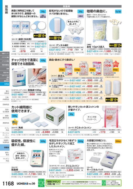 50g消毒済咄嗟の鼻血に。直径9〜10mm、長さ2cmの不織布を巻いたタイプの鼻栓です。10g×3袋入脱脂綿起毛がないので処理後ケバが残りません。表面に特殊加工を施してありますので、創傷部への綿残りがほとんどありません。50g高圧滅菌可能脱脂綿小大[白十字]綿球(外科用)小:10mm大:14mmほぼ原寸商品種別お申込番号小、約560〜570球入大、約290〜300球入直径/10mm8-637-4210直径/14mm8-637-4211M価税抜¥630税抜価格¥576税込価格¥633単位1袋●内容量/50g●高圧滅菌可能●一般医療機器●包装数:1チャック付きで清潔に保管できる脱脂綿。100g使用例※包装が開封、破損および汚損している場合は使用しないでください。[オオサキメディカル]脱脂綿100gお申込番号M価税抜8-637-4890オープン税抜価格¥500税込価格¥550単位1袋(2枚入)商品種別型式/00030071●寸法/600×720mm(1枚)●一般医療機器●包装数:1/32カット綿同様に使用できます。500g鼻血止め用に適します。10×20mmほぼ原寸[白十字]デンタル綿Ⅱお申込番号8-637-4912M価税抜¥770税抜価格¥710税込価格¥781単位1袋●寸法/約10(径)×20長)mm●内容量/50g約250個)●消毒済●一般医療機器●包装数:1/10鼻血・鼻水にすぐ鼻ぽん![伸秦]鼻栓10g×3袋入ほぼ原寸お申込番号M価税抜税抜価格税込価格単位8-637-4914¥1,650¥1,580¥1,7381セット(3袋入)●寸法/9〜10(径)×20mm●質量/10g×3●包装数:180個入●※外観が変わる場合があります。小:9×20mm大:11×20mmほぼ原寸30個入●[ヨコイ]鼻ぽん商品種別100個入●30個入●お申込番号税抜価格M価税抜¥320●●●●税込価格¥330単位1袋(30個入)99¥300(径)×20mm8-637-4097小(女性・子供向き)(30個入)●パッケージ寸法/115幅)×175奥)×20高)mm●材質/綿100%●包装数:1小(女性・子供向き)¥660(100個入)●パッケージ寸法/65幅)×65奥)×100高)mm●材質/綿100%●包装数:1¥330大(大人向き)30個入)11(径)×20mm8-637-4096(径)×20mm8-637-4467¥600¥300¥650¥3201箱(100個入)1袋(30個入)●パッケージ寸法/115幅)×175奥)×20高)mm●材質/綿100%●包装数:1大(大人向き)80個入)11(径)×20mm8-637-4567オープン¥475¥522●パッケージ寸法/65幅)×65奥)×100高)mm●材質/綿100%●包装数:11箱(80個入)使いやすいカット済コットンの少量タイプ。20gチャック付パッケージ。[白十字]角綿お申込番号8-620-3009M価税抜¥2,180税抜価格¥2,080税込価格¥2,288単位1箱[白十字]FCカットコットンお申込番号8-637-5679M価税抜¥190税抜価格¥173税込価格¥190単位1袋●寸法/40(幅)×40(長)mm●内容量/500g●一般医療機器●包装数:1●寸法/40×40mm(1枚)●内容量:20g●包装数:1吸収性、保液性に優れた綿。500g毛羽立ちが少なく1枚ずつはがしやすいプレス加工したカットメン。500g消毒液の塗布・清拭に使用します。従来のカットメンよりコンパクトな箱で、収納スペースをとりません。大容量200枚入り。傷口や眼帯の当てパッド用で吸収力、保水性に優れ、血液などを吸収すると、内部の脱脂綿は中心部より横方向に拡散します。200枚入表面は不織布になっています。学習ペーパークラフト・素材イベント用品学習支援用品保育安全・安心OA・サプライ用品文具・事務用品日用品電化電化消耗品消耗品工具・工具作業用品作業用収納用品収納用雨具・雨具生活雑貨生活雑飼育・飼育園芸用品園芸用清掃用品清掃用トイレトイ用品用品ティッシュティッシュペーパー・タオルタオル洗面所・洗面所・洗濯用品洗濯用保健室飲料・飲料食品食品キッチンキッチン用品用品[白十字]脱脂綿お申込番号M価税抜税抜価格税込価格8-620-3008¥1,900¥1,730¥1,903●内容量/500g●一般医療機器●包装数:1単位1袋[オオサキメディカル]スリムコットンお申込番号8-637-5649オープン¥1,855¥2,040M価税抜税抜価格税込価格単位1箱商品種別型式/00033706●寸法/40×40mm(1枚)●一般医療機器●内容量/500g●包装数:1/20[白十字]サージカルパッドお申込番号8-637-4936M価税抜¥880税抜価格¥853(200枚入)●寸法/50(幅)×60長)mm●内容量/200枚●包装数:1税込価格¥938単位1袋1168Vol.20地球にやさしくお買い物このマークのついた商品は地球環境保護に配慮された商品です。グリーンの文字で商品の判別をしやすくしました。どうぞご利用ください。エコマーク認定品グリーン購入法適合品GPNエコ商品ねっと掲載