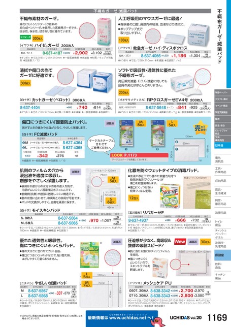 不織布ガーゼ・滅菌パッド学習ペーパークラフト・素材イベント用品保育安全・安心OA・サプライ用品文具・事務用品日用品電化化消耗品耗工具・具・作業用品業収納用品納雨具・具・生活雑貨活飼育・育・園芸用品芸清掃用品掃トイレレ用品品ティッシュティッシュペーパー・パタオルル洗面所・洗面所・洗濯用品濯保健室飲料・料・食品食品キッチンキッチン用品品不織布ガーゼ・滅菌パッド人工呼吸用のマウスガーゼに最適!●傷病者の口腔、鼻腔内の粘液、血液などの清拭に。●ポップアップ式で取り出しやすい。100枚入不織布素材のガーゼ。綿花(コットンリンター)が原料の旭化成ベンリーゼ®を使用した医療用ガーゼです。吸水性、保水性、拭き取り性に優れています。300枚入[イワツキ]ハイゼ®ガーゼ300枚入商品種別型式/NT-4お申込番号M価税抜8-637-4187¥3,040税抜価格¥2,902税込価格¥3,192単位1パック(300枚入)●4つ折り●寸法(1枚)/250×250mm●一般医療機器●未滅菌●材質/キュプラ不織布●包装数:1/12[イワツキ]救急ガーゼハイ・ディスポクロス商品種別型式/2521お申込番号M価税抜8-637-4056¥1,250税抜価格¥1,186税込価格¥1,304単位1箱(100枚入)●4つ折り●寸法/250×210mm●未滅菌●包装数:1/40ソフトで吸収性・通気性に優れた不織布ガーゼ。高圧蒸気滅菌、E.O.G.滅菌に対しても品質の劣化はほとんどありません。200枚入清拭や傷口の当てガーゼに好適です。300枚入[白十字]カットガーゼ(ベロット)300枚入[オオサキメディカル]RPクロスガーゼEV4号200枚入お申込番号8-637-4404M価税抜¥800税抜価格¥740税込価格¥814単位1箱(300枚入)商品種別型式/00021871お申込番号M価税抜8-637-5648オープン税抜価格¥841税込価格¥925単位1箱(200枚入)●2つ折り●寸法/50×220mm●材質/不織布●未滅菌●一般医療機器●包装数:1●4つ折り●寸法(1枚)/250×250mm●質量(1枚)/1g●一般医療機器●包装数:1/20学習支援用品60mmLM100mm80mmL5枚入●●50mm●●P.1173サージカルテープを掲載しております。傷口につきにくい「固着防止パッド」。剥がすときの痛みや出血が少なく、やさしく保護します。[白十字]FC滅菌パッド滅菌済M8枚入商品種別シート寸法/50×80mm8枚入シート寸法/60×100mm5枚入お申込番号8-637-43648-637-4365サージカルテープと合わせてご使用ください。税抜価格¥342税込価格¥376単位1袋●滅菌済●一般医療機器●包装数:1/10価税抜¥350ML❶●M化膿を防ぐウェットタイプの消毒パッド。●血液の存在下でも優れた殺菌力を持つ殺菌消毒液「アクリノール」が傷口を殺菌消毒します。●傷口にくっつかない特殊フィルム使用。12包入粘着シート:70×82mmガーゼ:40×50mm[玉川衛材]リバガーゼFお申込番号8-637-4937M価税抜¥680税抜価格¥666税込価格¥732単位1箱(12包入)●寸法/ガーゼ:40×50mm、粘着シート:70×82mm●固定粘着シート、ピンセット付●成分/アクリノール水和物0.2%液、濃グリセリン●指定医薬部外品●包装数:1/10シート寸法62×62mmS8枚入45mm肌側のフィルムの穴から浸出液を適度に吸収し、創部をやさしく保護します。滅菌済シート寸法110×128mm75mmM5枚入45mm100mm●表側は外部からの水分や汚物の進入を防ぎ、内部がムレにくい透湿性防水フィルムです。●創傷側(肌側)が創部に固着しにくい構造です。●創の状態に合わせて、軟膏剤との併用が可能です。●パッドの交換がしやすく、皮膚を清潔に保ます。[白十字]モイスキンパッド商品種別お申込番号M価税抜税抜価格税込価格S、8枚入M、5枚入(5枚入)●シート寸法/S:約62×62mm、M:約110×128mm●パッド寸法/S:約45×45mm、M:約75×100mm●滅菌済●一般医療機器●包装数:18-637-50648-637-5065¥970¥1,067(8枚入)¥1,0501箱単位1箱※カタログに掲載の商品情報(仕様・価格・税率など)は変更になる場合がございます。最新情報はUCHIDASww.uchidas.netwへ!Vol.201169[イワツキ]商品種別メッシュケアPUお申込番号M価税抜税抜価格税込価格単位8-638-3342¥2,800¥2,700¥2,9708-638-3343¥2,900¥2,800¥3,0800507、30枚入0710、30枚入●シート寸法/0507:約80×103mm、0710:約103×140mm●パッド寸法/0507:50×75mm、0710:75×100mm●材質/ポリエチレン、レーヨン、パルプ、ポリプロピレン●滅菌済●包装数:1(30枚入)1箱80mm60mmL5枚入100mm75mmM7枚入[ニチバン]やさしい滅菌パッド商品種別お申込番号M価税抜税抜価格税込価格8-637-58678-637-5868ML(5枚入)●シート寸法/M:60×75mm、L:80×100mm●材質/不織布、ポリエチレンフィルム●滅菌済●一般医療機器●包装数:1¥337¥370(7枚入)¥3501袋単位1袋50mm75mm滅菌済30枚入0507:シート寸法:80×103mmM滅菌済圧迫感が少なく、高吸収&抜群の吸収スピード!●肌に当たる面にはメッシュフィルムを採用。●傷につきにくくムレにくいので、スキントラブルを軽減します。優れた通気性と吸収性。傷につきにくいふっくらパッド。●傷の大きさに合わせてカット自由。●傷口につきにくいパッドなので、貼り替え時、はがしやすくて痛くありません。