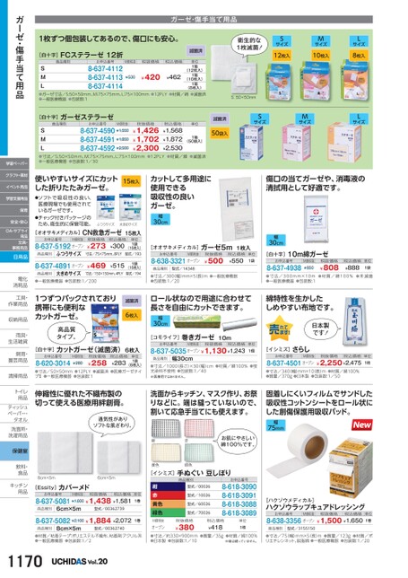 ガーゼ・傷手当て用品1枚ずつ個包装してあるので、傷口にも安心。[白十字]FCステラーゼ12折商品種別お申込番号M価税抜税抜価格税込価格SML●ガーゼ寸法/S:50×50mm、M:75×75mm、L:75×100mm●12PLY●材質/綿●滅菌済●一般医療機器●包装数:18-637-41128-637-41138-637-4114¥420(12枚入)(10枚入)¥462(8枚入)¥5301箱1箱滅菌済単位1箱[白十字]ガーゼステラーゼ商品種別お申込番号M価税抜税抜価格SML●寸法/S:50×50mm、M:75×75mm、L:75×100mm●12PLY●材質/綿●滅菌済●一般医療機器●包装数:1/308-637-4590¥1,5508-637-4591¥1,8508-637-4592¥2,500¥1,426¥1,702¥2,300(50袋入)1箱税込価格¥1,568¥1,872¥2,530単位衛生的な1枚滅菌!Sサイズ12枚入Mサイズ10枚入Lサイズ8枚入S:50×50mmSサイズMサイズLサイズ滅菌済50袋入カットして多用途に使用できる吸収性の良いガーゼ。幅30cm[オオサキメディカル]ガーゼ5m1枚入お申込番号M価税抜8-638-3321オープン税抜価格¥500税込価格¥550単位1袋商品種別型式/14348傷口の当てガーゼや、消毒液の清拭用として好適です。幅30cm[白十字]10m綿ガーゼお申込番号8-637-4938M価税抜¥850税抜価格¥808税込価格¥888単位1袋●寸法/300(幅)mm×5(長)m●一般医療機器●包装数:1/20●寸法/300mm×10m●材質/綿100%●未滅菌●一般医療機器●包装数:1ロール状なので用途に合わせて長さを自由にカットできます。綿特性を生かしたしめやすい布地です。幅30cm[コモライフ]巻きガーゼ10mお申込番号8-637-5035オープン¥1,130¥1,243M価税抜税抜価格税込価格単位1個商品種別幅30cm●寸法/1000長さ)×30(幅)cm●材質/綿100%●蛍光染料不使用●包装数:1/40※医療用ではありません。日本製です![イシミズ]さらしお申込番号M価税抜8-637-4501オープン税抜価格税込価格¥2,250¥2,475単位1枚●寸法/340幅)mm×10(長)m●材質/綿100%●質量/370g●日本製●包装数:1/50洗面からキッチン、マスク作り、お祭りなどに。端は縫っていないので、割いて応急手当てにも使えます。固着しにくいフィルムでサンドした吸収性コットンシートをロール状にした創傷保護用吸収パッド。幅75mm赤お肌にやさしい綿100%です。紺黄色紺赤黄色緑色[イシミズ]手ぬぐい豆しぼり緑色商品種別型式/00026型式/10026型式/60026型式/70026お申込番号8-618-30908-618-30918-618-30888-618-3089税抜価格¥380M価税抜オープン●寸法/約330×900mm●質量/35g●材質/綿100%●日本製●包装数:1/10税込価格¥418※端は縫っていません。単位1枚[ハクゾウメディカル]ハクゾウラップキュアドレッシングお申込番号M価税抜税抜価格税込価格8-638-3356オープン¥1,500¥1,650単位1巻商品種別型式/3155150●寸法/75(幅)mm×5(長)m●質量/123g●材質/ポリエチレンネット、脱脂綿●一般医療機器●包装数:1/20使いやすいサイズにカットした折りたたみガーゼ。15枚入●ソフトで吸収性の良い、医療現場でも使用されているガーゼです。●チャック付きパッケージのため、衛生的に保管可能。[オオサキメディカル]M価税抜お申込番号商品種別8-637-5192オープンふつうサイズ8-637-4891オープン大きめサイズ商品種別ふつうサイズ大きめサイズCN救急ガーゼ15枚入税抜価格¥273税込価格¥300(15枚入)寸法/75×75mm、8PLY型式/193単位1袋¥469(15枚入)寸法/150×150mm、4PLY型式/194¥5151袋●一般医療機器●包装数:1/2001つずつパックされており携帯にも便利なカットガーゼ。滅菌済6枚入高品質タイプ。[白十字]カットガーゼ(滅菌済)6枚入お申込番号8-620-3014M価税抜¥280税抜価格¥258(6枚入)●寸法/50×50mm●12PLY●滅菌済●医療ガーゼタイプⅡ●一般医療機器●包装数:1税込価格¥283単位1袋伸縮性に優れた不織布製の切って使える医療用絆創膏。通気性がありソフトな肌ざわり。8cm×5m6cm×5m[Essity]カバーメドお申込番号M価税抜税抜価格税込価格8-637-5081¥1,600¥1,438¥1,581商品種別6cm×5m型式/003627398-637-5082¥2,100¥1,884¥2,072商品種別8cm×5m型式/00362740単位1巻1巻●材質/粘着テープ:ポリエステル不織布、粘着剤:アクリル系●一般医療機器●包装数:1/21170Vol.20ガーゼ・傷手当て用品学習ペーパークラフト・素材イベント用品学習支援用品保育安全・安心OA・サプライ用品文具・事務用品日用品電化電化消耗品消耗品工具・工具作業用品作業用収納用品収納用雨具・雨具生活雑貨生活雑飼育・飼育園芸用品園芸用清掃用品清掃用トイレトイ用品用品ティッシュティッシュペーパー・タオルタオル洗面所・洗面所・洗濯用品洗濯用保健室飲料・飲料食品食品キッチンキッチン用品用品
