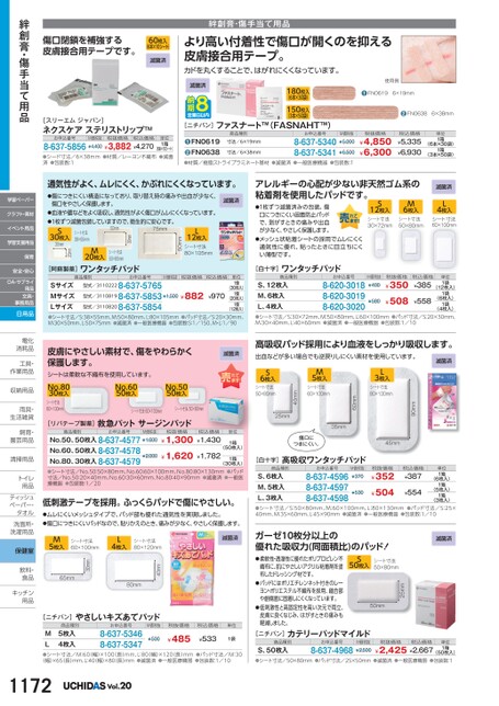 滅菌済180枚入(6本×30袋)150枚入(3本×50袋)使用例●FN06196×19mm●FN06386×38mm単位1箱1箱(6本×30袋)(3本×50袋)滅菌済L4枚入シート寸法60×100mm●1枚ずつ滅菌済みの包装。傷口につきにくい固着防止パッドで、剥がすときの痛みや出血が少なく、やさしく保護します。●メッシュ状粘着シートの採用でムレにくく通気性に優れ、貼ったときに目立ちにくい薄型です。S12枚入シート寸法30×72mmM6枚入シート寸法50×80mm[白十字]ワンタッチパッドM価税抜¥400商品種別お申込番号税抜価格S、12枚入M、6枚入L、4枚入(4枚入)●シート寸法/S:30×72mm、M:50×80mm、L:60×100mm●パッド寸法/S:20×30mm、M:30×40mm、L:40×60mm●滅菌済●一般医療機器●包装数:1/108-620-30188-620-30198-620-3020¥350¥508(12枚入)¥558(6枚入)¥5801袋1袋税込価格¥385単位1袋商品種別お申込番号M価税抜税抜価格税込価格型式/31102228-637-5765型式/31108198-637-5853型式/31108208-637-5854SサイズMサイズLサイズ(12枚入)●シート寸法/S:38×55mm、M:50×80mm、L:80×105mm●パッド寸法/S:20×30mm、M:30×50mm、L:50×75mm●滅菌済●一般医療機器●包装数:S:1/150、M・L1/90¥1,500¥882¥970(20枚入)(30枚入)1個1個単位1個傷口をやさしく保護します。●血液や膿などをよく吸収し、通気性がよく傷口がムレにくくなっています。●1枚ずつ滅菌包装していますので、衛生的に安心です。50mm75mmL12枚入シート寸法80×105mm50mm30mmM20枚入シート寸法50×80mmシート寸法38×55mm20mmS30枚入30mm[阿蘇製薬]ワンタッチパッド通気性がよく、ムレにくく、かぶれにくくなっています。●傷につきにくい構造になっており、取り替え時の痛みや出血が少なく、アレルギーの心配が少ない非天然ゴム系の粘着剤を使用したパッドです。滅菌済お申込番号8-637-53408-637-5341M価税抜¥5,000¥6,500税抜価格¥4,850¥6,300税込価格¥5,335¥6,930商品種別寸法/6×19mm寸法/6×38mmFN0619FN0638●●●材質/樹脂ストライプラミネート基材●滅菌済●一般医療機器●包装数:1[ニチバン]ファスナート™(FASNAHT™)[スリーエムジャパン]ネクスケアステリストリップTMお申込番号M価税抜税抜価格税込価格8-637-5856¥4,400(6本×10シート)●シード寸法/6×38mm●材質/レーヨン不織布●滅菌済●包装数:1¥3,882¥4,270単位1箱滅菌済高吸収パッド採用により血液をしっかり吸収します。出血などが多い場合でも逆戻りしにくい素材を使用しています。滅菌済90mmL3枚入シート寸法80×130mm60mm35mmM5枚入シート寸法60×100mm40mm傷口につきにくい。45mmS6枚入シート寸法50×80mm25mm単位[白十字]高吸収ワンタッチパッドM価税抜¥370商品種別お申込番号税抜価格S、6枚入M、5枚入L、3枚入●シート寸法/S:50×80mm、M:60×100mm、L:80×130mm●パッド寸法/S:25×40mm、M:35×60mm、L:45×90mm●滅菌済●一般医療機器●包装数:1/108-637-45968-637-45978-637-4598¥352¥504¥554(6枚入)(5枚入)(3枚入)¥5301箱1箱税込価格¥387単位1箱ガーゼ10枚分以上の優れた吸収力(同面積比)のパッド!滅菌済[ニチバン]カテリーパッドマイルド商品種別お申込番号税抜価格税込価格S、50枚入●シート寸法/50×80mm●パッド寸法/25×50mm●滅菌済●一般医療機器●包装数:1¥2,425¥2,6678-637-4968(50枚入)M価税抜¥2,500単位1箱シート寸法50×80mm25mm50mmS50枚入●柔軟性・透湿性に優れたポリプロピレン不織布に、肌にやさしいアクリル粘着剤を塗布したドレッシング材です。●パッドにはポリエチレンネット付きのレーヨン・ポリエステル不織布を採用、縫合部や創傷面に固着しにくくなっています。●低刺激性と高固定性を高い次元で両立、皮膚に良くなじみ、はがすときの痛みも軽減しました。皮膚にやさしい素材で、傷をやわらかく保護します。シートは柔軟な不織布を使用しています。No.8030枚入No.6050枚入No.5050枚入シート寸法80×130mmシート寸法60×100mmシート寸法50×80mm[リバテープ製薬]救急パットサージンパッド商品種別お申込番号M価税抜No.50、50枚入8-637-4577¥1,600No.60、50枚入8-637-4578No.80、30枚入8-637-4579¥2,000税抜価格¥1,300¥1,620税込価格¥1,430¥1,7821箱(50枚入)1箱(30枚入)●シート寸法/No.50:50×80mm、No.60:60×100mm、No.80:80×130mm●パッド寸法/No.50:20×40mm、No.60:30×60mm、No.80:40×90mm●滅菌済●一般医療機器●包装数:1/20低刺激テープを採用。ふっくらパッドで傷にやさしい。●ムレにくいメッシュタイプで、パッド部も優れた通気性を実現しました。●傷口につきにくいパッドなので、貼りかえのとき、痛みが少なく、やさしく保護します。M5枚入シート寸法60×100mmL4枚入シート寸法80×120mm滅菌済40mm80mm30mm65mm[ニチバン]やさしいキズあてパッド商品種別お申込番号M価税抜税抜価格税込価格単位5枚入4枚入ML●シート寸法/M:60(幅)×100(長)mm、L80(幅)×120(長)mm●パッド寸法/M:308-637-53468-637-5347¥485(幅)×65長)mm、L:40(幅)×80(長)mm●滅菌済●一般医療機器●包装数:1/10¥533¥5001袋傷口閉鎖を補強する皮膚接合用テープです。60枚入(6本×10シート)滅菌済絆創膏・傷手当て用品より高い付着性で傷口が開くのを抑える皮膚接合用テープ。カドを丸くすることで、はがれにくくなっています。絆創膏・傷手当て用品学習ペーパークラフト・素材イベント用品学習支援用品保育安全・安心OA・