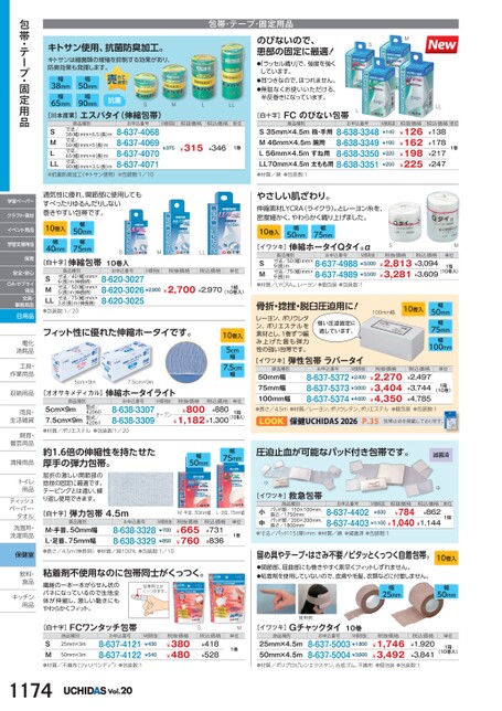 包帯・テープ・固定用品のびないので、患部の固定に最適!MS●「ラッセル織り」で、強度を強くしています。●耳つきなので、ほつれません。●無駄なくお使いいただける、半反巻きになっています。[白十字]FCのびない包帯MLLLLLLキトサン使用、抗菌防臭加工。キトサンは細菌類の増殖を抑制する効果があり、防臭効果も発揮します。幅38mm幅65mm幅50mm幅抗菌90mmエスパタイ(伸縮包帯)S[川本産業]寸法/38(幅)mm×6.5長)m寸法/50(幅)mm×5長)m寸法/65(幅)mm×4長)m寸法/90(幅)mm×3.5長)mSMLLL●抗菌防臭加工(キトサン使用)●包装数:1/108-637-40688-637-40698-637-40708-637-4071商品種別お申込番号M価税抜税抜価格税込価格単位¥375¥315¥3461巻商品種別お申込番号8-638-3348S35mm×4.5m指・手用8-638-3349M46mm×4.5m腕用8-638-3350L56mm×4.5mすね用LL70mm×4.5m太もも用8-638-3351M価税抜¥140¥180¥220¥250税抜価格¥126¥162¥198¥225税込価格単位¥138¥178¥217¥2471巻●材質/綿●包装数:1通気性に優れ、関節部に使用してもすべったりゆるんだりしない巻きやすい包帯です。10巻入幅40mm幅50mm幅75mm[白十字]伸縮包帯10巻入S商品種別寸法/40幅)mm×6(長)m(伸長時)寸法/50幅)mm×5(長)m(伸長時)寸法/75幅)mm×3.8(長)m(伸長時)SMLL●包装数:1/20お申込番号8-620-30278-620-30268-620-3025MLLM価税抜税抜価格税込価格単位¥2,900¥2,700¥2,9701組(10巻入)フィット性に優れた伸縮ホータイです。5cm×9m7.5cm×9m10巻入5cm幅7.5cm幅商品種別[オオサキメディカル]伸縮ホータイライト8-638-3307オープン8-638-33095cm×9m7.5cm×9m●材質/ポリエステル●包装数:1/20型式/42060型式/42061お申込番号M価税抜税抜価格¥800税込価格¥880¥1,182¥1,300単位1箱(10巻入)やさしい肌ざわり。伸縮素材LYCRA(ライクラ)とレーヨン糸を、密度細かく、やわらかく織り上げました。10巻入幅幅50mm75mm[イワツキ]伸縮ホータイQタイ®αS商品種別お申込番号寸法/50幅)mm×9(長)m寸法/75幅)mm×9(長)mSM●材質/LYCRA®、レーヨン●個包装●包装数:18-637-49888-637-4989M価税抜¥3,000¥3,500税抜価格税込価格¥2,813¥3,094¥3,281¥3,609M単位1箱(10巻入)骨折・捻挫・脱臼圧迫用に!強い圧迫固定に適しています。レーヨン、ポリウレタン、ポリエステルを素材とし、1巻ずつ編み上げた最も弾力性の強い包帯です。[イワツキ]弾性包帯ラバータイ100mm幅10巻入幅50mm幅75mm幅100mmM価税抜商品種別税抜価格お申込番号50mm幅75mm幅100mm幅●長さ/4.5m●材質/レーヨン、ポリウレタン、ポリエステル●個包装●包装数:18-637-5372¥2,4008-637-5373¥3,6008-637-5374¥4,600¥2,270¥3,404¥4,350税込価格¥2,497¥3,744¥4,785単位1箱(10巻)保健UCHIDAS2026P.35包帯止めを掲載しております。約1.6倍の伸縮性を持たせた厚手の弾力包帯。幅50mm幅75mm圧迫止血が可能なパッド付き包帯です。滅菌済屈折の激しい関節部の捻挫の固定に最適です。テーピングとは違い、繰り返し使用できます。[白十字]弾力包帯4.5m商品種別お申込番号M・手首、50mm幅L・足首、75mm幅●長さ/4.5m(伸長時)●材質/綿100%●包装数:1/108-638-33288-638-3329¥850M価税抜¥700L・足首、75mm幅M・手首、50mm幅税抜価格¥665¥760税込価格¥731¥836単位1巻粘着剤不使用なのに包帯同士がくっつく。繊維の一本一本がらせん状のバネになっているので生地全体が伸縮し、激しい動きにもやわらかくフィット。包帯同士がくっつきます。[白十字]FCワンタッチ包帯お申込番号商品種別25mm×3mSM●材質/不織布(フェリベンディ®)●包装数:18-637-41218-637-412250mm×3mM価税抜¥430¥540税抜価格¥380¥480S税込価格¥418¥528M単位1巻小[イワツキ]救急包帯中商品種別お申込番号パッド部/150×100mm、長さ/1750mmパッド部/200×200mm、長さ/1800mm小中●寸法/パッド:15(厚)mm●材質/綿●滅菌済●包装数:1税込価格8-637-4402¥8628-637-4403¥1,100¥1,040¥1,144¥784M価税抜¥830税抜価格単位1個留め具やテープ・はさみ不要!ピタッとくっつく自着包帯。●関節部、屈曲部にも巻きやすく素早くフィットしずれません。●粘着剤を使用していないので、皮膚や毛髪、衣類などに付着しません。幅25mm使用例Gチャックタイ10巻[イワツキ]商品種別お申込番号M価税抜税抜価格25mm×4.5m50mm×4.5m●材質/ポリプロピレンエラスタン、合成ゴム、不織布●個包装●包装数:18-637-5003¥1,8008-637-5004¥3,600¥1,746¥3,492税込価格¥1,920¥3,84110巻入幅50mm単位1箱(10巻入)包帯・テープ・固定用品学習ペーパークラフト・素材イベント用品学習支援用品保育安全・安心OA・サプライ用品文具・事務用品日用品電化電化消耗品消耗品工具・工具作業用品作業用収納用品収納用雨具・雨具生活雑貨生活雑飼育・飼育園芸用品園芸用清掃用品清掃用トイレトイ用品用品ティッシュティッシュペーパー・タオルタオル洗面所・洗面所・洗濯用品洗濯用保健室飲料・飲料食品食品キッチンキッチン用品用品1174Vol.20