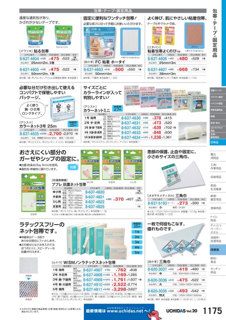 包帯・テープ・固定用品学習ペーパークラフト・素材イベント用品学習支援用品保育安全・安心OA・サプライ用品文具・事務用品日用品電化化消耗品耗工具・具・作業用品業収納用品納雨具・具・生活雑貨活飼育・育・園芸用品芸清掃用品掃トイレレ用品品ティッシュティッシュペーパー・パタオルル洗面所・洗面所・洗濯用品濯保健室飲料・料・食品食品キッチンキッチン用品品足首用ラテックスフリーのネット包帯です。●伸縮率は7〜8倍であらゆる部位にフィットします。●どの部分にはさみを入れてもほつれにくく、スピーディーな処置が行えます。[ムトウ]WiSMノンラテックスネット包帯単位商品種別税抜価格お申込番号M価税抜¥785¥7621号指用2号手足用3号腕・下腿用4号肩・大腿用5号頭用●寸法/10(幅)mm×25m(1号指用)、20(幅)mm×25m(2号手足用)、30(幅)mm×25m(3号腕・下腿用)、40幅)mm×25m(4号肩・大腿用)、50(幅)mm×25m(5号頭用)●材8-637-49078-637-4908¥1,2058-637-4909¥1,8158-637-4910¥2,6008-637-4911¥3,400税込価格¥838¥1,169¥1,285¥1,761¥1,937¥2,522¥2,774¥3,298¥3,627型式/WNNB1型式/WNNB2型式/WNNB3型式/WNNB4型式/WNNB51巻質/ポリエステル・ポリウレタン●包装数:1伸縮前伸長時※カタログに掲載の商品情報(仕様・価格・税率など)は変更になる場合がございます。最新情報はUCHIDASww.uchidas.netw単位1箱(3枚入)¥370¥4071箱(2枚入)1枚伸長時25m1号2号3号4号5号[オオサキメディカル]三角巾お申込番号M価税抜8-637-5193オープン税抜価格¥273商品種別小型式/31201税込価格¥300単位1枚●寸法/750×750×1050mm●質量/37.8g●材質/晒木綿●包装数:1/200一枚で何役もこなす、優れものです。中大特大[白十字]三角巾お申込番号8-620-3037商品種別M価税抜¥450税抜価格¥419税込価格¥460寸法/950×950×1350mm単位1枚中大8-620-3036商品種別8-620-3035商品種別特大¥510¥475¥5221枚寸法/1000×1000×1400mm¥530¥493¥5421枚寸法/1050×1050×1500mm●材質/綿布●未滅菌●包装数:1/30中・大)、1/25(特大)へ!Vol.201175適度な通気性があり、かぶれが少ないテープです。固定に便利なワンタッチ包帯!必要な長さに切って手軽にお使いいただけます。よく伸び、肌にやさしい粘着包帯。テープは手でカット可能。包帯・テープ・固定用品25mm×2m[イワツキ]貼る包帯50mm×2mお申込番号8-637-4604M価税抜¥500税抜価格¥475税込価格¥522単位1組(2巻入)商品種別25mm×2m、2巻8-637-4605¥500¥475商品種別50mm×2m、1巻¥5221巻[白十字]FC粘着ホータイお申込番号8-637-4603M価税抜¥540税抜価格¥500商品種別50mm×4m50mm※原寸大ではありません。税込価格¥550単位1巻[ニチバン]粘着包帯よくのびTM38mm※原寸大ではありません。お申込番号8-637-4606M価税抜¥480税抜価格¥480税込価格¥528単位1巻商品種別25mm×3m8-637-4607¥680商品種別38mm×3m¥668¥7341巻●材質/綿、ポリウレタン、アクリル系樹脂粘着剤●包装数:1●材質/不織布●包装数:1/200●材質/高密度ウレタン不織布●包装数:1/100必要な分だけ引き出して使えるコンパクトで保管しやすいパッケージ。サイズごとにカラーラインが判別しやすい!入って[アシスト]カラーネットミニ伸長時2.7mM価税抜¥420商品種別お申込番号税抜価格税込価格単位1号指用2号手・足用3号腕・膝・下肢用4号大腿・頭・肩用5号胸・腰・腹・軀幹用●材質/ポリエステル、ポリウレタン、ナイロン●包装数:1寸法/伸長時:8mm×2.7m、型式/300-490寸法/伸長時:18mm×2.7m、型式/300-491寸法/伸長時:30mm×2.7m、型式/300-492寸法/伸長時:40mm×2.7m、型式/300-493寸法/伸長時:65mm×2.7m、型式/300-4948-637-4630¥4158-637-4631¥5208-637-4632¥7028-637-4633¥9308-637-4634¥1,375¥1,238¥1,361¥378¥473¥639¥846¥710¥940¥5251箱よく使う腕・ひざ用ロングタイプ。[アシスト]カラーネット3号25m伸長時25mお申込番号M価税抜税抜価格税込価格8-637-4635¥3,000¥2,700¥2,970単位1箱商品種別寸法/伸長時:30mm×25m型式/100-480●材質/ポリエステル、ポリウレタン、ナイロン●包装数:1おさえにくい部分のガーゼやシップの固定に。●抗菌・防臭糸「BayRichi」を使用。●通気性・伸縮性に優れています。抗菌患部の保護、止血や固定に。小さめサイズの三角巾。ゆび用手首用ひじ用商品種別お申込番号M価税抜税抜価格税込価格[日進医療器]ププレ抗菌ネット包帯周径/フリー周径/150〜300mm寸法/約75×170mm、周径/150〜400mmゆび用寸法/約25×75mm、手首用寸法/約75×150mm、ひじ用足首用寸法/約75×170mm、●材質/ポリエステル、綿、ポリウレタン●包装数:1/36※このネット包帯は縦方向に寸法の約3倍、横方向には約6倍伸びます。8-637-48208-637-48218-637-48228-637-4825周径/150〜500mm¥390