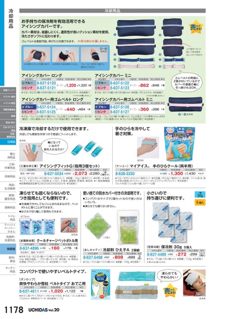 小さいので持ち運びに便利です。1個30g5個入[菅原冷蔵]保冷剤30g5個入お申込番号8-637-4489M価税抜¥300税抜価格¥272税込価格¥299単位1セット(5個入)●寸法/75縦)×85横)mm●質量/150g●包装数:1※凍らせると固くなります。凍らせてもやわらかい!使用例ふた部をくるっと返して保冷剤を出し入れできます。●●●●税抜価格税込価格単位¥862¥9481個ゴムベルトの両端にZ環が付いているのでカバーの側面の輪に引っ掛ければOK。冷却用品お手持ちの保冷剤を有効活用できるアイシングカバーです。カバー素材は、結露しにくく、通気性が良いクッション素材を使用、冷たさがソフトに伝わります。ゴムベルトは着脱可能、伸びたら交換できます。※保冷剤は付属しません。●●+使用例ふた部をくるっと外側に返す。お手持ちの保冷剤を入れる。ゴムベルト(別売)を使うと固定もできます。●●●●お申込番号M価税抜8-637-5122オープン8-637-5123商品種別ブルーピンク●●お申込番号M価税抜税抜価格税込価格単位8-637-5120オープン¥1,200¥1,3201個8-637-5121商品種別ブルーピンク●●アイシングカバーロングアイシングカバーミニ●+●使用例●寸法/約235(幅)×約90高)mm●材質/ポリエステル●包装数:1●寸法/約110幅)×約100(高)mm●材質/ポリエステル●包装数:1アイシングカバー用ゴムベルトロングアイシングカバー用ゴムベルトミニお申込番号M価税抜税抜価格税込価格単位お申込番号M価税抜税抜価格税込価格単位(ベルトは付属しません。)(ベルトは付属しません。)¥360¥3961本8-637-5126オープン8-637-5127商品種別ブルーピンク●●¥440¥4841本8-637-5124オープン8-637-5125商品種別ブルーピンク●●●寸法/ゴムベルト幅:16幅)mm、ゴムの長さ:240標準)mm、約180(最短)〜290最長)mm●ゴムベルト両端Z環付●包装数:1●寸法/ゴムベルト幅:16(幅)mm、ゴムの長さ:120(標準)mm、約90(最短)〜150最長)mm●ゴムベルト両端Z環付●包装数:1冷凍庫で冷却するだけで使用できます。冷却しても柔軟性を保つので患部にフィットします。手のひらを冷やして暑さ対策。使用例輪になっているので指を入れるだけ!使用例[三重化学工業]アイシングフィットG(指用3個セット)商品種別型式/MIF-004お申込番号M価税抜8-637-5034¥2,250税抜価格¥2,073税込価格¥2,280(3個セット)●寸法/約30(径)×80(高)mm(1個あたり)●質量/30g(1個あたり)●材質/本体袋:オレフィン系フィルム、内容物:水、CMC、不凍液、調整剤、防腐剤、着色剤●一般医療機器●医療機器認証番号24B3X00004000005号●包装数:1単位1袋[ケンユー]お申込番号8-638-3330マイアイス手のひらクール(両手用)M価税抜¥1,500税抜価格¥1,300税込価格¥1,430単位1セット●寸法/約95×45mm(1個あたり)●内容量/約33g(1個あたり)●材質/ジェル袋:水・高分子吸水樹脂・ポリエチレン、カバー:ポリエステル・ポリウレタン●包装数:1〈セット内容〉ジェル袋×4個、カバー×2個冷却用品学習ペーパークラフト・素材イベント用品学習支援用品保育安全・安心OA・サプライ用品文具・事務用品日用品電化電化消耗品消耗品工具・工具作業用品作業用収納用品収納用雨具・雨具生活雑貨生活雑飼育・飼育園芸用品園芸用清掃用品清掃用トイレトイ用品用品ティッシュティッシュペーパー・タオルタオル洗面所・洗面所・洗濯用品洗濯用保健室凍らせても固くならないので、つき指用としても便利です。●冷凍庫で冷やしてもジェル状のままなので、ペットボトルに巻くことができます。●はさみで切り離して使用もできます。約75mm使用例[紀陽除虫菊]クールチャージペットボトル用お申込番号8-637-4896M価税抜¥180商品種別型式/K-2017税抜価格¥160税込価格¥176単位1個使い捨ての防水カバー付きの冷却剤です。●コンパクトなサイズで2個セットなので使い方はいろいろ。●凍らせても硬くなりません。×2個入[あしかメディ]冷却剤ひえ子A2個組お申込番号8-637-5498M価税抜¥820税抜価格¥808税込価格¥888単位1袋(2個入)●寸法/10.5縦)×10.5横)mm●質量/100g●包装数:1飲料・飲料食品食品●本体寸法/約230(幅)×15(奥)×100高)mm●質量/42g●耐冷温度/-10℃(巻いたとき)●材質/水・高吸水性樹脂・プロピレングリコール●包装数:1/100キッチンキッチン用品用品コンパクトで使いやすいベルトタイプ。[ダンロップ]爽快やわらか雪枕ベルトタイプおでこ用お申込番号M価税抜8-637-4611¥1,100税抜価格¥1,020税込価格¥1,122単位1個●おでこ周りサイズ約41〜49cmまで対応●寸法/ジェル袋:約65×220mm●専用カバー付●包装数:1/721178Vol.20