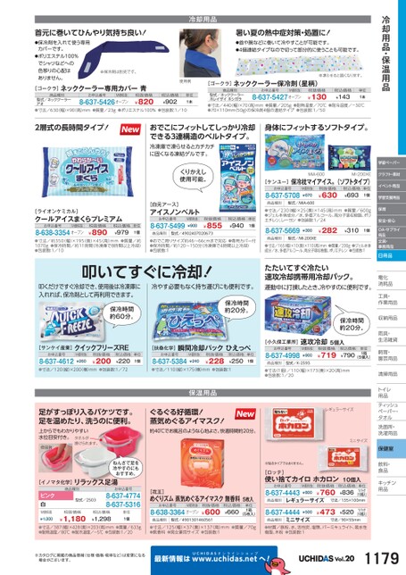 冷却用品・保温用品学習ペーパークラフト・素材イベント用品学習支援用品保育安全・安心OA・サプライ用品文具・事務用品日用品電化化消耗品耗工具・具・作業用品業収納用品納雨具・具・生活雑貨活飼育・育・園芸用品芸清掃用品掃トイレレ用品品ティッシュティッシュペーパー・パタオルル洗面所・洗面所・洗濯用品濯保健室飲料・料・食品食品キッチンキッチン用品品足がすっぽり入るバケツです。足を温めたり、洗うのに便利。ぐるぐる好循環!蒸気めぐるアイマスク!上からでもわかりやすい水位目安付き。タオルが掛けられます。使用例約40℃でお風呂のような心地よさ。快適時間約20分。レギュラーサイズミニサイズねんざで足を冷やすのにもおすすめ。[イノマタ化学]リラックス足湯ピンク白M価税抜¥1,300商品種別型式/2503お申込番号8-637-47748-637-5316税抜価格¥1,180税込価格¥1,298単位1個[花王]めぐりズム蒸気めぐるアイマスク無香料5枚入お申込番号M価税抜8-638-3364オープン税抜価格¥600税込価格¥660単位1箱(5枚入)商品種別型式/4901301460561※貼るタイプではありません。[ロッテ]使い捨てカイロホカロン10個入お申込番号8-637-4443M価税抜¥800税抜価格¥760税込価格¥836単位1パック(10個入)商品種別レギュラーサイズ寸法/135×100mm8-637-4444¥500ミニサイズ商品種別¥473¥5201パック(10個入)寸法/90×55mm●寸法/387(幅)×428(奥)×203(高)mm●質量/633g●耐熱温度/80℃●耐冷温度/-5℃●包装数:1/20●寸法/125幅)×37(奥)×137(高)mm●質量/70g●無香料●男女兼用サイズ●包装数:1●材質/鉄粉、水、活性炭、塩類、バーミキュライト、吸水性樹脂、木粉●包装数:1※カタログに掲載の商品情報(仕様・価格・税率など)は変更になる場合がございます。最新情報はUCHIDASww.uchidas.netwへ!Vol.201179首元に巻いてひんやり気持ち良い!冷却用品・保温用品冷却用品●保冷剤を入れて使う専用カバーです。●ポリエステル100%でシャツなどへの色移りの心配はありません。※保冷剤は別売です。暑い夏の熱中症対策・処置に!●首や腕などに巻いて冷やすことが可能です。●4個連結タイプなので切って部分的に使うことも可能です。[ゴークラ]ネッククーラー専用カバー青商品種別お申込番号M価税抜税抜価格型式/ネッククーラーアオ●寸法/630(幅)×90(高)mm●質量/23g●ポリエステル100%●包装数:1/108-637-5426オープン¥820税込価格¥902単位1本使用例[ゴークラ]ネッククーラー保冷剤(星柄)商品種別お申込番号M価税抜税抜価格型式/ネッククーラーホレイザイホシガラ●寸法/440(幅)×70(高)mm●質量/205g●耐熱温度/70℃●耐冷温度/-30℃●70×110mm(50g)の保冷剤4個の連結タイプ●包装数:1/508-637-5427オープン¥130税込価格¥143単位1本※凍らせると固くなります。2層式の長時間タイプ!おでこにフィットしてしっかり冷却できる3連構造のベルトタイプ。冷凍庫で凍らせるとカチカチに固くなる凍結ゲルです。くりかえし使用可能。[ライオンケミカル]クールアイスまくらプレミアムお申込番号M価税抜8-638-3354オープン税抜価格¥890税込価格¥979単位1個[白元アース]アイスノンベルトお申込番号8-637-5499M価税抜¥900税抜価格¥855税込価格¥940単位1個商品種別型式/4902407020673●寸法/約350(幅)×195(奥)×45(高)mm●質量/約1070g●保冷時間/約11時間(冷凍庫で8時間以上冷却)●包装数:1/10●おでこ周りサイズ約46〜66cmまで対応●専用カバー付●保冷時間/約120〜150分(冷凍庫で4時間以上冷却)●包装数:1叩いてすぐに冷却!冷やす必要もなく持ち運びにも便利です。身体にフィットするソフトタイプ。MIA-600MI-200XE[ケンユー]お申込番号MIA-6008-637-5708保冷枕マイアイス(ソフトタイプ)M価税抜¥670税抜価格¥630税込価格MI-200XE¥693単位1個商品種別型式/MIA-600●寸法/230(幅)×25(奥)×145(高)mm●質量/600g●ジェル本体成分/水、多価アルコール、高分子吸収樹脂、ポリエチレン、レーヨン●包装数:1/248-637-5669¥300商品種別型式/MI-200XE¥282¥3101個●寸法/165幅)×10(奥)×110(高)mm●質量/200g●ジェル本体成分/水、多価アルコール、高分子吸収樹脂、ポリエチレン●包装数:1たたいてすぐ冷たい速攻冷却携帯用冷却パック。運動中に打撲したとき、冷やすのに便利です。叩くだけですぐ冷却でき、使用後は冷凍庫に入れれば、保冷剤として再利用できます。保冷時間約60分。[サンケイ産業]クイックフリーズREお申込番号8-637-4612M価税抜¥260税抜価格¥200税込価格¥220単位1個[扶桑化学]お申込番号8-637-5384瞬間冷却パックひえっぺM価税抜¥240税抜価格¥228税込価格¥250単位1個●寸法/120(縦)×200(横)mm●包装数:1/72●寸法/110縦)×175横)mm●包装数:1保温用品保冷時間約20分。保冷時間約20分。[小久保工業所]速攻冷却5個入お申込番号8-637-4998M価税抜¥900税抜価格¥719税込価格¥790単位1箱(5個入)商品種別型式/K-2593●寸法(1個)/110(幅)×173(奥)×20(高)mm●包装数:1/20