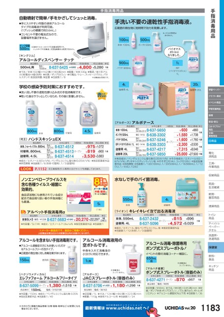 900mLパウチ900mL4L詰替用4Lバイオマスボトルになりました。1L(バイオマスボトル)BP1L20L詰替用20L学習ペーパー手指消毒用品手洗い不要の速乾性手指消毒液。広範囲の微生物に短時間で効力を発揮します。※ノズルの別売はありません。100mL本体100mL500mLポンプ付500mL188mm手指消毒用品自動噴射で簡単!手をかざしてシュッと消毒。●手に入りやすい市販の液体アルコールタイプの消毒液が利用可能。(1プッシュの噴霧で約0.6mL。)●コンセント不要の電池式なので、設置場所を選びません。タンク容量500mL※液体アルコールタイプの消毒液専用です。ジェルタイプの消毒液、次亜塩素酸水は使用できません。商品種別お申込番号M価税抜税抜価格税込価格型式/TE500-w8-637-5425¥4,900¥4,800¥5,280500mL用●寸法/本体:102(幅)×162(奥)×180高)mm●質量/本体:330g●電源/単三形アルカリ乾電池×4個(別売)●材質/ポリプロピレン●付属品/トレー、メッセージパネル、パネルスタンド、取扱説明書、保証書●包装数:1/8※消毒液は別売です。単位1台mm2120m12m[キングジム]アルコールディスペンサーテッテ学校の感染予防対策におすすめです。●洗い流し不要の速乾性擦り込み式の手指消毒剤です。●乾いた後はサラッとしているため、その後に影響しません。800mL本体800mL付替用4.5L詰替用[花王]ハンドスキッシュEX商品種別お申込番号M価税抜税抜価格税込価格単位本体、ショートノズル、800mL付替用、800mL詰替用、4.5L●成分/エタノール(65V/V%)、ベンザルコニウム塩化物(0.05W/V%)●指定医薬部外品●非危険物●包装数:1/6本体・付替用)、1/3詰替用)¥975¥1,072¥819¥900¥3,530¥3,8838-637-45128-637-45138-637-4514型式/507310型式/507204型式/507211オープン1本LOOKP.1152花王業務用ボトル専用小分けキャップを掲載しております。ノンエンベロープウイルスを含む各種ウイルス・細菌に効果的。食品添加物にも使用されている成分配合で食品取り扱い者の手指消毒にも最適。沖縄・離島はサービス対象外5L(1本)アルペット手指消毒用α商品種別お申込番号M価税抜税抜価格税込価格型式/412388-637-5683¥21,840¥20,270¥22,297本体5L×3●内容量/5L1本)●成分/エタノール71.8w/w%●指定医薬部外品●包装数:1(3本入)単位1組※メーカー直送品です。返品はご容赦ください。上記商品は受注日から8営業日以内のお届けになります。[アルボース]アルボナース商品種別お申込番号M価税抜税抜価格税込価格単位型式/型式/14152型式/SW-986-201-08-637-56508-638-3302SW-986-204-98-637-52468-638-3303SW-986-198-08-637-4217SW-986-199-08-637-5850本体100mLポンプ付500mLパウチ900mLBP(バイオマスボトル)1L詰替用4L¥27,5001箱詰替用20L●有効成分/ベンザルコニウム塩化物(0.05W/V%)●その他成分/エタノール(65〜67V/V%)、ポリオキシエチレンラノリン他●そそぎ口付(4L)、コック付(20L)●指定医薬部外品●非危険物●包装数:1/120(100mL)、1/20500mL)、1/16900mL)、1/12¥600¥1,580¥1,600¥2,300¥7,315¥25,000¥660¥1,738¥1,7601袋¥2,530¥8,046型式/14146型式/オープン型式/1本1本(1L)、1/44L)、1(20L)水なしで手のバイ菌消毒。550mL本体4L詰替用[ライオン]キレイキレイ泡で出る消毒液商品種別お申込番号M価税抜本体、550mL詰替用、4L●成分/エタノール、塩化ベンザルコニウム、他●指定医薬部外品●包装数:1/12(本体)、1/3(詰替用)8-637-2432オープン8-637-5096税抜価格¥815税込価格¥896¥4,572¥5,029単位1本クラフト・素材イベント用品学習支援用品保育安全・安心OA・サプライ用品文具・事務用品日用品電化化消耗品耗工具・具・作業用品業収納用品納雨具・具・生活雑貨活飼育・育・園芸用品芸清掃用品掃トイレレ用品品ティッシュティッシュペーパー・パタオルル洗面所・洗面所・洗濯用品濯保健室飲料・料・食品食品キッチンキッチン用品品アルコールを含まない手指消毒剤です。●アルコール過敏症の方にもお使いいただけるアルコールフリーの泡タイプ。●広範囲の微生物に対し消毒効果があります。150mL使用例アルコール消毒液用の空ボトルです。中身を入れて消毒液の小分けに対応できます。1L用[ハクゾウメディカル]エレファフォームアルコールフリータイプお申込番号M価税抜税抜価格税込価格8-637-5099オープン¥1,380¥1,518単位1本※消毒液は入っていません。[アルボース]JACスプレーボトル(容器のみ)お申込番号M価税抜税抜価格税込価格8-637-5706¥1,400¥1,180¥1,298単位1本商品種別150mL型式/3102100商品種別型式/36163●内容量/150mL●成分/ベンザルコニウム塩化物0.05%●指定医薬部外品●包装数:1/40●収容量/1L●寸法/124(幅)×86(奥)×223(高)mm●質量/110g●液体アルコール用●包装数:1/24アルコール消毒・除菌専用ポンプ式スプレーボトル!イベントの際の消毒コーナー増設に。650mL用※消毒液は入っていません。[マルハチ産業]ポンプ式スプレーボトル(容器のみ)お申込番号M価税抜8-637-4271オープン税抜価格¥870税込価格¥957単位1本商品種別型式/#695●収容量/650mL●寸法/88(径)×245(高)mm●材質/ポンプ本体:ポリプロピレン、ノズル:真ちゅう、ボトル:ポリエチレン●アルコール濃度80%以下用●包装数:1/36※カタログに掲載の商品情報(仕様・価格・税率など)は
