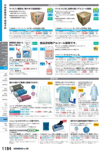 対物除菌用品ウイルス・菌除去!隅々まで浸透除菌!!●食品添加物でできており、食品に振りかかっても安心。●腐食性を抑えた配合なので、金属製調理器具にも安心。20Lアルコールウイルスに対し効果の高いアルコール製剤。●ノロウイルス※に対してタンパク質存在下でも効果を発揮。●インフルエンザウイルスにも効果を発揮。●食品添加物規格で、厨房など食周りでも安心。※ノロウイルス代替のネコカリシウイルスで検査。20Lアルコール[三菱商事ライフサイエンス]メイオールSA6520L[三菱商事ライフサイエンス]エークイックPRO20L商品種別型式/49734801042158-637-5473オープン軽減税率対象品お申込番号M価税抜税抜価格¥9,800税込価格¥10,584単位1箱商品種別型式/49734801314028-637-5474オープン税抜価格¥18,000税込価格¥19,440単位1箱軽減税率対象品お申込番号M価税抜●寸法/外装:309(横)×304(奥)×300高)mm●内容量/20L●材質/外装:段ボールケース、内装:樹脂袋(2重フィルムタイプ)●成分/エタノール57.2%、グリセリン脂肪酸エステル0.06%、グリコノデルタラクトン0.060%、乳酸ナトリウム0.010%●包装数:1●寸法/外装:295横)×295奥)×301(高)mm●内容量/20L●材質/外装:段ボールケース、内装:樹脂袋(2重フィルムタイプ)●成分/エタノール55.0%、乳酸2.13%、グリセリン脂肪酸エステル0.020%、乳酸ナトリウム0.020%●包装数:1調理器具・食器にも安心して使える。食品にも安心。アルコール420mL4L4L食品添加物アルコール製剤です。[友和]ティポス除菌アルコールスプレーお申込番号M価税抜8-637-4644オープン税抜価格¥489税込価格単位¥5371本商品種別本体420mL8-637-4079オープン¥4,100¥4,5101本商品種別補充用4L●エタノール58%●食品添加物●包装数:1/24本体)、1/4(補充用)首から掛けて簡単に装着できます。●アルコールと有機酸との相乗効果でノンエンベロープウイルスにも対応します。●消防法上の危険物に該当しない商品です。[アルボース]ウイルスマッシュ4L商品種別型式/SW-988-191-0お申込番号M価税抜税抜価格8-637-5767オープン¥4,211軽減税率対象品アルコール税込価格¥4,547単位1本500mL用●寸法/190(幅)×121(奥)×270(高)mm●容量/4L●液性/弱酸性●成分/エタノール58.00w/w%、グリセリン脂肪酸エステル0.30%、フィチン酸0.05%、グリセリン0.2%、精製水41.45%●用途/調理用具、調理機器類の除菌や、食品の品質保持●包装数:1/4※調理用具、機器類はよく洗浄、すすぎをし水分を拭き取ったのち、全体に噴霧する。[アルボース]ウイルスマッシュ専用スプレーボトル(空ボトル)商品種別型式/SW-988-190-0税込価格¥500●寸法/93(幅)×62(奥)×225(高)mm●容器容量/500mL●包装数:1/508-637-5768オープン¥455お申込番号税抜価格M価税抜単位1本感染予防50枚入経済性と使いやすさを考えた長袖プラスチックガウンです。20枚入血液・体液・排泄物などから従事者を保護するための袖付ディスポーザブルエプロンです。15枚入親指フックタイプ[ハクゾウメディカル]ハクゾウプラスチックガウンα商品種別型式/3087735お申込番号8-638-3311単位1箱M価税抜オープン税抜価格¥955税込価格¥1,050(15枚入)●寸法/着丈:1050±5mm、エプロン幅:約970±5mm、袖を伸ばした状態:1790±5mm、親指穴間:1745±5mm●袖口親指フックタイプ●材質/ポリエチレン●包装数:1/18[ムトウ]プラスチックガウンブルーお申込番号8-637-46391100mm袖を伸ばした状態での長さ1740mmM価税抜¥2,200税抜価格税込価格¥1,980¥2,178(20枚入)●寸法/袖を伸ばした状態:1740(幅)mm●着丈/1100mm●材質/ポリエチレン●袖口ゴム入●包装数:1単位1箱ピンク[ムトウ]プラスチックエプロン720mm商品種別お申込番号M価税抜税抜価格税込価格単位ホワイトブルーピンク●寸法/720幅)mm●着丈/1200mm●材質/ポリエチレン●包装数:1/148-637-46408-637-46418-637-4642¥1,364¥1,500¥1,5001箱(50枚入)1200mmブルーピンクホワイトホワイトブルーシュッ!と入れてポンッ!と取り付け。踏むだけでワンタッチでシューズカバーを装着できる便利なシューズカバー取付器です。靴をカバーしたいさまざまなシーンで活躍します。厚手ながら通気性抜群の不織布キャップ。ポリプロピレン不織布製で、ラテックスフリーのゴムを使用しています。100枚入シューポン専用シューズカバー詰め替え用[三和製作所]シューポン専用シューズカバー100枚入お申込番号M価税抜税抜価格税込価格8-637-5086¥2,480¥2,233¥2,456単位1袋(100枚入)商品種別型式/00035270シューズカバーシューポン2[三和製作所]シューズカバー取付器シューポン2お申込番号M価税抜8-638-3371¥9,800税抜価格税込価格単位¥8,821¥9,7031台使用例WiSMディスポキャップ(厚手)ブルーお申込番号M価税抜税抜価格税込価格8-637-5668¥1,200¥1,091¥1,200単位1箱(100枚入)商品種別型式/00366030商品種別型式/WDCT-B●適応シューズ目安/30cmまで●材質/ポリエチレン●包装数:1●寸法/215幅)×420奥)×130(高)mm●質量/1.35kg●材質/ポリプロピレン、プラスチック●包装数:1●寸法/約29(径)cm●質量/3g●材質/ポリプロピレン不織布、合成ゴム●サイズ/フリー●包装数:1/101184Vol.20対物除菌用品・感染予防学習ペーパークラフト・素材イベント用