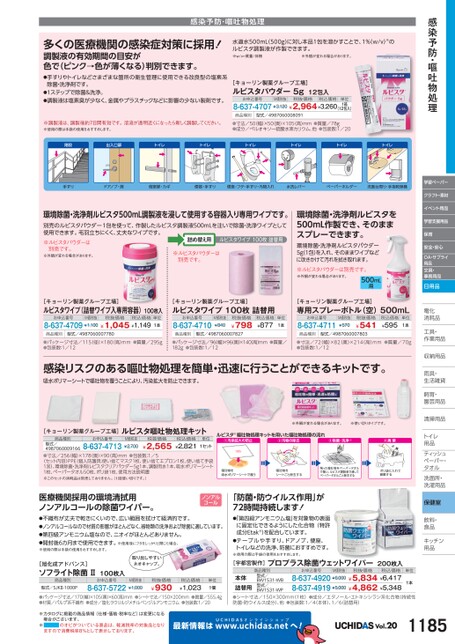感染予防・嘔吐物処理学習ペーパークラフト・素材イベント用品学習支援用品保育安全・安心OA・サプライ用品文具・事務用品日用品電化化消耗品耗工具・具・作業用品業収納用品納雨具・具・生活雑貨活飼育・育・園芸用品芸清掃用品掃トイレレ用品品ティッシュティッシュペーパー・パタオルル洗面所・洗面所・洗濯用品濯保健室飲料・料・食品食品キッチンキッチン用品品感染予防・嘔吐物処理多くの医療機関の感染症対策に採用!調製液の有効期間の目安が色で(ピンク→色が薄くなる)判別できます。●手すりやトイレなどさまざまな箇所の衛生管理に使用できる改良型の塩素系除菌・洗浄剤です。●1ステップで除菌&洗浄。●調製液は塩素臭が少なく、金属やプラスチックなどに影響の少ない製剤です。水道水500mL(500g)に対し本品1包を溶かすことで、1%(w/v)※のルビスタ調製液が作製できます。※w/v=質量/体積※外観が変わる場合があります。[キョーリン製薬グループ工場]ルビスタパウダー5g12包入お申込番号M価税抜税抜価格税込価格8-637-4707¥3,120¥2,964¥3,260単位1箱(12包入)商品種別型式/4987060008091※調製液は、調製後約7日間有効です。溶液が透明近くになったら新しく調製してください。※使用の際は手袋の使用をおすすめします。●寸法/50(幅)×50奥)×105(高)mm●質量/78g●成分/ペルオキソー硫酸水素カリウム、他●包装数:1/20階段出入口扉トイレトイレトイレトイレトイレトイレ手すりドアノブ・扉個室扉・カギ便器・手すり便座・フタ・手すり・汚物入れ水洗レバーペーパーホルダー洗面台周り・手指乾燥機環境除菌・洗浄剤ルビスタ500mL調製液を浸して使用する容器入り専用ワイプです。ルビスタパウダー関連別売品別売のルビスタパウダー1包を使って、作製したルビスタ調製液500mLを注いで除菌・洗浄ワイプとして使用できます。毛羽立ちにくく、丈夫なワイプです。※ルビスタパウダーはルビスタワイプ100枚詰替用詰め替え用別売です。※外観が変わる場合があります。[キョーリン製薬グループ工場]ルビスタワイプ(詰替ワイプ入専用容器)100枚入お申込番号M価税抜税抜価格8-637-4709¥1,100¥1,045¥1,149税込価格単位1本※ルビスタパウダーは別売です。[キョーリン製薬グループ工場]ルビスタワイプ100枚詰替用お申込番号8-637-4710M価税抜¥840税抜価格¥798税込価格¥877単位1本環境除菌・洗浄剤ルビスタを500mL作製でき、そのままスプレーできます。環境除菌・洗浄剤ルビスタパウダー5g1包)を入れ、そのままワイプなどに吹きかけて汚れを拭き取れます。※ルビスタパウダーは別売です。※外観が変わる場合があります。500mL用[キョーリン製薬グループ工場]専用スプレーボトル(空)500mLお申込番号8-637-4711M価税抜¥570税抜価格¥541税込価格¥595単位1本商品種別型式/4987060007780商品種別型式/4987060007827商品種別型式/4987060007803●パッケージ寸法/115(径)×180(高)mm●質量/295g●包装数:1/12●パッケージ寸法/96幅)×96奥)×140(高)mm●質量/182g●包装数:1/12●寸法/72(幅)×82(奥)×214(高)mm●質量/70g●包装数:1/12感染リスクのある嘔吐物処理を簡単・迅速に行うことができるキットです。吸水ポリマーシートで嘔吐物を覆うことにより、汚染拡大を防止できます。[キョーリン製薬グループ工場]ルビスタ嘔吐物処理キット商品種別型式/4987060009166お申込番号8-637-4713M価税抜¥2,700税抜価格¥2,565税込価格¥2,821単位1セット●寸法/256(幅)×178(奥)×90(高)mm●包装数:1/5〈セット内容〉PPE個人防護具:使い捨てマスク1枚、使い捨てエプロン1枚、使い捨て手袋1双)、環境除菌・洗浄剤ルビスタクリアパウダー5g1本、調製用水1本、吸水ポリマーシート1枚、ペーパータオル50枚、ポリ袋1枚、使用方法説明書※このセットの消耗品は別売しておりません。(1回使い切りです。)※外観が変わる場合があります。※使い切りタイプです。ルビスタⓇ嘔吐物処理キットを用いた嘔吐物処理の流れ①汚染拡大の防止②汚物の除去③除菌・洗浄※④廃棄このし面てを上ださい嘔吐物を吸水ポリマーシートで覆う嘔吐物をシートごと除去する残った嘔吐物をペーパータオルで覆い、ルビスタ調製液で浸してペーパータオルごと除去するポリ袋に入れて破棄する医療機関採用の環境清拭用ノンアルコールの除菌ワイパー。ノンアルコール「防菌・防ウイルス作用」が72時間持続します!●不織布が丈夫で乾きにくいので、広い範囲を拭けて経済的です。●ノンアルコールなので材質の影響がほとんどなく、器物類の洗浄および除菌に適しています。●第四級アンモニウム塩なので、ニオイがほとんどありません。●開封後6カ月まで使用できます。※使用後にフタをしっかりと閉じた場合。※使用の際は手袋の使用をおすすめします。[旭化成アドバンス]ソフライト除菌Ⅱ100枚入商品種別型式/SJKⅡ-1000Pお申込番号8-637-5722取り出しやすいネオキャップ。M価税抜¥1,000税抜価格¥930税込価格¥1,023単位1個●パッケージ寸法/170幅)×105(奥)×60高)mm●シート寸法/150×200mm●質量/555.4g●材質/パルプ系不織布●成分/塩化ラウリ