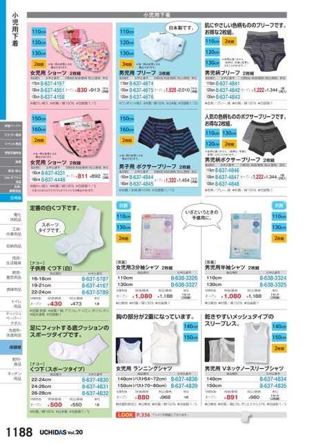 小児用下着日本製です。肌にやさしい色柄もののブリーフです。お得な2枚組。2枚組110cm120cm※色柄は選べません。(色柄は、写真と変更に130cm男児柄ブリーフ2枚組なることがあります。)商品種別お申込番号110cm8-637-4841120cm8-637-4842130cm8-637-4843商品種別お申込番号M価税抜税抜価格税込価格単位商品種別お申込番号M価税抜税抜価格税込価格単位M価税抜税抜価格税込価格単位オープン¥830¥9131セット(2枚組)オープン¥1,828¥2,0101セット(3枚組)オープン¥1,222¥1,3441袋(2枚入)●細かい柄入●材質/綿100%●包装数:1/5●ワンポイント柄入●材質/綿100%●日本製●包装数:1/20●色柄/グレー、紺●材質/綿100%●包装数:1150cm160cm2枚組※色・柄は変更になる場合があります。商品種別女児用ショーツ2枚組150cm8-637-4331オープン¥811¥892お申込番号M価税抜税抜価格税込価格単位1セット(2枚組)160cm8-637-4446●細かい柄入●材質/綿100%●包装数:1/5※足ゴムまたはウエストゴムがフラットになる場合があります。定番の白くつ下です。スポーツタイプです。[ナコー]子供用くつ下(白)商品種別16-18cm19-21cm22-24cmお申込番号8-637-57878-637-41678-637-5789M価税抜オープン税抜価格¥430税込価格¥473単位1足●抗菌・防臭●材質/綿、アクリル、ナイロン、ポリウレタン●吸水速乾●包装数:1足にフィットする底クッションのスポーツタイプです。150cm160cm2枚組※色・柄は変更になる場合があります。商品種別男子用ボクサーブリーフ2枚組150cm8-637-4844オープン¥1,322¥1,4541セットM価税抜税抜価格税込価格お申込番号単位160cm8-637-4845(2枚組)人気の色柄もののボクサーブリーフです。お得な2枚組。110cm130cm120cm2枚組※色柄は選べません。(色柄は、写真と変更になることがあります。)男児柄ボクサーブリーフ2枚組M価税抜税抜価格税込価格単位オープン¥1,222¥1,3441袋(2枚入)商品種別お申込番号110cm8-637-4846120cm8-637-4847130cm8-637-4848●材質/本体:綿100%●包装数:1/10●色柄/グレー、紺●材質/綿100%●包装数:1抗菌110cm130cm2枚組いざというときの予備用に。[双基]女児用3分袖シャツ2枚組商品種別110cm130cm[双基]男児用半袖シャツ2枚組商品種別110cm130cmお申込番号8-638-33268-638-3327抗菌110cm130cm2枚組お申込番号8-638-33248-638-3325M価税抜オープン税抜価格¥1,080税込価格¥1,188●白無地●材質/綿100%●包装数:1単位1セット(2枚組)M価税抜オープン税抜価格¥1,080税込価格¥1,188●白無地●材質/綿100%●包装数:1単位1セット(2枚組)胸の部分が2重になっています。140cm乾きやすいメッシュタイプのスリーブレス。140cm150cm150cm2枚組[ナコー]くつ下(スポーツタイプ)商品種別22-24cm24-26cm26-28cmM価税抜オープン税抜価格¥500税込価格¥550単位1足●材質/綿100%●日本製●包装数:1/51188Vol.20お申込番号8-637-48308-637-48318-637-4832女児用ランニングシャツ商品種別140cm(バスト64〜72cm)150cm(バスト70〜80cm)お申込番号8-637-48388-637-4839M価税抜オープン税抜価格¥880税込価格¥968単位1枚140cm150cmM価税抜オープン男児用Vネックノースリーブシャツ商品種別お申込番号8-637-48348-637-4835税抜価格¥891税込価格¥980単位1セット(2枚組)●抗菌防臭加工●白無地●材質/綿100%●包装数:1/5●白無地●材質/綿63%、ポリエステル37%●包装数:1/5P.336Tシャツを掲載しております。110cm120cm130cm3枚組※色・柄は変更になる場合があります。男児用ブリーフ3枚組110cm8-637-4674120cm8-637-4675130cm8-637-4676※色・柄は変更になる場合があります。女児用ショーツ2枚組110cm8-637-4157120cm8-637-4551130cm8-637-4158110cm120cm130cm2枚組小児用下着学習ペーパークラフト・素材イベント用品学習支援用品保育安全・安心OA・サプライ用品文具・事務用品日用品電化電化消耗品消耗品工具・工具作業用品作業用収納用品収納用雨具・雨具生活雑貨生活雑飼育・飼育園芸用品園芸用清掃用品清掃用トイレトイ用品用品ティッシュティッシュペーパー・タオルタオル洗面所・洗面所・洗濯用品洗濯用保健室飲料・飲料食品食品キッチンキッチン用品用品