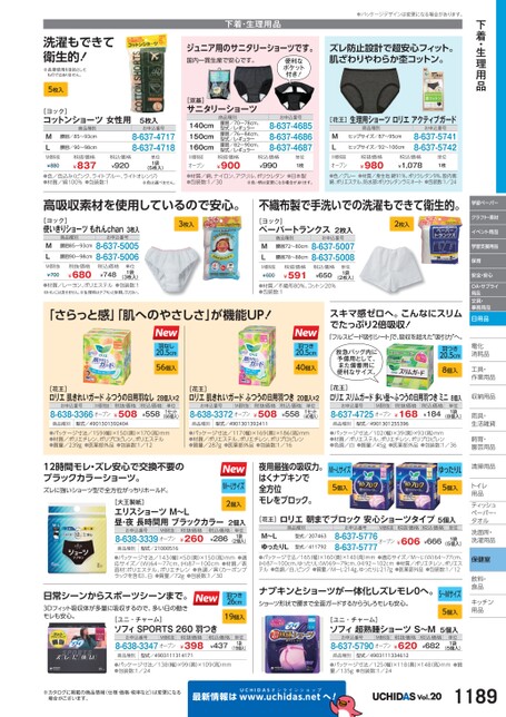 下着・生理用品学習ペーパークラフト・素材イベント用品学習支援用品保育安全・安心OA・サプライ用品文具・事務用品日用品電化化消耗品耗工具・具・作業用品業収納用品納雨具・具・生活雑貨活飼育・育・園芸用品芸清掃用品掃トイレレ用品品ティッシュティッシュペーパー・パタオルル洗面所・洗面所・洗濯用品濯保健室飲料・料・食品食品キッチンキッチン用品品洗濯もできて衛生的!※長期使用を目的としたものではありません。5枚入下着・生理用品※パッケージデザインは変更になる場合があります。ジュニア用のサニタリーショーツです。国内一貫生産で安心です。便利なポケット付き!ズレ防止設計で超安心フィット。肌ざわりやわらか杢コットン。[ヨック]コットンショーツ女性用5枚入お申込番号8-637-47178-637-4718商品種別腰囲/85〜93cm腰囲/90〜98cmMLM価税抜¥880税抜価格¥837税込価格¥920単位1袋(5枚入)●色/色込み(ピンク、ライトブルー、ライトオレンジ)●材質/綿100%●包装数:1※色は選べません。[双基]サニタリーショーツ140cm150cm160cm商品種別腰囲/70〜78cm、型式/レギュラー腰囲/76〜84cm、型式/レギュラー腰囲/82〜90cm、型式/レギュラーお申込番号8-637-46858-637-46868-637-4687税抜価格¥900M価税抜オープン●材質/綿、ナイロン、アクリル、ポリウレタン●日本製●包装数:1/30税込価格¥990※色・柄は変更になる場合があります。単位1枚[花王]生理用ショーツロリエアクティブガード商品種別ヒップサイズ/87〜95cmヒップサイズ/92〜100cmお申込番号8-637-57418-637-5742ML税抜価格¥980M価税抜オープン●色/グレー●材質/身生地:綿91%、ポリウレタン9%、股内側:綿、ポリエステル、防水部:ポリウレタンラミネート●包装数:1/24税込価格¥1,078単位1枚高吸収素材を使用しているので安心。不織布製で手洗いでの洗濯もできて衛生的。[ヨック]使いきりショーツもれんchan3枚入商品種別腰囲85〜93cm腰囲90〜98cmMLお申込番号8-637-50058-637-5006税込価格¥748単位1袋M価税抜¥700税抜価格¥680(3枚入)●材質/レーヨン、ポリエステル●包装数:1※トイレには流せません。※生理時はナプキンと併用してください。3枚入2枚入[ヨック]ペーパートランクス2枚入商品種別腰囲72〜80cm腰囲78〜88cmお申込番号8-637-50078-637-5008MLM価税抜¥600税抜価格¥591税込価格¥650単位1袋(2枚入)●材質/不織布80%、コットン20%●包装数:1「さらっと感」「肌へのやさしさ」が機能UP!羽なし20.5cm56個入スキマ感ゼロへ。こんなにスリムでたっぷり2倍吸収!「フルスピード吸引シート」で、吸収を超えた“吸引力”へ。救急バッグ内に予備用として、また備蓄用に便利なサイズ。羽つき20.5cm8個入羽つき20.5cm40個入[花王]ロリエ肌きれいガードふつうの日用羽なし28個入×2お申込番号M価税抜8-638-3366オープン税抜価格¥508税込価格¥558単位1セット(56個入)商品種別型式/4901301392404[花王]ロリエ肌きれいガードふつうの日用羽つき20個入×2お申込番号M価税抜8-638-3372オープン税抜価格¥508税込価格¥558単位1セット(40個入)商品種別型式/4901301392411[花王]ロリエスリムガード多い昼〜ふつうの日用羽つきミニ8個入お申込番号M価税抜8-637-4725オープン税抜価格¥168税込価格¥184単位1袋(8個入)商品種別型式/4901301255396●パッケージ寸法/159(幅)×150(奥)×170(高)mm●材質/ポリエチレン、ポリプロピレン、ポリエステル●質量/239g●医薬部外品●包装数:1/12●パッケージ寸法/117(幅)×169(奥)×186(高)mm●材質/ポリエステル、ポリエチレン、ポリプロピレン●質量/287g●医薬部外品●包装数:1/16●パッケージ寸法/102幅)×39奥)×93高)mm●材質/ポリエステル、ポリエチレン、ポリプロピレン●色調/白●質量/45g●医薬部外品●包装数:1/3612時間モレ・ズレ安心で交換不要のブラックカラーショーツ。ズレに強いショーツ型で全方位がっちりホールド。M〜Lサイズ[大王製紙]エリスショーツM〜L昼・夜長時間用ブラックカラー2個入2個入お申込番号M価税抜8-638-3339オープン商品種別型式/21000516税抜価格¥260税込価格¥286単位1袋(2個入)●パッケージ寸法/143(幅)×50(奥)×150(高)mm●適応サイズ/(W)64〜77cm、(H)87〜100cm●材質/表面材:ポリエステル、ポリエチレン●色調/黒(カーボンブラックを含む)、白●質量/72g●包装数:1/30夜用最強の吸収力。はくナプキンで全方位モレをブロック。M〜Lサイズ5個入ゆったりL5個入[花王]ロリエ朝までブロック安心ショーツタイプ5個入商品種別お申込番号M価税抜税抜価格税込価格単位型式/2074638-637-5776オープン¥606M〜LゆったりL●パッケージ寸法/165(幅)×160(奥)×140(高)mm●適応サイズ/M〜L:(W)64〜77cm、(H)87〜100cm、ゆったりL:(W)69〜79cm、H)92〜102cm●材質/ポリエチレン、ポリエステル●色調/白、ピンク●質量/M〜L:214g、ゆったりL217g●医薬部外品●包装数:1/128-637-5777型式/411792¥666(5個入)1袋日常シーンからスポーツシーンまで。3Dフィット吸収体が多量に吸収するので、多い日の動きモレも安心。羽つき26cm19個入[ユニ・チャーム]ソフィSPORTS260羽つきお申込番号M価税抜8-638-3347オープン税抜価格¥398商品種別型式/4903111314171税込価格¥437単位1袋(19個入)ナプキンと