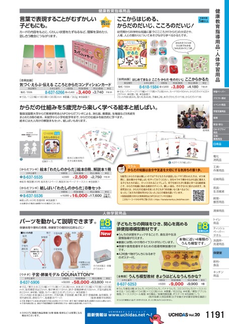 健康教育指導用品・人体学習用品学習ペーパークラフト・素材イベント用品学習支援用品保育安全・安心OA・サプライ用品文具・事務用品日用品電化化消耗品耗工具・具・作業用品業収納用品納雨具・具・生活雑貨活飼育・育・園芸用品芸清掃用品掃トイレレ用品品ティッシュティッシュペーパー・パタオルル洗面所・洗面所・洗濯用品濯保健室飲料・料・食品食品キッチンキッチン用品品健康教育指導用品言葉で表現することがむずかしい子どもにも。カードの内容をもとに、くわしい状態をたずねるなど、理解を深めたり、話し合う機会につながります。ここからはじめる、からだのだいじ、こころのだいじ!幼児期から科学的な知識に基づく「こころ」や「からだ」の大切さや、人権、人との関わりについてあそびながら学べるかるたです。対象年齢5歳以上からだのつくりがひとめでわかる「からだガイド」つき。[合同出版]気づく・えらぶ・伝えるこころとからだコンディションカード商品種別型式/5506お申込番号8-637-5266M価税抜¥3,400税抜価格¥3,400税込価格¥3,740単位1セット●寸法/122(幅)×180(奥)×38(高)mm●質量/360g●包装数:1[合同出版]はじめてまなぶこころ・からだ・性のだいじここからかるた商品種別型式/5504お申込番号8-618-1584M価税抜¥3,800税抜価格¥3,800税込価格¥4,180単位1セット●寸法/パッケージ:117幅)×117奥)×75高)mm、カード:90×90mm、からだガイド:420×297mm●材質/紙●包装数:1〈セット内容〉読み札、取り札各46枚、予備札2枚、あそびかたガイド1枚、からだガイド1枚からだの仕組みを5歳児から楽しく学べる絵本と紙しばい。聖路加国際大学からだ教育研究会とNPOからだフシギによる、消化器、循環器、生殖器など8系統をまとめた8冊の絵本。未就学から小学校低学年まで、からだの仕組みを総合的に学べます。絵本には大人向けの解説本もセット。紙しばいもあります。使用例●収納ケース絵本には耐水性の丈夫な紙を使用。[からだフシギ]絵本「わたしのからだ」絵本8冊、解説本1冊お申込番号8-637-5535●●絵本・解説書:A5判絵本各12ページ、解説本36ページケース入り●包装数:1¥2,500M価税抜¥2,500税抜価格税込価格¥2,750[からだフシギ]紙しばい「わたしのからだ」8巻セットお申込番号8-637-5536●●紙しばいA3判各巻8枚●包装数:1※在庫切れの場合は納期がかかる場合がございます。M価税抜税抜価格¥16,000¥16,000¥17,600税込価格単位1セット単位1セット(8巻入)からだの知識は自分や友達を大切にする気持ちの第1歩。●A3サイズの紙しばい5歳児にからだの話は難しいのでは?子どもたちが退屈しない?そう思われた方は、ぜひ実際に、読み聞かせや紙しばいをやってみてください。目をキラキラ輝かせながら話に聞き入る子どもたちの姿に、びっくりされることでしょう。何でも知りたがり素直に学べる5歳前後こそ、からだの知識に触れる絶好のチャンス。難しい話も、その子なりに受け止めます。当研究会には、からだの仕組みを知った子どもが「好き嫌いなく食べるようになった」「友だちの頭を叩かなくなった」などの報告も届いています。※聖路加国際大学からだ教育研究会とNPOからだフシギの活動は二次元バーコードからHPをご覧ください。https://karada-kenkyu.jimdofree.comパーツを動かして説明できます。保健体育や理科の授業、保健室での個別対応時などに!■セット内容本体精子子宮内膜胎児受精卵子宮内避妊具卵子と受精卵の違いも再現しています。子宮前壁卵子※実際は土台に固定されています。[ウチダ]子宮・卵巣モデルDOUNATTONTMそのまま展示・保管ができます!お申込番号8-637-5906M価税抜¥58,000税抜価格税込価格¥58,000¥63,800単位1セット●寸法/展示土台:223(幅)×115(奥)×126高)mm、本体:約135(幅)×70奥)×40(高)mm、胎児模型:約φ25mm、精子棒:約110mm、卵子・受精卵棒:約106mm、子宮内避妊具:約22mm●材質/樹脂、カバー・展示土台:ポリスチレン●包装数:1〈セット内容〉本体(展示土台付き)、子宮内膜、子宮前壁、精子棒、卵子・受精卵棒、胎児模型、子宮内避妊具、透明カバー、指導書(8ページ)〈監修:倉敷中央病院〉※子宮・卵巣モデル本体は非妊時の子宮とほぼ同じサイズですが、卵子・精子・受精卵・胎児は実際の大きさとは異なります。※子宮内避妊具とは、避妊や月経困難症の治療を目的とする一般的な器具を模したものです。人体学習用品子どもたちの興味をひき、関心を高める排便指導模型教材です。●うんちの状態をチェックすることで、食生活や生活習慣指導が行えます。●裏面には問いかけ用のイラストが付いています。●保健や食育指導をするための指導用解説書付きです。●A2判食べ物がうんちになるまでのポスター付。本物に近い4種類のうんち模型です。[全教図]うんち模型教材きょうはどんなうんちかな?お申込番号8-637-5253M価税抜¥9,000税抜価格¥9,000税込価格¥9,900単位1個●うんち模型4種:水うんち、ドロドロうんち、バナナうんち、コロコロうんち(ケース入り)●寸法/345(幅)×134(奥)×132(高)mm●質量/約500g●材質/模型: