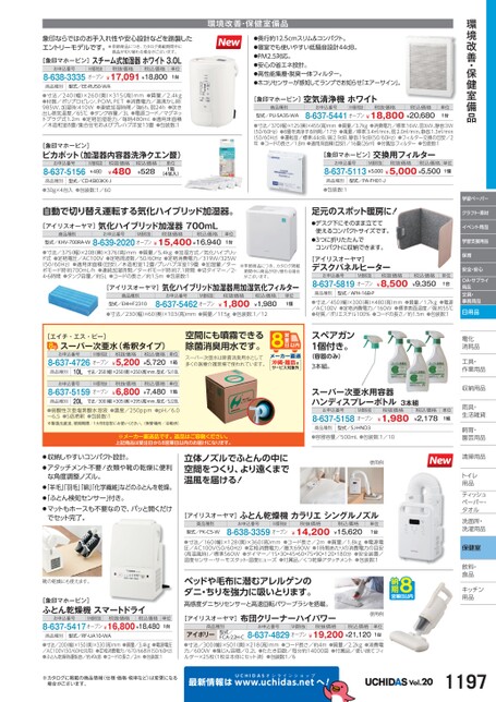 環境改善・保健室備品学習ペーパークラフト・素材イベント用品学習支援用品保育安全・安心OA・サプライ用品文具・事務用品日用品電化化消耗品耗工具・具・作業用品業収納用品納雨具・具・生活雑貨活飼育・育・園芸用品芸清掃用品掃トイレレ用品品ティッシュティッシュペーパー・パタオルル洗面所・洗面所・洗濯用品濯保健室飲料・料・食品食品キッチンキッチン用品品[エイチ・エス・ピー]スーパー次亜水(希釈タイプ)お申込番号M価税抜8-637-4726オープン税抜価格¥5,200税込価格¥5,720単位1箱商品種別10L寸法/250幅)×250奥)×250(高)mm、型式/SJ10L空間にも噴霧できる除菌消臭用水です。スーパー次亜水は除菌消臭用水として多くの医療介護現場で使われています。スペアガン1個付き。(容器のみ)3本組。沖縄・離島はサービス対象外お申込番号M価税抜8-637-5159オープン税抜価格¥6,800税込価格¥7,480単位1箱20L商品種別寸法/300幅)×305奥)×295(高)mm、型式/SJ20L●弱酸性次亜塩素酸水溶液●濃度/250ppm●pH/6.0〜6.5●5倍希釈●包装数:1※製造元直送、使用期限/1カ月を目安にお使いください。(保管場所/冷暗所)※メーカー直送品です。返品はご容赦ください。上記商品は受注日から8営業日以内のお届けになります。スーパー次亜水用容器ハンディスプレーボトル3本組お申込番号M価税抜8-637-5158オープン税抜価格¥1,980税込価格¥2,178単位1組商品種別型式/SJ-HND3●容器容量/500mL●包装数:1/10使用例●収納しやすいコンパクト設計。●アタッチメント不要!衣類や靴の乾燥に便利な角度調整ノズル。●「羊毛」「羽毛」綿」「化学繊維」などのふとんを乾燥。「ふとん検知センサー」付き。●マットもホースも不要なので、パッと開くだけ●でセット完了。靴の乾燥にも使えます。[象印マホービン]ふとん乾燥機スマートドライお申込番号8-637-5417オープン¥16,800¥18,480M価税抜税抜価格税込価格単位1台商品種別型式/RF-UA10-WA●寸法/200(幅)×150(奥)×330(高)mm●質量/3.4kg●電源電圧/AC100V(50/60Hz共用)●定格消費電力/670/668W(50/60Hz)●ふとん乾燥時運転音/約49dB●コードの長さ/2m●包装数:1立体ノズルでふとんの中に空間をつくり、より遠くまで温風を届ける![アイリスオーヤマ]商品種別型式/FK-C5-Wふとん乾燥機カラリエシングルノズルお申込番号M価税抜8-638-3359オープン税抜価格¥14,200税込価格¥15,620単位1台●寸法/160(幅)×128奥)×360(高)mm●コード長さ/2m●質量/1.8kg●電源電圧/AC100V(50/60Hz)●定格消費電力/最大690W●1時間あたりの消費電力の目安(高温風時)/標準560W●タイマー/15•30•45•60•75•90•120•180分●安全装置/温度センサー・サーモスタット・温度ヒューズ●付属品/くつ乾燥アタッチメント●包装数:1ベッドや毛布に潜むアレルゲンのダニ・ちりを強力に吸いとります。高感度ダニちりセンサーと高速回転パワーブラシを搭載。[アイリスオーヤマ]布団クリーナーハイパワー商品種別お申込番号M価税抜税抜価格税込価格型式/FCA-22H-C8-637-4829オープン¥19,200¥21,120アイボリー●寸法/300(幅)×501(奥)×218(高)mm●コード長さ/約4m●質量/2.2kg●消費電力/600W●集じん容積/0.2L●たたき回数/毎分約14000回●付属品/使い捨てフィルター×25枚(1枚は本体にセット済)●包装数:1/6使用例単位1台※カタログに掲載の商品情報(仕様・価格・税率など)は変更になる場合がございます。最新情報はUCHIDASww.uchidas.netwへ!Vol.201197象印ならではのお手入れ性や安心設計などを踏襲したエントリーモデルです。[象印マホービン]スチーム式加湿器ホワイト3.0L※季節商品につき、カタログ掲載期間中に商品が切り替わる場合がございます。お申込番号8-638-3335オープン¥17,091¥18,800M価税抜税抜価格税込価格単位1台商品種別型式/EE-RU50-WA●寸法/240(幅)×260(奥)×315(高)mm●質量/2.4kg●材質/ポリプロピレン、POM、PET●消費電力/湯沸かし時:985W、加湿時:410W●連続加湿時間/強6h、弱24h●吹き出し蒸気温度/65℃●タンク容量/3L●電源コード/マグネットプラグ式1.2m●定格加湿能力/毎時480ml●適用床面積/木造和室8畳/集合住宅およびプレハブ洋室13畳●包装数:1[象印マホービン]ピカポット(加湿器内容器洗浄クエン酸)お申込番号8-637-5156M価税抜¥480税抜価格¥480税込価格¥528単位1箱(4包入)商品種別型式/CD-KB03KX-J●30g×4包入●包装数:1/60自動で切り替え運転する気化ハイブリッド加湿器。[アイリスオーヤマ]気化ハイブリッド加湿器700mL商品種別型式/KHV-700RA-W8-639-2020オープン¥15,400¥16,940お申込番号M価税抜税抜価格税込価格単位1台●寸法/375(幅)×208奥)×376(高)mm●質量/5.4kg●加湿方式/気化ハイブリッド式●定格電圧/AC100V●定格周波数/50/60Hz●定格消費電力/319W/325W(50/60Hz)●適用床面積(目安)/木造和室12畳/プレハブ洋室19畳●加湿量/ターボモード時:約700mL/h●連続加湿時間/ターボモード時:約7.1時間●切タイマー/2・4・6時間●タンク容量/約5L●コードの長さ/約1.5m●包装数:1※季節商品につき、カタログ掲載期間中に商品が切り替わる場合がございます。[アイリスオーヤマ]気化ハイブリッド加湿器用加湿気化フィルター商品種別型式/EHH-F2310お申込番号M