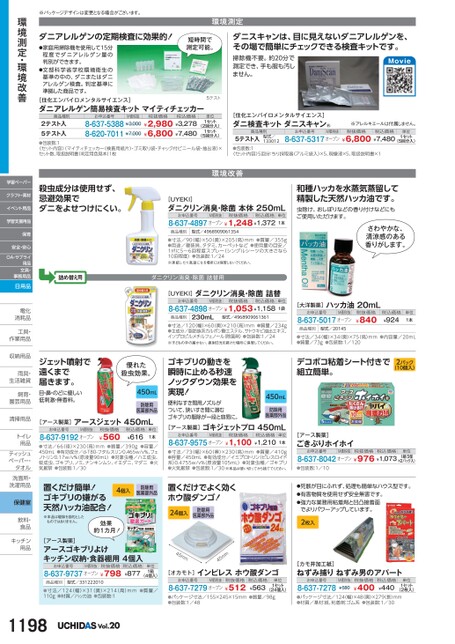 ※パッケージデザインは変更となる場合がございます。ダニアレルゲンの定期検査に効果的!●家庭用掃除機を使用して15分程度でダニアレルゲン量の判別ができます。●文部科学省学校環境衛生の基準の中の、ダニまたはダニアレルゲン検査。判定基準に準拠した商品です。5テスト[住化エンバイロメンタルサイエンス]ダニアレルゲン簡易検査キットマイティチェッカー商品種別お申込番号M価税抜税抜価格税込価格単位8-637-5388¥3,000¥2,980¥3,2788-620-7011¥7,000¥6,800¥7,4802テスト入5テスト入●包装数:1セット内容(マイティチェッカー(検査用紙片)・ゴミ取り袋・チャック付ビニール袋・抽出液)×セット数、取扱説明書(判定用色見本)1枚(2回分入)(5回分入)1セット1セット環境測定短時間で測定可能。ダニスキャンは、目に見えないダニアレルゲンを、その場で簡単にチェックできる検査キットです。掃除機不要。約20分で測定でき、手も服も汚しません。Movie[住化エンバイロメンタルサイエンス]ダニ検査キットダニスキャン®※アレルキエールは付属しません。商品種別お申込番号M価税抜税抜価格税込価格単位型式/1330125テスト入●包装数:1〈セット内容〉5回分:ちり採取器(アルミ袋入)×5、現像液×5、取扱説明書×18-637-5317オープン¥6,800¥7,4801セット(5回分入)殺虫成分は使用せず、忌避効果でダニをよせつけにくい。環境改善[UYEKI]ダニクリン消臭・除菌本体250mLお申込番号M価税抜税抜価格税込価格8-637-4897オープン¥1,248¥1,372単位1本商品種別型式/4968909061354●寸法/90(幅)×50(奥)×205(高)mm●質量/355g●用途/寝装具、タタミ、カーペットなど●使用量の目安/1㎡に5〜6回程度スプレー(シングルシーツの大きさなら10回程度)●包装数:1/24※凍結したり高温になる場所には保管しないでください。詰め替え用ダニクリン消臭・除菌詰替用和種ハッカを水蒸気蒸留して精製した天然ハッカ油です。虫除け、おしぼりなどの香り付けなどにもご使用いただけます。さわやかな、清涼感のある香りがします。環境測定・環境改善学習ペーパークラフト・素材イベント用品学習支援用品保育安全・安心OA・サプライ用品文具・事務用品日用品電化電化消耗品消耗品工具・工具作業用品作業用収納用品収納用雨具・雨具生活雑貨生活雑飼育・飼育園芸用品園芸用清掃用品清掃用トイレトイ用品用品ティッシュティッシュペーパー・タオルタオル洗面所・洗面所・洗濯用品洗濯用保健室飲料・飲料食品食品キッチンキッチン用品用品[UYEKI]ダニクリン消臭・除菌詰替お申込番号M価税抜税抜価格税込価格8-637-4898オープン¥1,053¥1,158単位1袋商品種別230mL型式/4968909061361●寸法/120(幅)×60奥)×210高)mm●質量/234g●主成分/脂肪族系カルボン酸エステル、サトウキビ抽出エキス、イソプロピルメチルフェノール(除菌剤)●包装数:1/24※子どもの手の届かない、直射日光を避けた場所に保管してください。ゴキブリの動きを瞬時に止める秒速ノックダウン効果を実現!450mL便利なすき間用ノズルがついて、狭いすき間に潜む医薬部外品ゴキブリの駆除が一段と容易に。[アース製薬]ゴキジェットプロ450mL防除用お申込番号8-637-9575オープンM価税抜税抜価格税込価格¥1,100¥1,210単位1本●寸法/73(幅)×60(奥)×230(高)mm●質量/410g●容量/450mL●有効成分/イミプロトリン(ピレスロイド系)0.4755w/v%(原液量105mL)●対象虫種/ゴキブリ●火気厳禁●包装数:1/30※本品は使い切ってから捨ててください。置くだけでよく効くホウ酸ダンゴ!24個入防除用医薬部外品45mmmm45[オカモト]インピレスホウ酸ダンゴお申込番号M価税抜税抜価格8-637-7279オープン¥512税込価格¥563単位1セット(24個入)[大洋製薬]ハッカ油20mLお申込番号M価税抜8-637-5017オープン税抜価格¥840税込価格¥924単位1本商品種別型式/20145●寸法/34(幅)×34(奥)×75(高)mm●内容量/20mL●質量/73g●包装数:1/120デコボコ粘着シート付きで組立簡単。2パック(10個入)[アース製薬]ごきぶりホイホイお申込番号M価税抜税抜価格税込価格8-637-8042オープン¥976¥1,073単位1組(5個×2パック入)●包装数:1/10●死骸が目にふれず、処理も簡単なハウス型です。●有害物質を使用せず安全無害です。●強力な業務用粘着剤と凹凸接着面でよりパワーアップしています。2枚入[カモ井加工紙]ねずみ捕りねずみ男のアパートお申込番号8-637-7278M価税抜¥580税抜価格¥400税込価格¥440単位1セット(2枚入)●パッケージ寸法/155×245×15mm●質量/98g●包装数:1/48●パッケージ寸法/124幅)×48奥)×279長)mm●材質/基材:紙、粘着剤:ゴム系●包装数:1/30ジェット噴射で遠くまで届きます。目・鼻・のどに優しい低刺激・無香料。優れた殺虫効果。450mL防除用医薬部外品[アース製薬]アースジェット450mLお申込番号M価税抜8-637-9192オープン税抜価格¥560税込価格¥616単位1本●寸法/66(径)×230(高)mm●質量/390g●容量/450mL●有効成分/d-T80-フタルスリン0.465w/v%、フェノトリン0.17w/v%(原液量90mL)●対象虫種/ハエ成虫、蚊成虫、ゴキブリ、ノミ、ナンキンムシ、イエダニ、マダニ●火気厳禁●包装数:1/304個入防除用医薬部外品置くだけ簡単!ゴキブリの