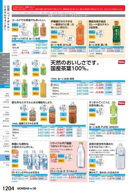【ご注意ください】茶葉について世界的なお茶(抹茶)ブームに伴い、茶葉の高騰と供給不安定が予想されており、掲載商品の取り扱い中止、価格・仕様変更の可能性がございます。あらかじめご承知おきください。※パッケージデザインは変更になる場合があります。※飲料・食品類は、お客様の都合による返品はお受けできません。お茶(ペットボトル)・ミネラルウォーターコールドでも常温でもおいしい。345mL24本入1本あたり140円電子レンジで温められるペットボトル![伊藤園]小型ペットボトルお〜いお茶緑茶ほうじ茶24本入伊藤園だからできる『一番茶ほうじ茶』のおいしい所だけ。600mL1本あたり145円一番茶100%。[伊藤園]お〜いお茶ほうじ茶機能性表示食品ガレート型カテキン2倍含有。600mL1本あたり145円24本入[伊藤園]お〜いお茶濃い茶軽減税率対象品商品種別お申込番号8-637-64478-637-6448単位1ケース(24本入)税抜価格¥3,115税込価格¥3,3641本あたり137円280mL12本入1本あたり145円600mL24本入緑茶ほうじ茶M価税抜¥4,440●包装数:11本あたり116円195mL30本入1本あたり145円600mL24本入お申込番号軽減税率対象品税抜価格M価税抜税込価格8-637-6437¥4,800¥3,236¥3,494単位1ケース(24本入)お申込番号軽減税率対象品税抜価格M価税抜税込価格8-637-6449¥4,800¥3,236¥3,494単位1ケース(24本入)600mL商品種別●包装数:1600mL商品種別●包装数:1天然のおいしさです。国産茶葉100%。[伊藤園]お〜いお茶緑茶商品種別195mL280mL600mL600mL(ラベルレス)●包装数:1軽減税率対象品お申込番号8-638-70578-637-63368-637-64368-637-6462M価税抜¥3,800¥2,040¥4,800税抜価格¥3,240¥1,525¥3,236税込価格¥3,499¥1,647¥3,494単位1ケース(30本入)1ケース(12本入)1ケース(24本入)1ケース(24本入)夏も冬もミネラルと水分補給をしよう。1本あたり128円1本あたり129円280mL24本入650mL24本入[伊藤園]健康ミネラルむぎ茶軽減税率対象品お申込番号8-637-64198-637-62828-637-6040M価税抜¥4,080¥4,080¥2,5801本あたり252円2L6本入税抜価格¥2,847¥2,867¥1,400税込価格¥3,074¥3,096¥1,512単位1ケース(24本入)1ケース(24本入)1ケース(6本入)すっきり・ごくごくとお茶を楽しむ。600mL1本あたり131円24本入[伊藤園]お〜いお茶PUREGREENお申込番号軽減税率対象品税抜価格M価税抜税込価格8-638-7056¥4,320¥2,912¥3,144600mL商品種別●包装数:1品質の安全性を高めたミネラルウォーター。●2種類のフィルターを使用し、天然水にさらに磨きをかけています。●天然水由来の良質ミネラルを含む、おいしい軟水です。2L6本入1本あたり283円単位1ケース(24本入)単位1ケース(6本入)商品種別280mL650mL2L●包装数:1移動にも便利な小型のスリムボトル。沖縄・離島はサービス対象外310mL30本入リサイクルPET樹脂100%×ラベルレス!SDGsをテーマにした授業にもオススメです。560mL24本入1本あたり159円沖縄・離島はサービス対象外[キリンビバレッジ]キリンのやわらか天然水お申込番号軽減税率対象品税抜価格M価税抜税込価格8-637-6216¥4,200¥3,550¥3,834単位1ケース(30本入)●包装数:11204Vol.20[コカ・コーラ]い・ろ・は・すラベルレスお申込番号軽減税率対象品税抜価格M価税抜税込価格8-637-6402¥4,320¥3,534¥3,816単位1ケース(24本入)●包装数:1[伊藤園]磨かれて、澄みきった日本の水お申込番号軽減税率対象品税抜価格M価税抜税込価格8-637-6191¥2,100¥1,574¥1,699●包装数:1お茶(ペットボトル)・ミネラルウォーター学習ペーパークラフト・素材イベント用品学習支援用品保育安全・安心OA・サプライ用品文具・事務用品日用品電化電化消耗品消耗品工具・工具作業用品作業用収納用品収納用雨具・雨具生活雑貨生活雑飼育・飼育園芸用品園芸用清掃用品清掃用トイレトイ用品用品ティッシュティッシュペーパー・タオルタオル洗面所・洗面所・洗濯用品洗濯用保健室保健室飲料・食品キッチンキッチン用品用品