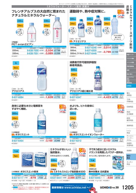 ミネラルウォーター・スポーツ飲料・炭酸水学習ペーパークラフト・素材イベント用品学習支援用品保育安全・安心OA・サプライ用品文具・事務用品日用品電化化消耗品耗工具・具・作業用品業収納用品納雨具・具・生活雑貨活飼育・育・園芸用品芸清掃用品掃トイレレ用品品ティッシュティッシュペーパー・パタオルル洗面所・洗面所・洗濯用品濯保健室保健室飲料・食品キッチンキッチン用品品単位1ケース(24本入)沖縄・離島はサービス対象外※パッケージデザインは変更になる場合があります。※飲料・食品類は、お客様の都合による返品はお受けできません。ミネラルウォーター・スポーツ飲料・炭酸水フレンチアルプスの大自然に育まれたナチュラルミネラルウォーター。220mL24本入1本あたり114円330mL24本入1本あたり139円運動時や、熱中症対策に。300mL24本入1本あたり135円500mL24本入1本あたり170円500mL24本入1本あたり170円沖縄・離島はサービス対象外[伊藤園]PETevianエビアン軽減税率対象品お申込番号8-638-70008-638-7001M価税抜¥2,760¥3,360税抜価格税込価格単位¥2,534¥2,736¥3,089¥3,3361ケース(24本入)軽減税率対象品商品種別お申込番号8-637-6348300mL8-637-6205500mL500mL(ラベルレス)8-637-6446M価税抜¥3,960¥4,800税抜価格税込価格単位¥3,014¥3,255¥3,799¥4,1021ケース(24本入)[コカ・コーラ]アクエリアスゴミの分別が楽になるラベルレス。●包装数:1消費者庁許可個別評価型病者用食品。500mL24本入1本あたり199円[コカ・コーラ]アクエリアス経口補水液軽減税率対象品M価税抜税抜価格¥2,640¥1,639¥1,770税込価格単位1ケース(6本入)お申込番号8-637-6347●包装数:1軽減税率対象品M価税抜税抜価格¥5,424¥4,423¥4,776税込価格商品種別220mL330mL●包装数:12L6本入1本あたり295円[コカ・コーラ]アクエリアスお申込番号8-637-6084●包装数:124本入1本あたり139.5円[大塚製薬]ポカリスエットお申込番号8-637-6454●包装数:11L用5袋入身体に必要な水分と電解質をすばやく補給。300mL水よりも、ヒトの身体に近い水。300mL沖縄・離島はサービス対象外24本入1本あたり139.5円軽減税率対象品M価税抜¥3,120税抜価格¥3,100税込価格¥3,348単位1ケース(24本入)お申込番号8-637-6312●包装数:1M価税抜¥3,120税抜価格¥3,100税込価格¥3,348単位1ケース(24本入)[大塚製薬]ポカリスエットイオンウォーター軽減税率対象品ミネラルがおいしい強炭酸水。天然水由来のシリカ含有。汗で失う成分に近いミネラルバランスを再現したパウダー飲料水。水1Lに対し1袋を溶かします。沖縄・離島はサービス対象外500mL24本入1本あたり115円1L用5袋入[大塚製薬]ポカリスエット粉末お申込番号8-637-6117M価税抜¥700軽減税率対象品税抜価格¥679[伊藤園]ミネラルストロング強炭酸水500軽減税率対象品税込価格¥733単位1箱(5袋入)お申込番号M価税抜8-637-6441¥3,360税抜価格税込価格¥2,566¥2,771単位1ケース(24本入)[赤穂化成]熱中対策水日向夏味お申込番号軽減税率対象品税抜価格M価税抜8-637-6445オープン¥530税込価格¥572単位1箱(5袋入)●内容量/74g×5袋入●包装数:1/20●ガスボリューム:4.5●包装数:1●内容量/41g×5袋入●包装数:1※カタログに掲載の商品情報(仕様・価格・税率など)は変更になる場合がございます。※のオビがついている商品は、軽減税率の対象品となりますので消費税率8%として表示しております。最新情報はUCHIDASww.uchidas.netwへ!Vol.201205