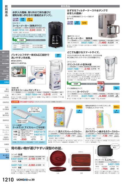 お手入れ簡単、取り外せて持ち運びに便利な取っ手付きの「着脱式水タンク」。コード長約1.4m容量.6L14杯〜12杯用[タイガー]コーヒーメーカー(耐熱ガラス)お申込番号8-637-7216¥10,800¥8,640¥9,504M価税抜税抜価格税込価格単位1台商品種別型式/ACJ-B120●寸法/本体(約):225(幅)×214(奥)×378高)mm●質量/本体:約2.6kg●電源/100V(50/60Hz)●消費電力/680W●包装数:1/4交換用ガラスサーバーACJ-B120交換用ガラスサーバーフタなしフタ付※納期8営業日以内8-637-72208-637-7251¥2,310税込価格)¥2,420税込価格)パッキンとフタが一体式&広口設計で洗いやすい冷水筒。容量2.1L●熱湯も使用可。●横向きでも使用可能。飲料用品はずせるフィルターケースや水タンクでお手入れ簡単!レバー式濃度調節でコーヒーの濃さが選べます。コード長約1.3m容量810mL6杯用[象印マホービン]コーヒーメーカー珈琲通商品種別型式/EC-MA60-TZお申込番号M価税抜8-637-7586オープン税抜価格¥7,480税込価格¥8,228単位1台●寸法/230(幅)×155(奥)×280(高)mm●質量/1.7kg●消費電力/650W●包装数:1/8どこでも置けるスマートサイズ。子どもでも持ちやすい取っ手付きで、さまざまな場所に収納しやすいスマートサイズの中容量モデル。[クリンスイ]クリンスイポット型浄水器お申込番号8-637-7588オープン¥3,162¥3,478M価税抜税抜価格税込価格単位1個商品種別型式/CP503-GR●寸法/108(幅)×186(奥)×267(高)mm●質量/500g●ろ材の取替時期の目安/3カ月(1日2L使用した場合)●除去物質17+2●ろ材の種類/中空糸膜(ポリエチレン)、セラミック、活性炭●ろ過流量/0.10L/分●ろ過水容量/1.1L●食洗機の使用/不可●包装数:1交換用カートリッジ[岩崎工業]タテヨコ・シームレスピッチャー商品種別型式/K-1286Wお申込番号M価税抜8-637-7554¥1,495税抜価格¥1,010税込価格¥1,111単位1個●寸法/152(幅)×103(奥)×305高)mm●質量/386g●電子レンジの使用/不可●食洗機の使用/不可●包装数:1/24P.1207・1212レギュラーコーヒーとフィルターを掲載しております。14個取スタンダードなキューブ型、氷が14個できます。つぶ氷細かなつぶ氷が48個できます。17+2物質除去タイプ。[クリンスイ]カートリッジ商品種別型式/CPC5WNWお申込番号M価税抜8-637-7589オープン2個入税抜価格¥4,480税込価格¥4,928単位1箱(2個入)●寸法/45(幅)×45(奥)×173(高)mm●質量/100g●包装数:1植物由来原料のバイオポリエチレンを10%配合したストローです。100本入径4mm60本入径6mm[パール金属]クールランドアイストレー(フタ付き)商品種別寸法/90幅)×265奥)×45(高)mm、質量/110g、型式/H-523714個取つぶ氷寸法/90幅)×265奥)×35(高)mm、質量/130g、型式/H-5238お申込番号8-637-61768-637-6177M価税抜¥300税抜価格¥250税込価格¥275単位1個●材質/ポリプロピレン●耐冷温度/ー20℃●包装数:1[サンナップ]袋入りストレートストローお申込番号M価税抜税抜価格税込価格単位8-637-6104オープン¥138¥1511パック(100本入)商品種別型式/S-100WN[サンナップ]カトラグリーン曲がるカラーストローお申込番号M価税抜税抜価格税込価格単位8-637-7557オープン¥138¥1511パック(60本入)商品種別型式/CTG-S60●寸法/4(径)×180(長)mm●じゃばらなし●色/ホワイト●材質/ポリプロピレン●個装有り●包装数:1/10●寸法/6径)×210(長)mm●材質/ポリプロピレン・ポリエチレン●包装数:1/10飲料用品学習ペーパークラフト・素材イベント用品学習支援用品保育安全・安心OA・サプライ用品文具・事務用品日用品電化電化消耗品消耗品工具・工具作業用品作業用収納用品収納用雨具・雨具生活雑貨生活雑飼育・飼育園芸用品園芸用清掃用品清掃用トイレトイ用品用品ティッシュティッシュペーパー・タオルタオル洗面所・洗面所・洗濯用品洗濯用保健室保健室飲料・飲料食品食品キッチン用品270mm[サンナップ]ミニトレー商品種別型式/MT-NSBKお申込番号8-637-7320税抜価格¥764M価税抜オープン●寸法/270(幅)×200(奥)×17(高)mm●材質/ABS樹脂●色/黒●包装数:1/30税込価格¥840単位1枚ノンスリップ加工。200mm420mm270mm300mm単位1枚税抜価格税込価格¥2,180¥2,398[イシダ]お盆お申込番号M価税抜8-637-6229¥2,200商品種別丸盆8-637-7491¥2,400¥2,360¥2,5961枚商品種別長盆背の高い物が運びやすい深型のお盆。●寸法/丸盆:300(径)×40(高)mm、長盆:420(幅)×270(奥)×40(高)mm●質量/丸盆:430g、長盆:666g●材質/ユリア樹脂、ウレタン塗装●包装数:1丸盆長盆1210Vol.20