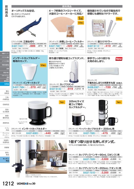 飲料用品4〜7杯用のファミリーサイズ。大型のコーヒーメーカーに対応!個包装されているので衛生的で保管にも便利なマドラーです。4〜7杯用100枚入100本入オーソドックスな缶切。使い方がシンプルなのでだれでも使えます。飲料用品[プリンス工業]三徳缶切りお申込番号M価税抜8-637-7441オープン税抜価格¥886税込価格¥974単位1個[サンナップ]未晒しコーヒーフィルターお申込番号M価税抜8-637-7567オープン税抜価格¥320税込価格¥352単位1袋(100枚入)商品種別型式/15023082商品種別4〜7杯用型式/TR-CF103M●寸法/20(幅)×127(奥)×20(高)mm●質量/48g●包装数:1/12●材質/バージンパルプ100%●包装数:1/80インサートカップホルダー専用のカップ。持ち運び便利な紙コップスタンド。50個入載せるだけなので直径80mmサイズまでいろいろな紙コップでご使用いただけます。[サンナップ]袋入りマドラーお申込番号M価税抜8-637-6112オープン税抜価格¥410税込価格¥451単位1袋(100本入)商品種別型式/MD-100G●寸法/130mm●材質/ポリスチレン●包装数:1/5厚手でしっかり拭ける大判のおしぼり。[サンナップ]インサートカップお申込番号M価税抜税抜価格8-637-7584オープン¥370税込価格¥407単位1パック(50個入)商品種別型式/IC-50C●寸法/80(口径)×77(高)mm●容量/210mL●材質/ポリスチレン●耐熱温度/80℃●耐冷温度/-10℃●包装数:1/40使用例[サンナップ]カップスタンドお申込番号M価税抜8-637-6145オープン税抜価格¥919税込価格¥1,010単位1個商品種別型式/CSD-1DB●寸法/104(径)×245(高)mm●質量/150g●材質/ABS樹脂、ステンレス●包装数:1/505個入205mLサイズ紙コップ用のカップホルダー。[サンナップ]不織布おしぼり大判厚手丸型60枚入お申込番号M価税抜8-638-2307オープン税抜価格¥720税込価格¥792単位1袋(60枚入)商品種別型式/PW60FAMN●寸法/不織布(1枚)380×265mm、パッケージ(1枚)185×45mm●質量/パッケージ含む(1枚):13g●材質/パルプPET不織布●入数/60枚●日本製●包装数:1/105個入組み合わせ例※インサートカップは別売です。組み合わせ例※紙コップは別売です。[サンナップ]商品種別型式/ICHL-5BKインサートカップホルダーお申込番号M価税抜8-637-6083オープン税抜価格¥440税込価格¥484単位1パック(5個入)[サンナップ]商品種別型式/CH-5BKペーパーカップホルダー205mL用お申込番号M価税抜8-637-7585オープン税抜価格¥475税込価格¥522単位1パック(5個入)●寸法/74(口径)×66(高)mm●材質/ポリプロピレン●包装数:1/40●寸法/74(口径)×66(高)mm●材質/ポリスチレン●包装数:1/401個ずつ取り出せる押しボタン式。マグネット付で設置が簡単。ネジ取り付けもできます。学習ペーパークラフト・素材イベント用品学習支援用品保育安全・安心OA・サプライ用品文具・事務用品日用品電化電化消耗品消耗品工具・工具作業用品作業用収納用品収納用雨具・雨具生活雑貨生活雑飼育・飼育園芸用品園芸用清掃用品清掃用トイレトイ用品用品ティッシュティッシュペーパー・タオルタオル洗面所・洗面所・洗濯用品洗濯用保健室保健室飲料・飲料食品食品キッチン用品[サンナップ]カップディスペンサー90mL(3オンス)用商品種別型式/CD-3DBお申込番号M価税抜8-637-7509オープン税抜価格¥3,000税込価格¥3,300単位1台●寸法/127幅)×135(奥)×410(高)mm●質量/320g●材質/本体・フタ:ABS樹脂、筒部分:ポリカーボネート●取り付け方法/マグネット、ネジ●カップ収納数/約50個●包装数:1/16[サンナップ]カップディスペンサー205mL(7オンス)用商品種別型式/CD-7DBお申込番号M価税抜8-637-7510オープン税抜価格¥3,200税込価格¥3,520単位1台●寸法/143(幅)×160(奥)×430(高)mm●質量/445g●材質/本体・フタ:ABS樹脂、筒部分:ポリカーボネート●取り付け方法/マグネット、ネジ●カップ収納数/約60個●包装数:1/12使用例※紙コップは別売になります。※形状の違いで同容量でも対応できないカップがあります。1212Vol.20